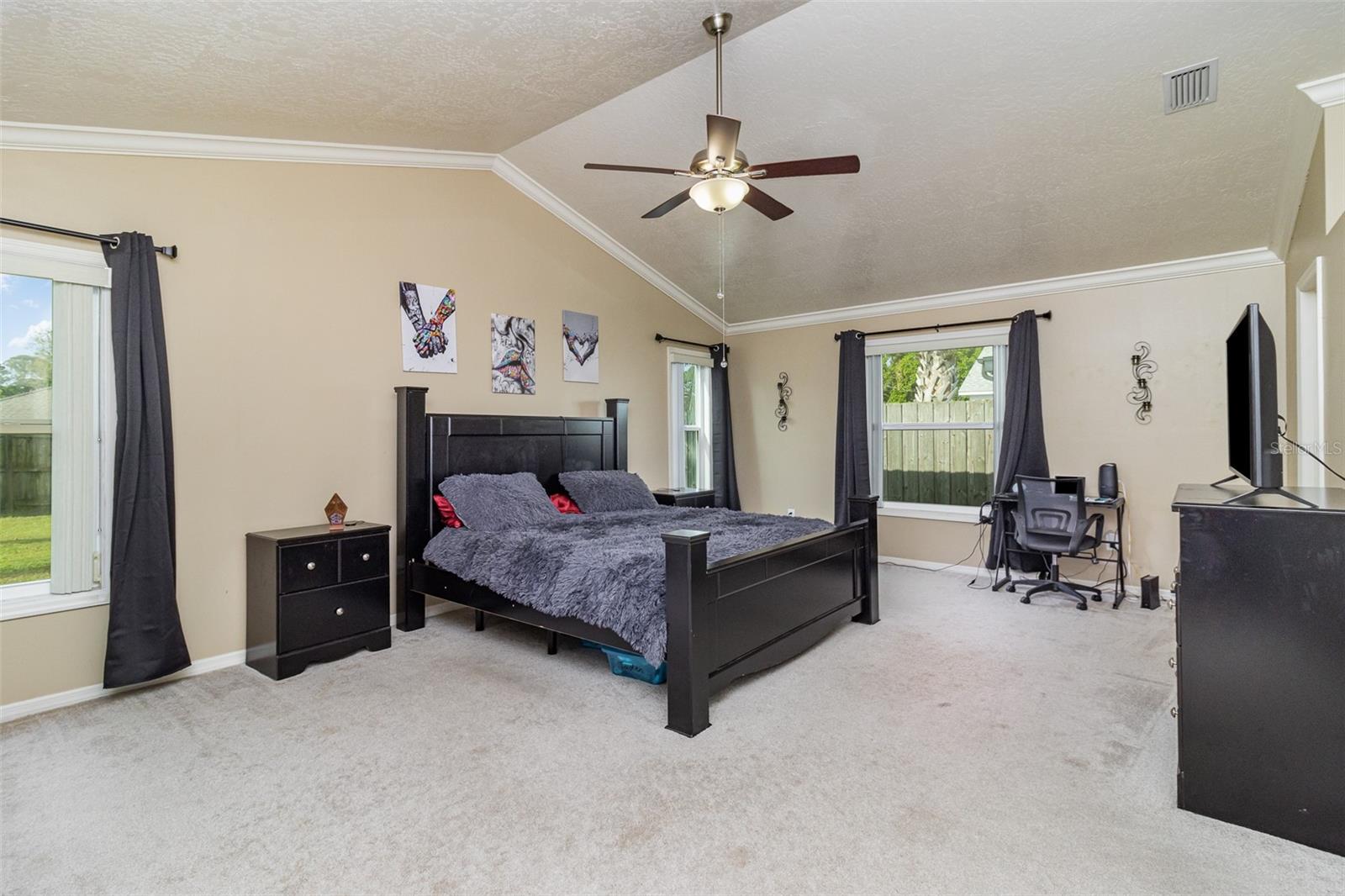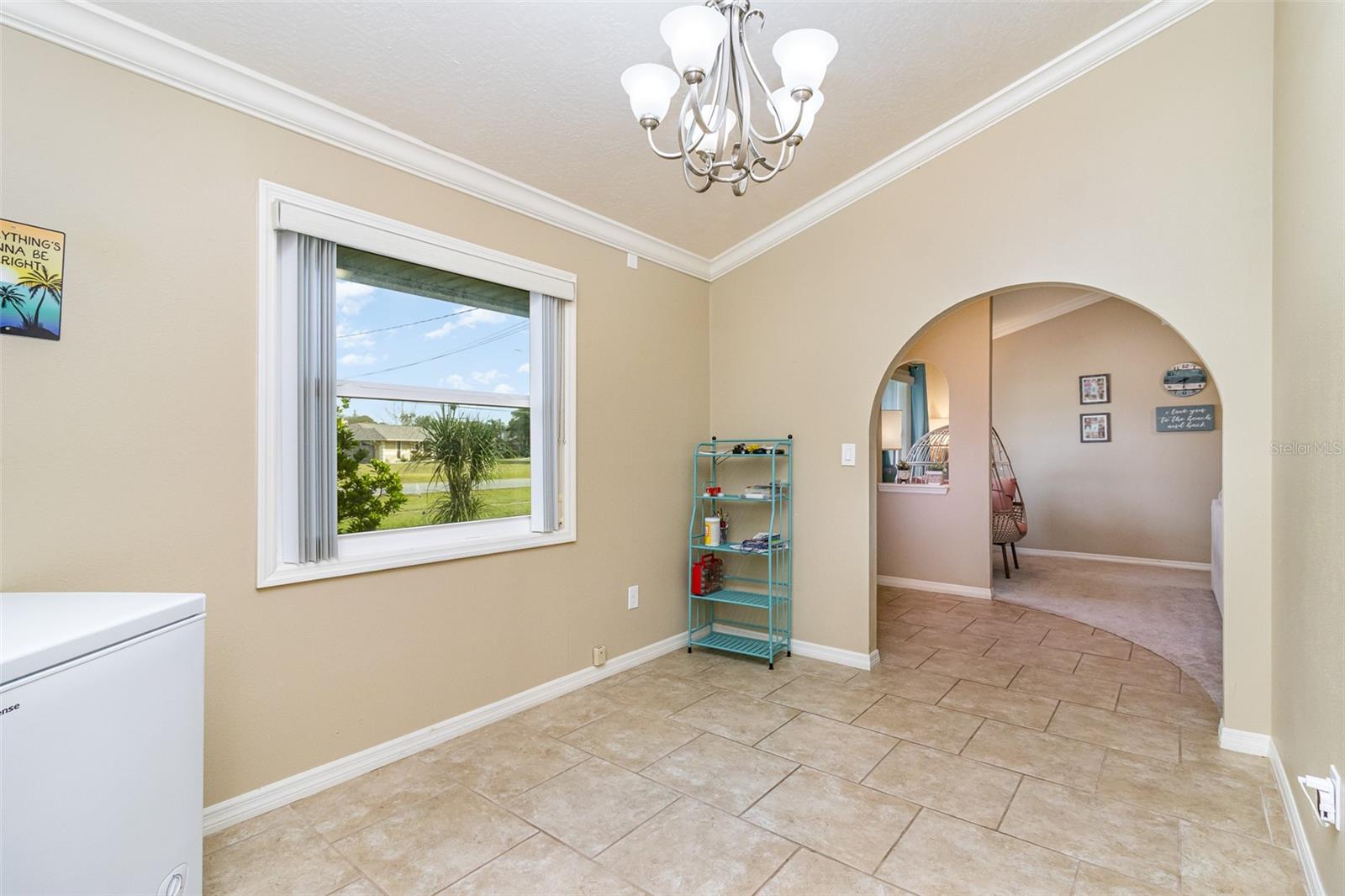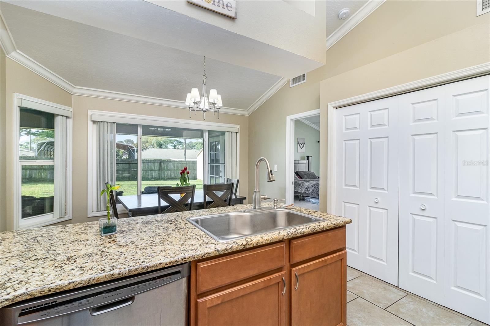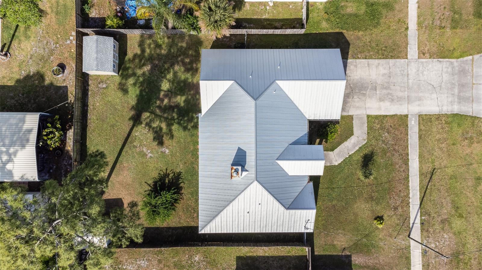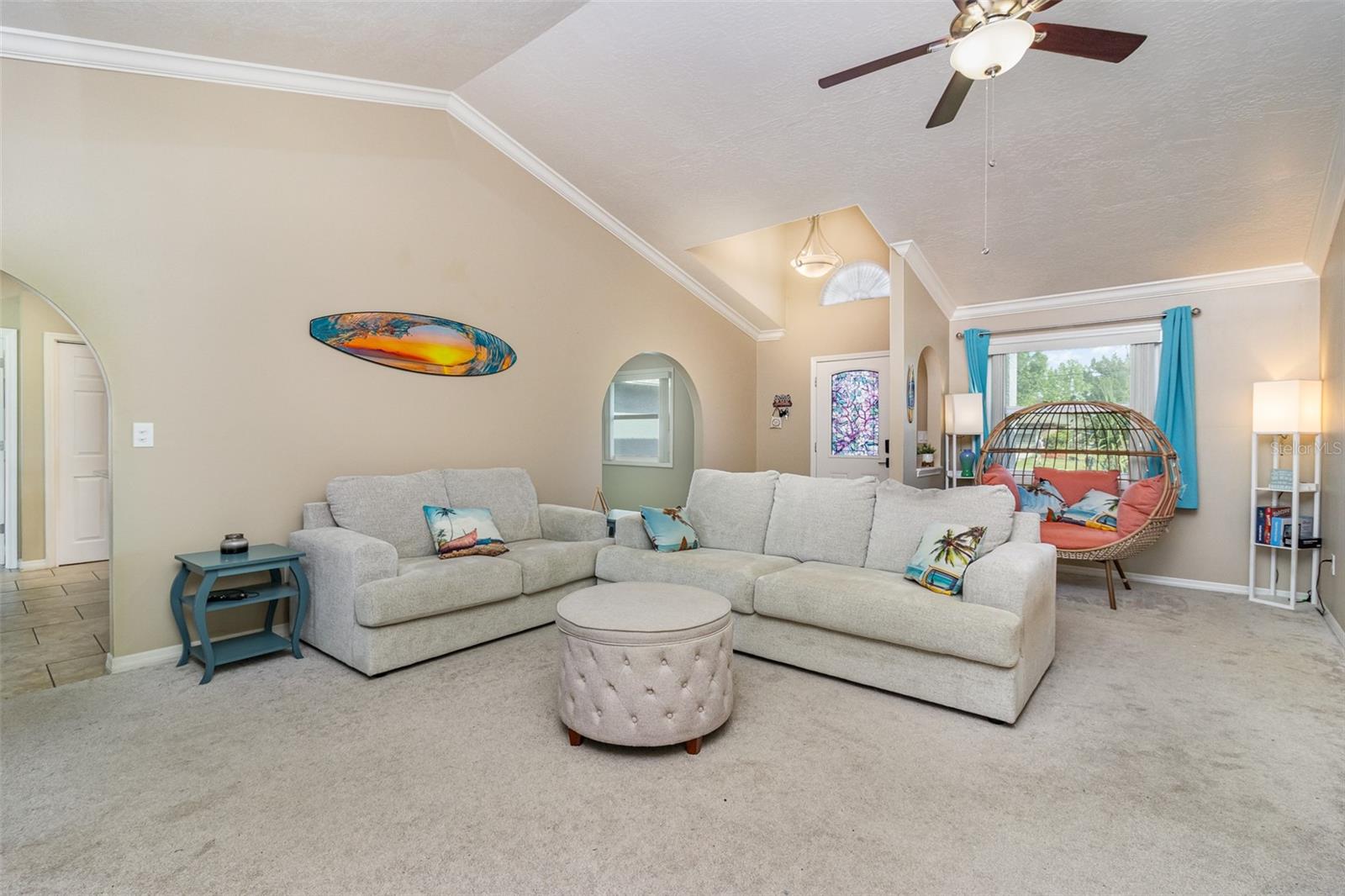 Beautiful home boasting numerous special features! Vaulted ceilings accented by crown molding welcome you into light and bright living room centered on stunning coquina stone fireplace. Architectural arches used throughout for soft modern feel. Spacious kitchen, stainless appliances, granite counters, breakfast bar & breakfast nook overlook fenced peaceful back yard. Separate formal dining for entertaining. Sprawling primary bedroom also with vaulted ceilings & private door to screen enclosed back porch. Walk-in closet & bathroom to envy! Double sinks, ample storage, Roll/Walk-in shower PLUS jetted Walk-IN tub with micro exfoliating bubbles and LED lighting. Spacious bedrooms have laminate floors in split plan for privacy, one with direct access to trussed screen porch. Metal Roof and Impact Windows! 2021 AC. Indoor Laundry Room. Central vacuum system. Added bonus of air conditioned out building. Perfect flex space for workshop/crafts, she shed/man cave! Plus Additional storage shed!