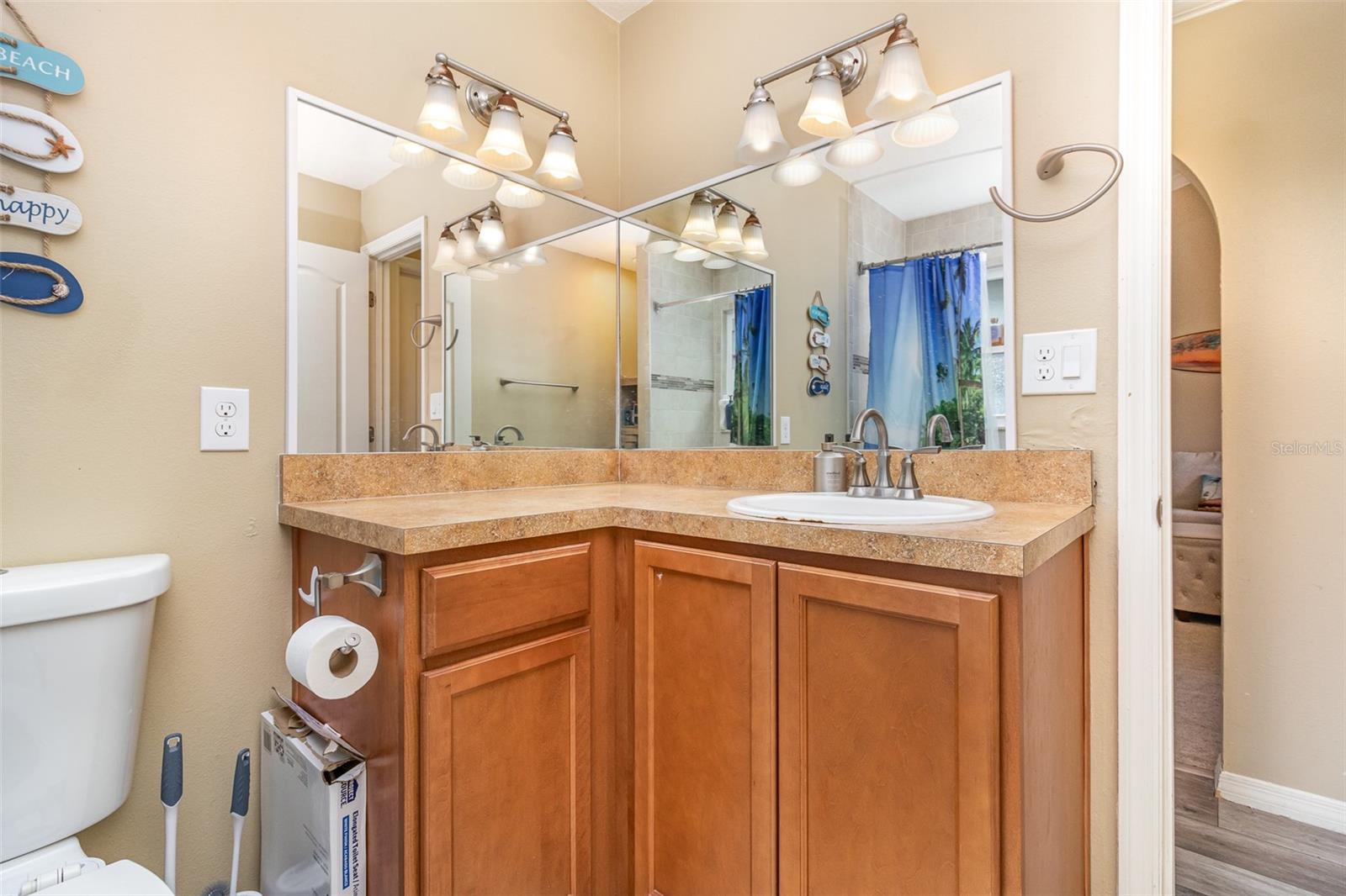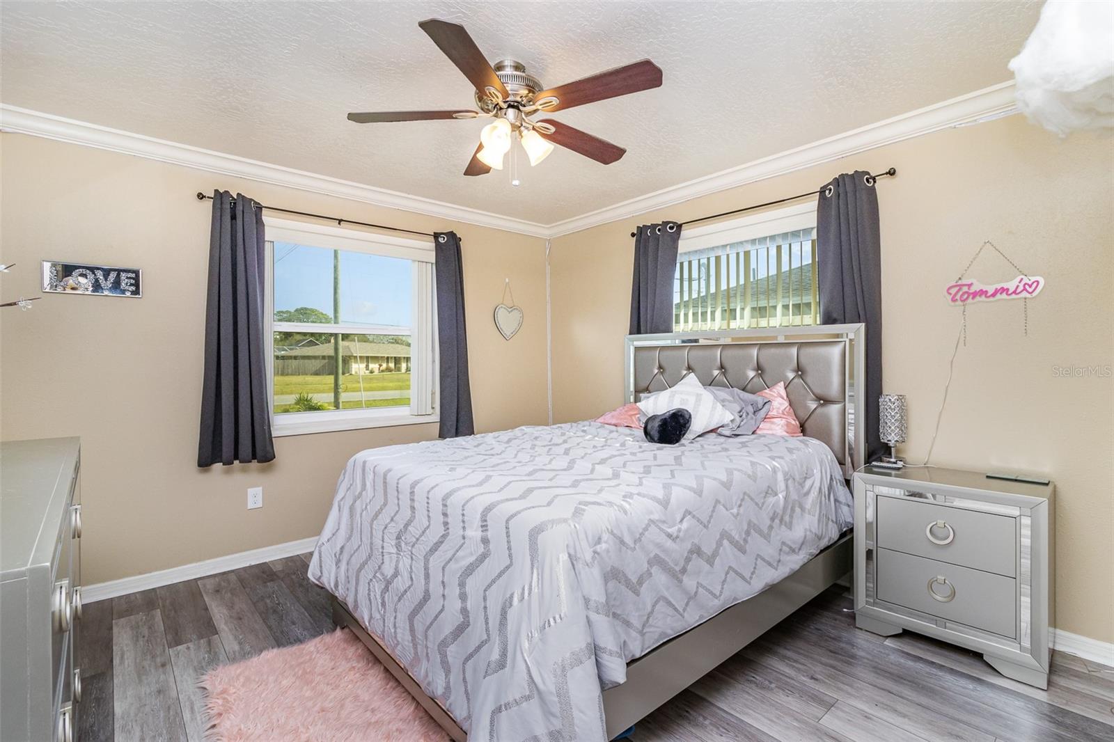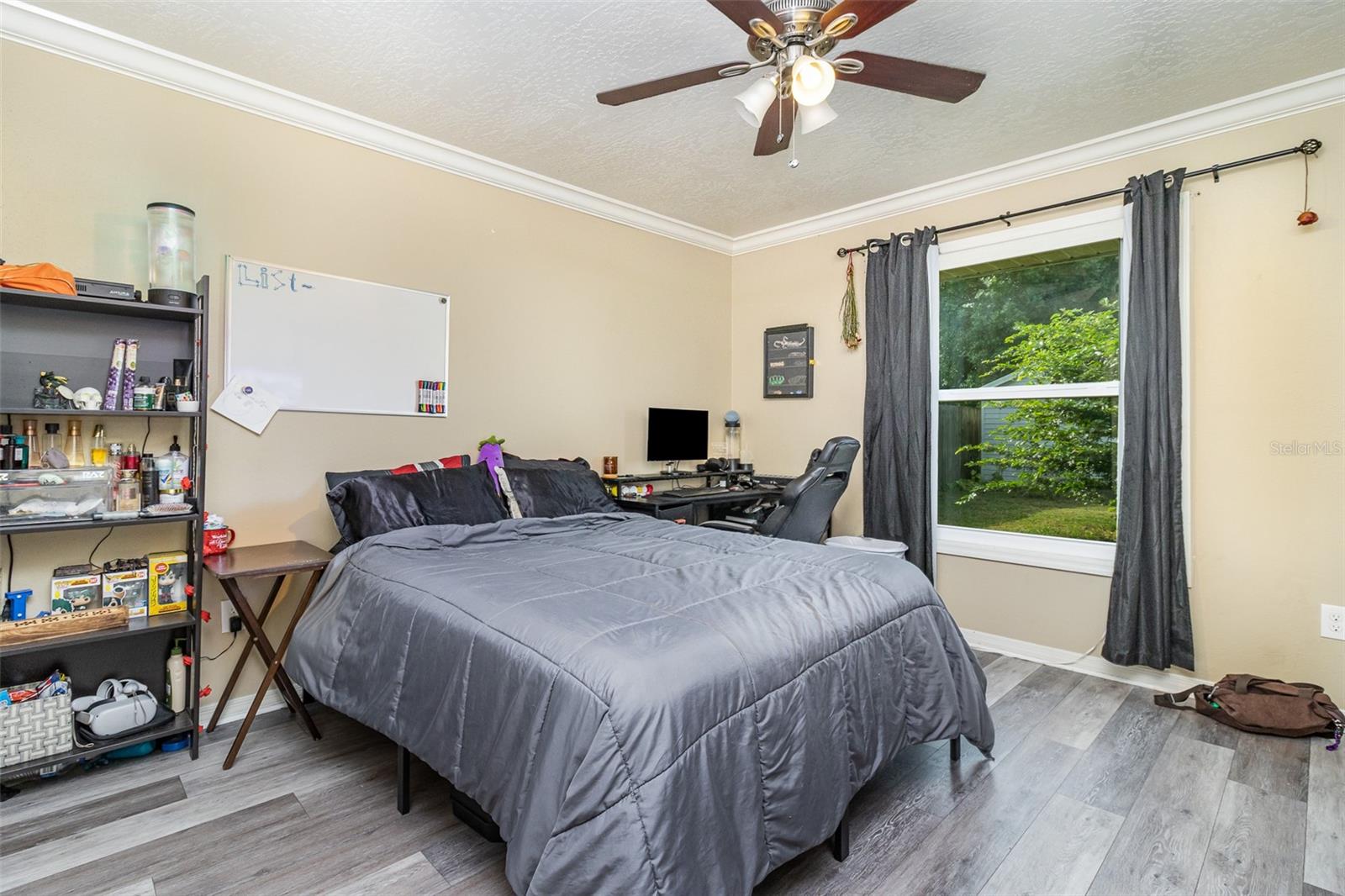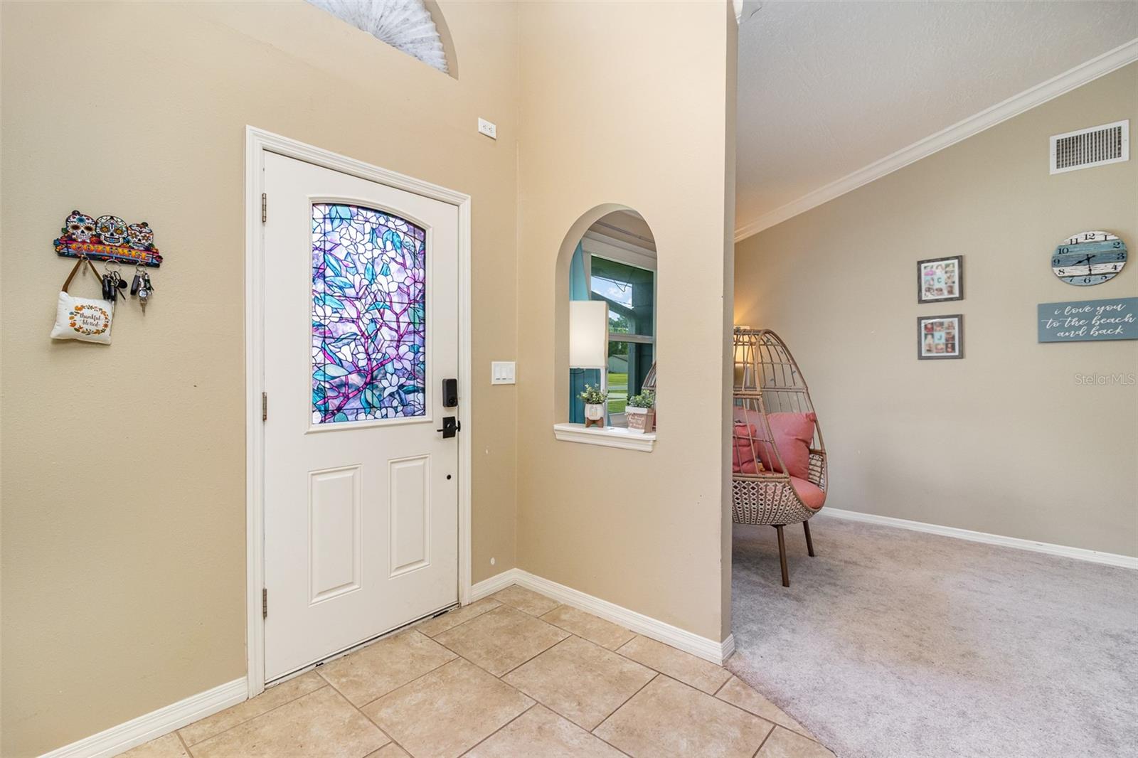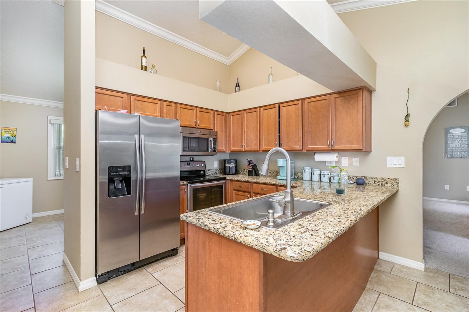 Beautiful home boasting numerous special features! Vaulted ceilings accented by crown molding welcome you into light and bright living room centered on stunning coquina stone fireplace. Architectural arches used throughout for soft modern feel. Spacious kitchen, stainless appliances, granite counters, breakfast bar & breakfast nook overlook fenced peaceful back yard. Separate formal dining for entertaining. Sprawling primary bedroom also with vaulted ceilings & private door to screen enclosed back porch. Walk-in closet & bathroom to envy! Double sinks, ample storage, Roll/Walk-in shower PLUS jetted Walk-IN tub with micro exfoliating bubbles and LED lighting. Spacious bedrooms have laminate floors in split plan for privacy, one with direct access to trussed screen porch. Metal Roof and Impact Windows! 2021 AC. Indoor Laundry Room. Central vacuum system. Added bonus of air conditioned out building. Perfect flex space for workshop/crafts, she shed/man cave! Plus Additional storage shed!