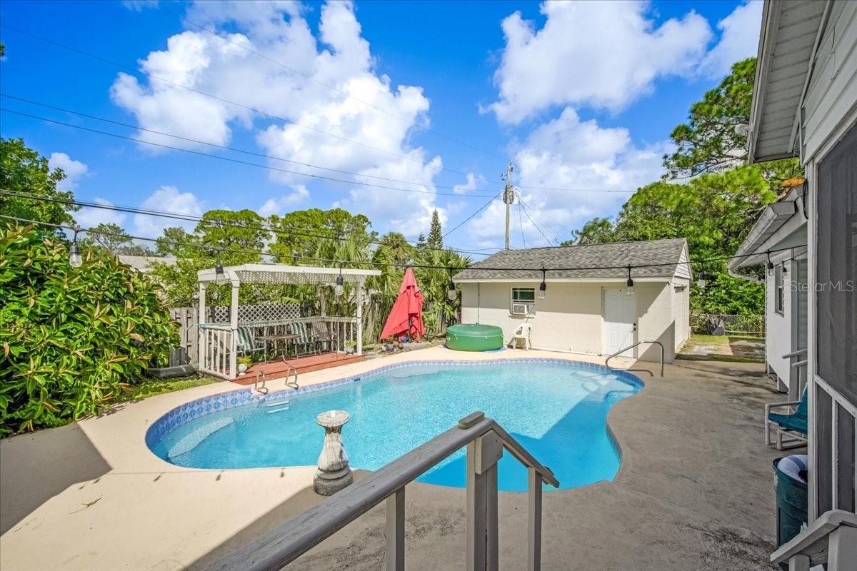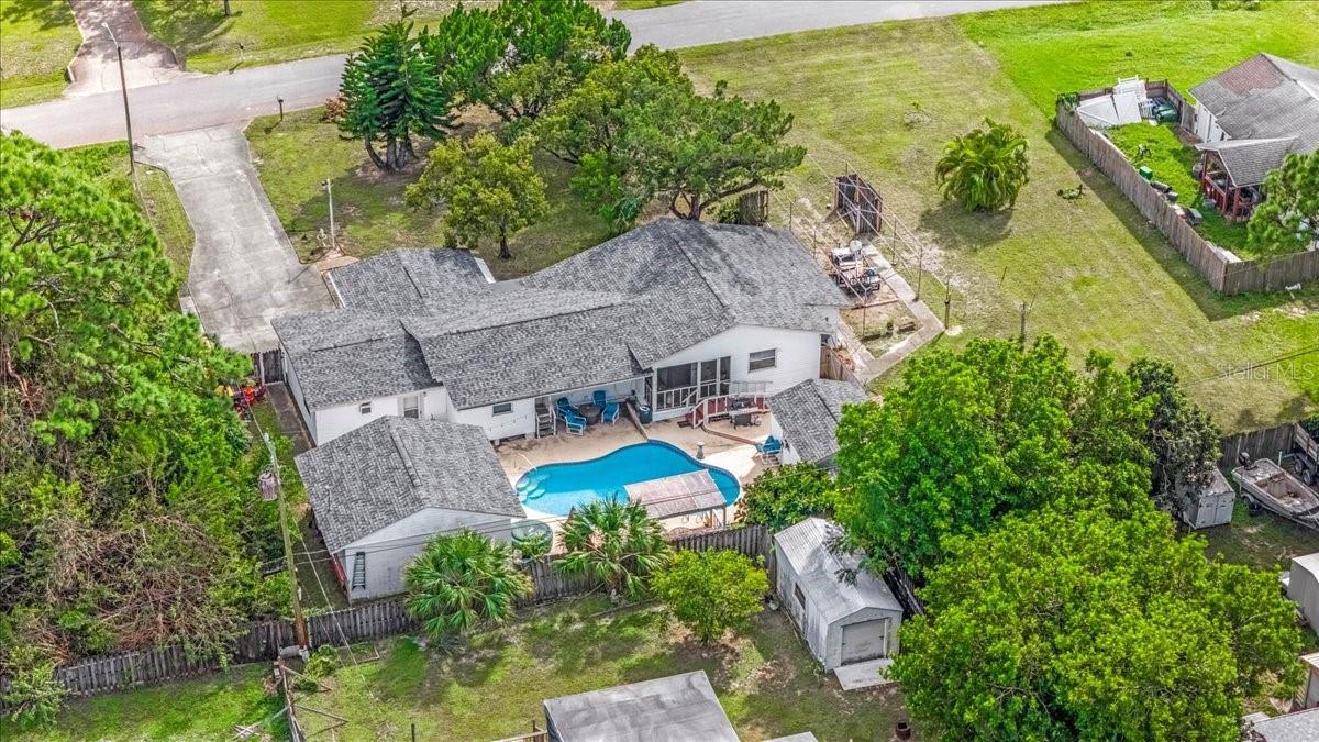 Come see this fantastic manufactured home with an INGROUND POOL ON NEARLY A HALF AN ACRE! This home boast lots of room, roughly 2,000 square feet *see attached sketch for details! Being sold FULLY FURNISHED, it features 3 bedrooms, 3 full baths, and a versatile large BONUS ROOM. Relax by the pool with the outdoor TV or enjoy the screened-in front porch. Newer septic system (2021) and a roof replacement on all buildings (2022). The property also boasts a detached garage with electric, a shed with electric, plumbing, and AC, plus a 50-amp RV hookup in the side yard. The bonus room comes equipped with cabinets, a refrigerator, and a microwave. Both the primary bedroom and bedroom 2 have ENSUITE BATHROOMS. Blackout shades throughout. Don't miss your opportunity, schedule your showing today! Note: The home is being sold as-is and for CASH ONLY because of its age.