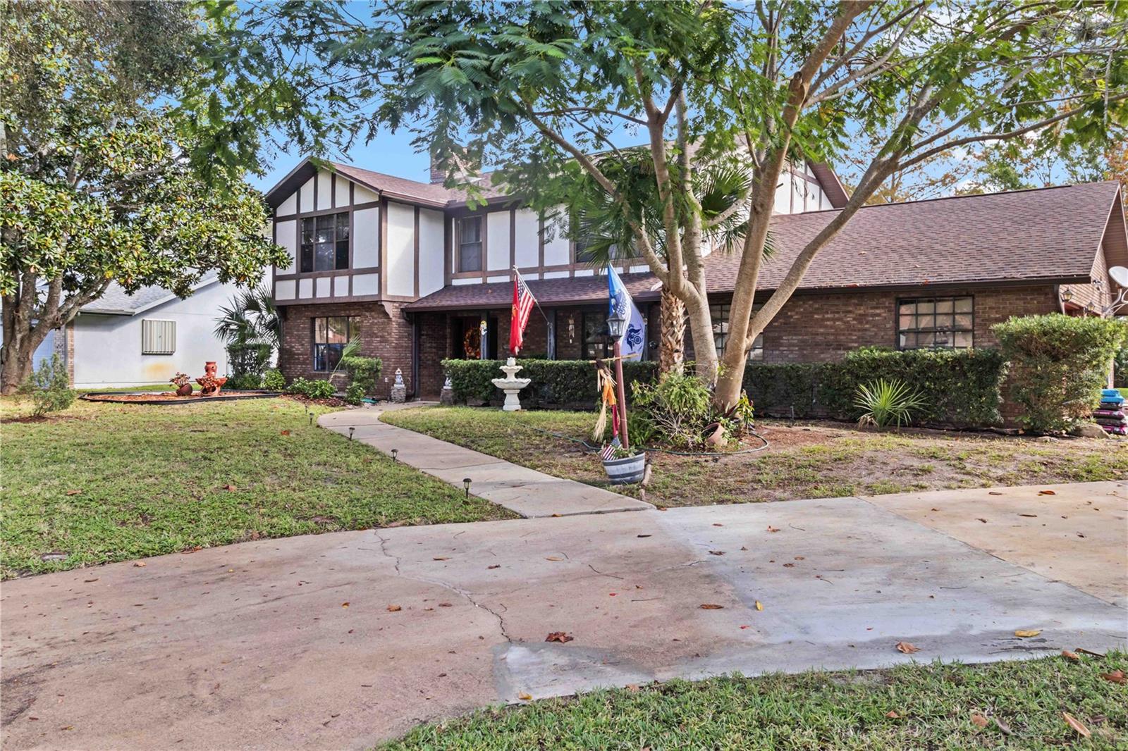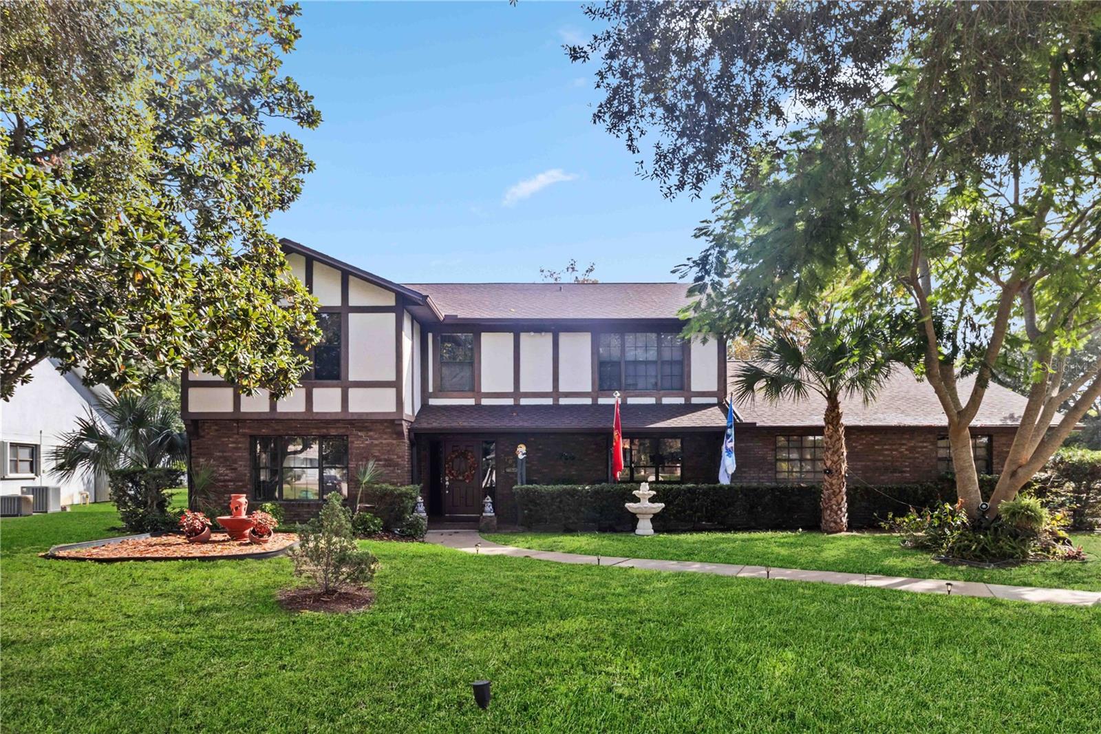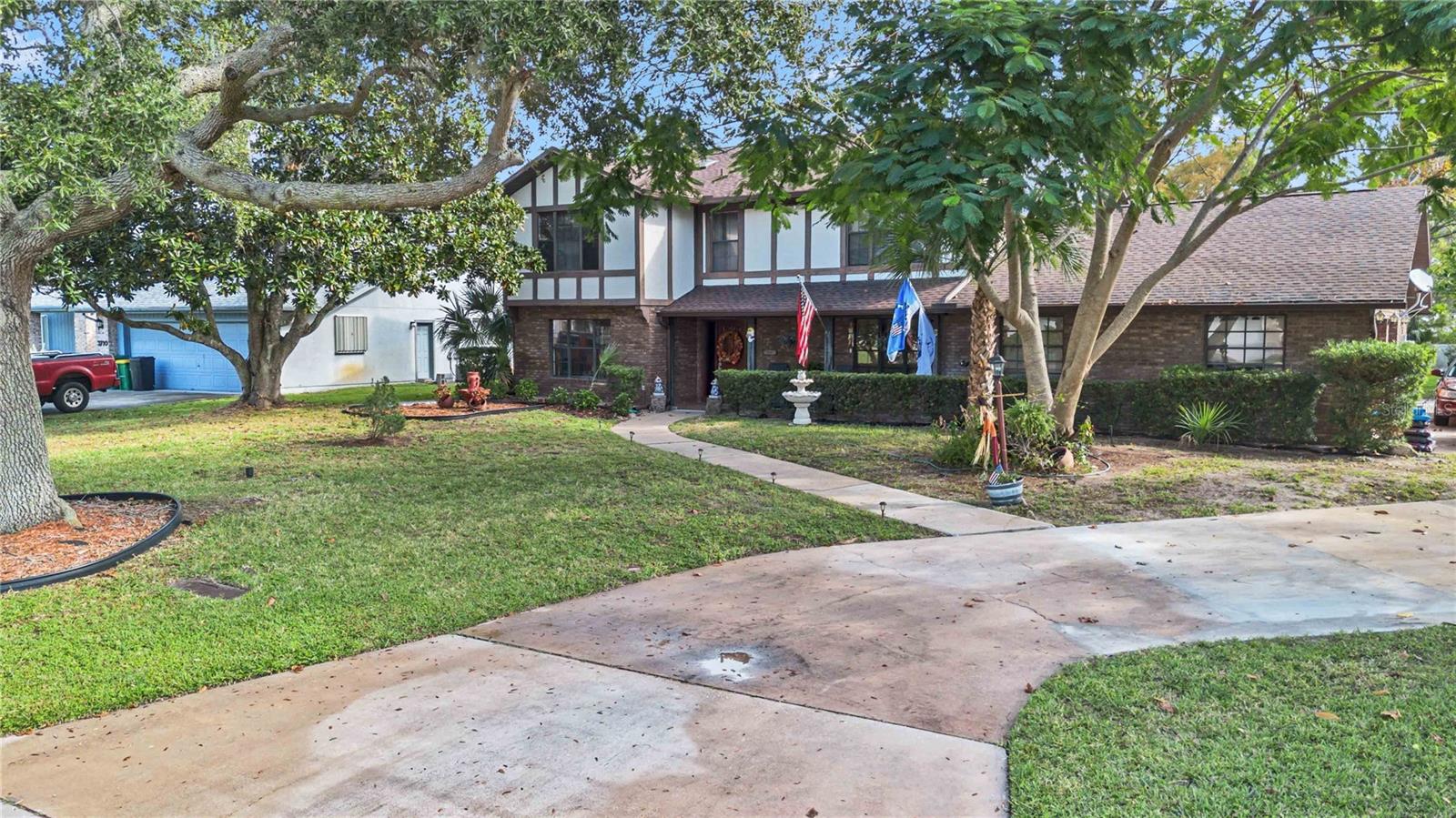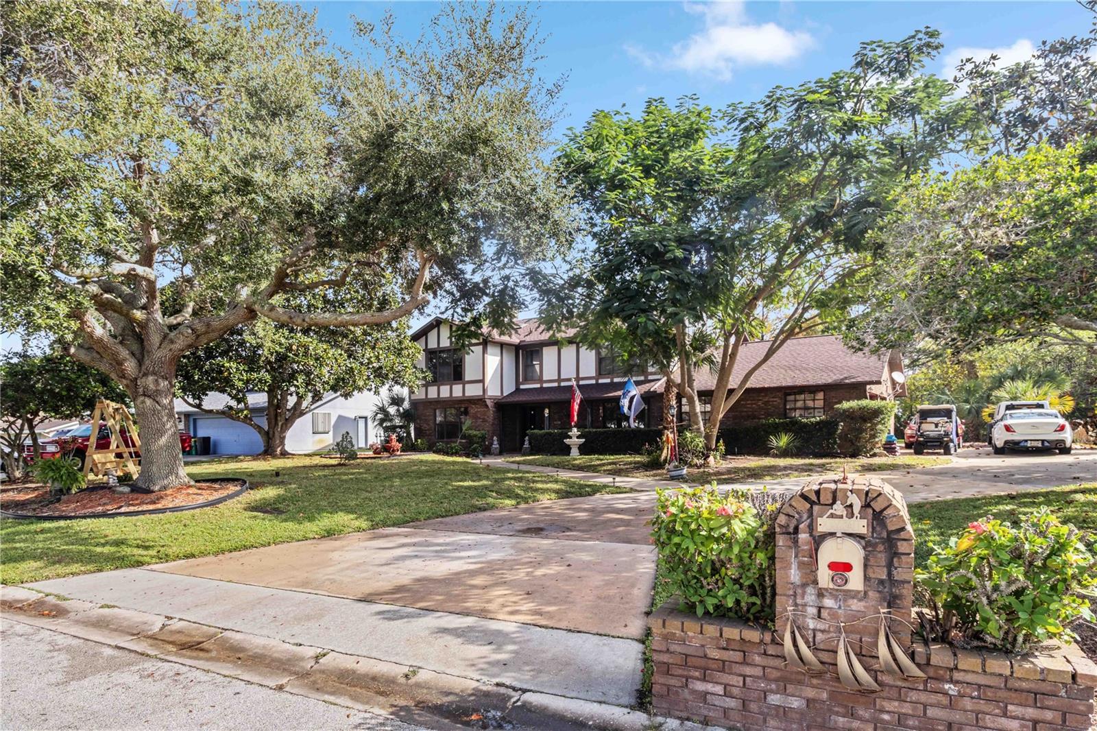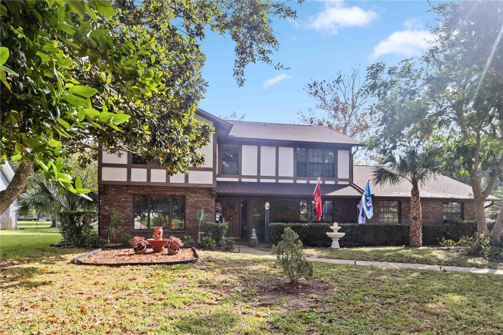 Location, Location, Location! This beautifully crafted two-story Tudor-style home sits on just over half an acre, featuring a screened-in pool and a lush backyard. With 3 bedrooms (one converted into a spacious California Closet), 3.5 bathrooms, and a 2.5-car garage, there’s parking for up to 9 vehicles. The kitchen boasts granite countertops, stainless steel appliances, and a breakfast bar. The owner’s suite includes a large bathroom, a California Closet, and a private balcony overlooking the pool and backyard. Enjoy cozy gatherings around the gas or wood-burning fireplaces, host formal dinners, or relax in the inviting family room. The low $150/year HOA grants access to a community dock and boat ramp on the scenic Indian River, offering stunning, unobstructed rocket launch views. Recent updates include a 2024 roof, solar heating, and A/C. Additionally, all exterior doors have been reconditioned after the latest storm, ensuring durability and charm.
