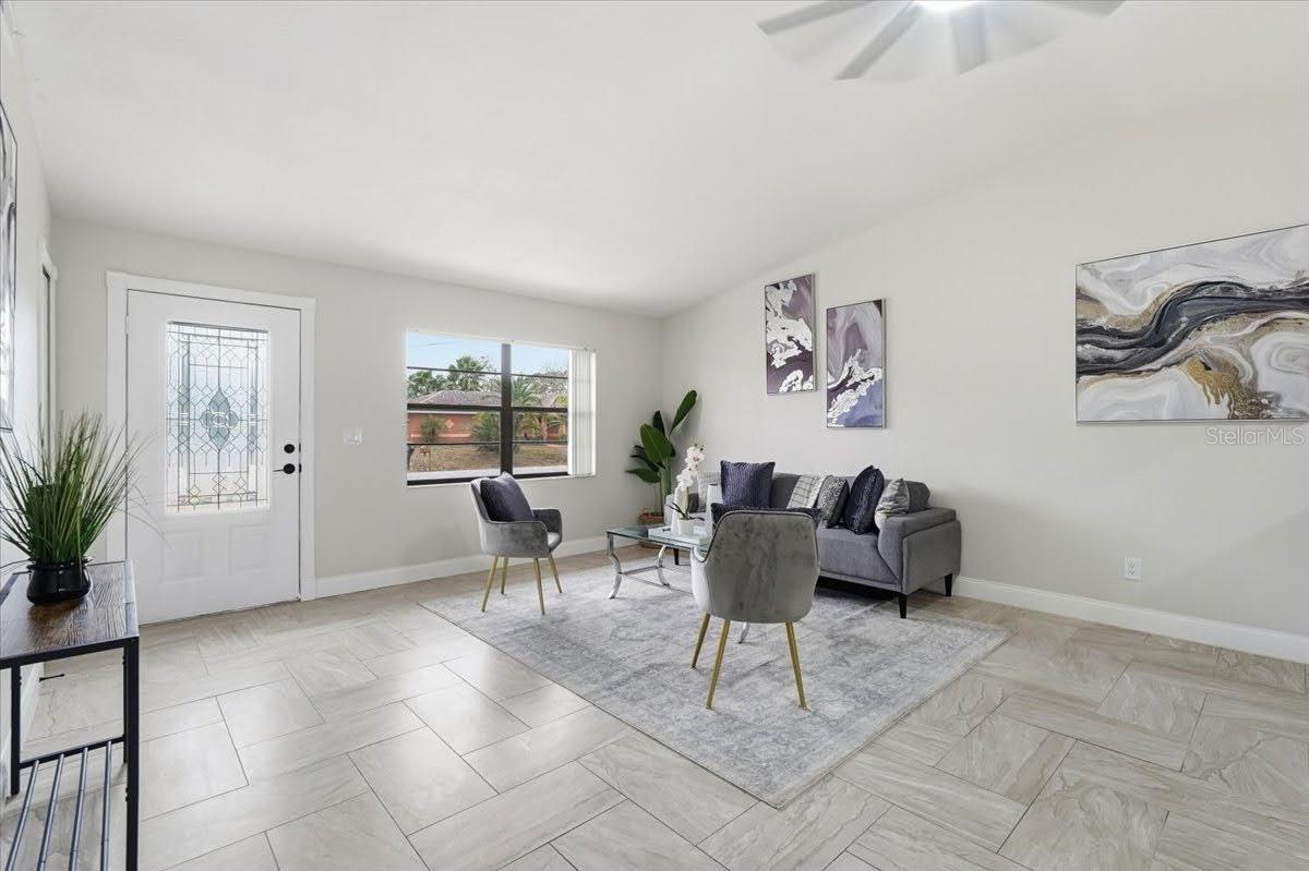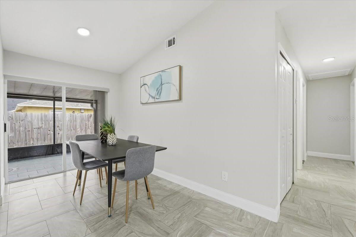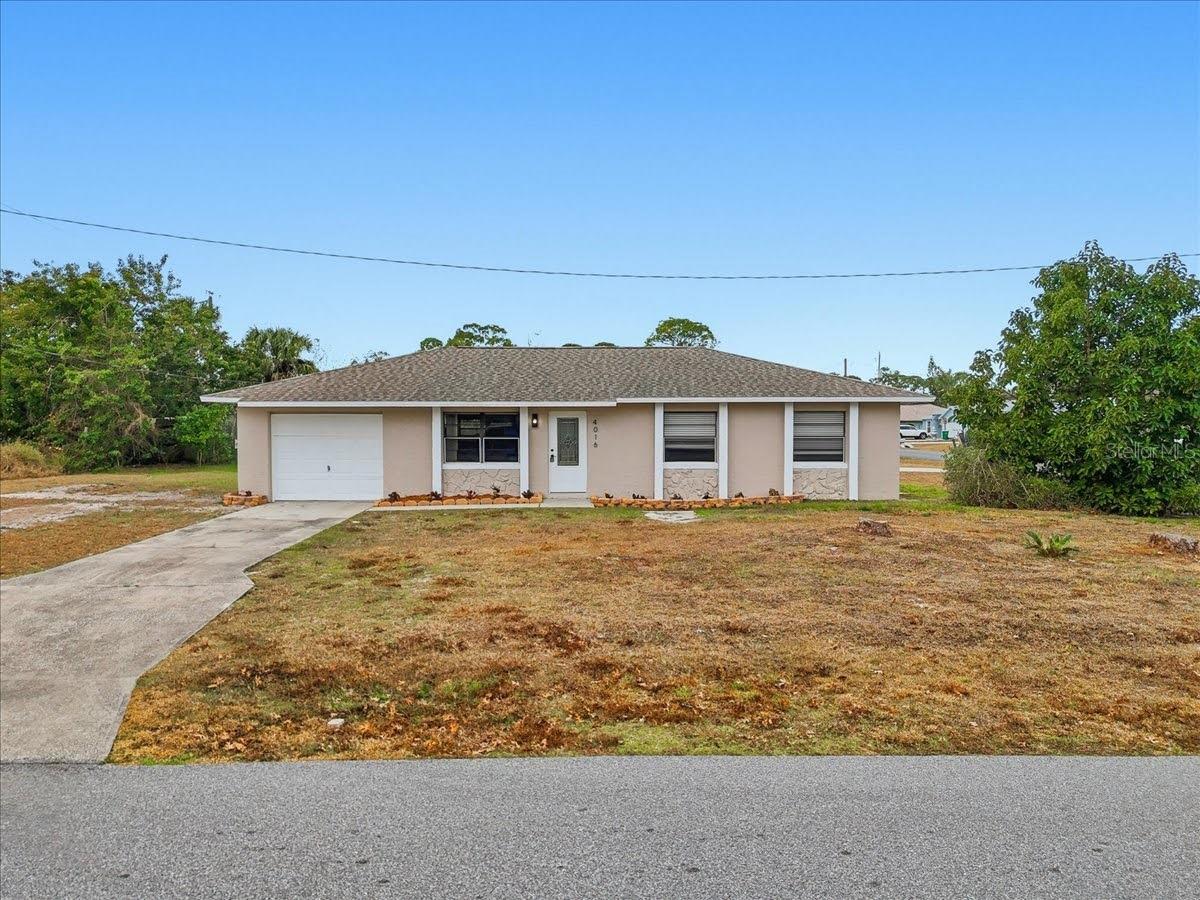 Beautiful 3 bedroom/ 2 bathroom concrete-block home with a 1 car garage, screened-in lanai out back, situated on a large corner lot! Inside you'll find an upgraded home with tile flooring throughout, new interior paint, and vaulted ceilings that open up the place and give it a welcoming feeling. Lovely galley style kitchen with plenty of cabinet space. The sliding glass doors in the dining area open into the screened lanai where you can lounge and enjoy a morning coffee. Spacious master bedroom has an attached bathroom with stand-in shower. Hallway bathroom has been remodeled with a new retiled shower, new mirror, and new vanity! BRAND NEW HVAC and water heater! 2017 Roof in good condition! This could be your perfect home- easy to see! Schedule a showing now!