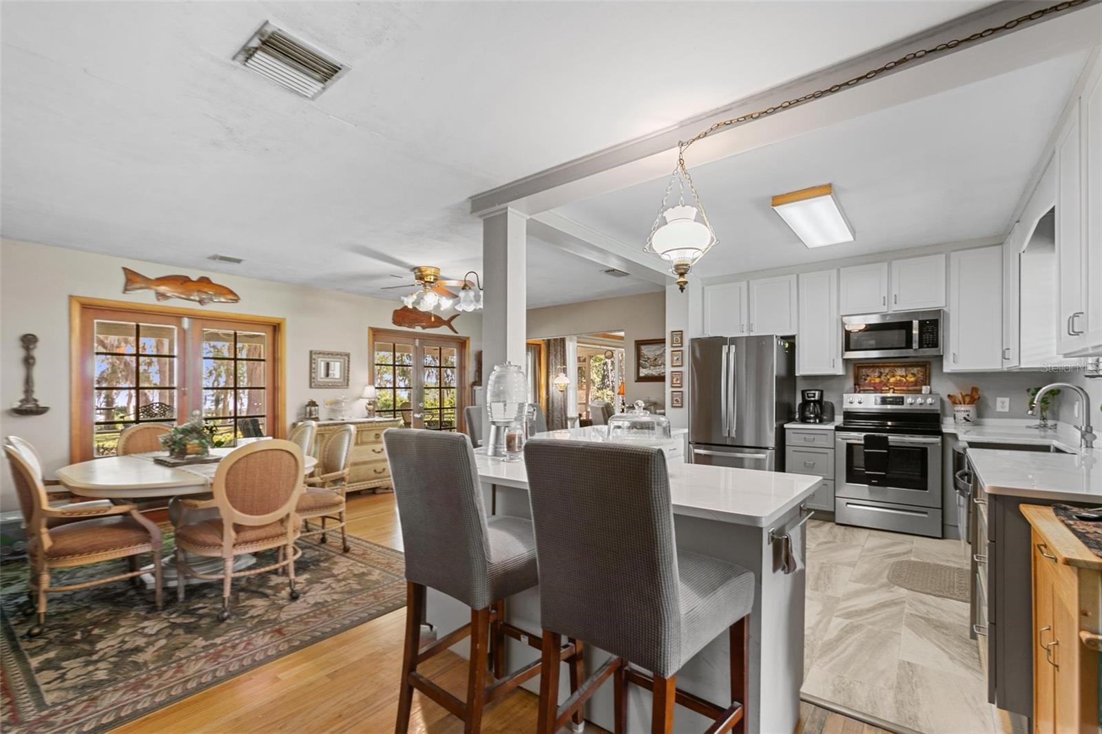 Step back in time to this OLD FLORIDA WATERFRONT PROPERTY! Located on a dead-end street. Approx 244 ft of unspoiled waterfront on Lake Crescent, navigable waters to the Ocean. 4.5 Acre of magnificent, matured oak trees with azalea bushes around most of them! Breath taking views in every direction. Remodeled solid built 1952 house, over 3000 Sq. Ft., 5 bedrooms and 3 baths. Fireplace in main living area, real hardwood floors, modern kitchen opens to a screened 14x57ft Lanai overlooking the lake. 2 bedrooms downstairs. Efficiency apartment upstairs with 3 rooms and a bathroom. With French doors that open to a balcony that allows a view of the whole property, including the lake. Huge laundry room, an office and bathroom in garage. Have a party on the Lanai, sit in the screened natural area, with NO bugs, or play in the almost Olympic size screened in pool with a diving board. Start your day watching the otter and deer play in your backyard. Yet, you are only 2 miles from a grocery store,