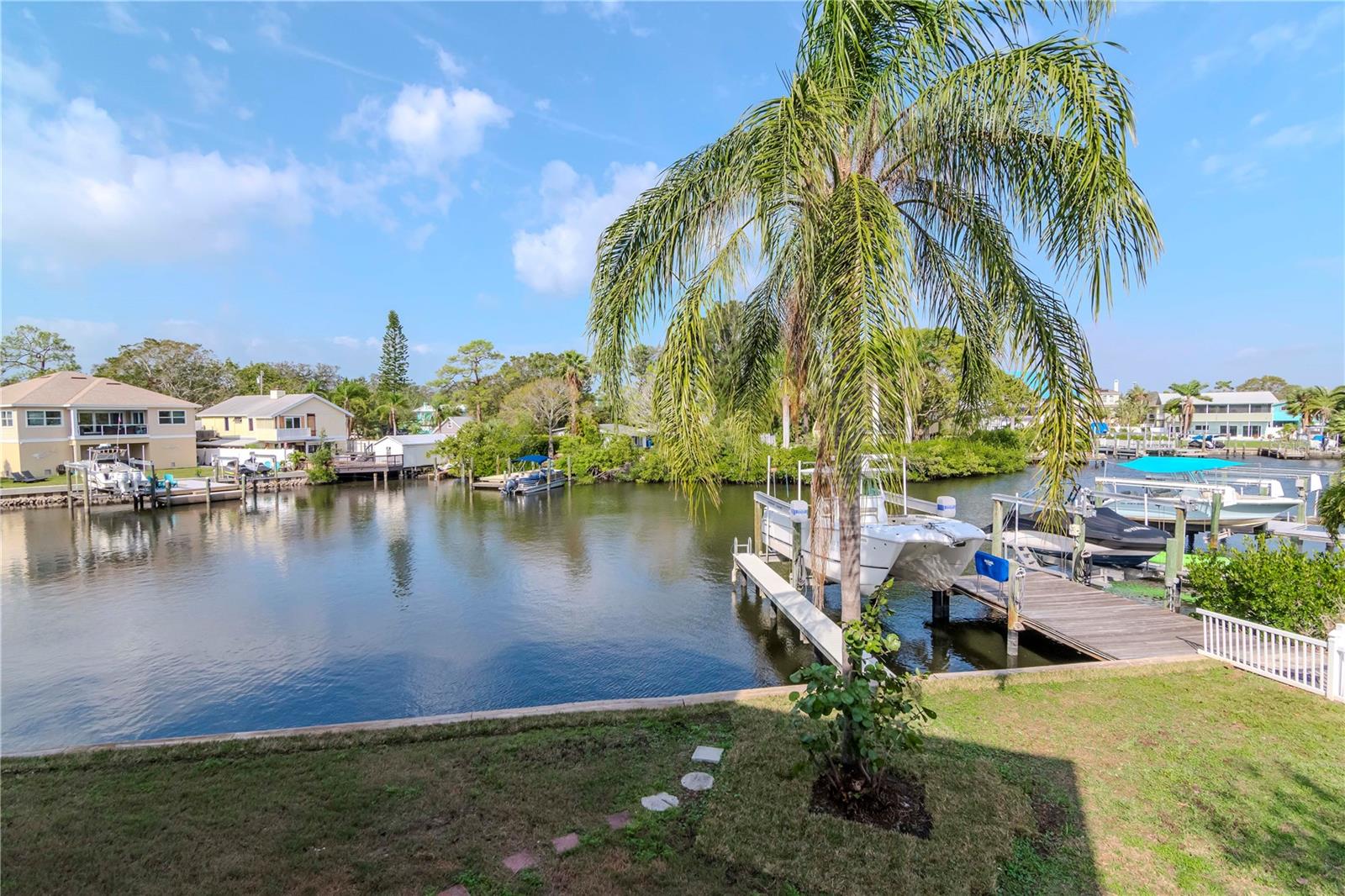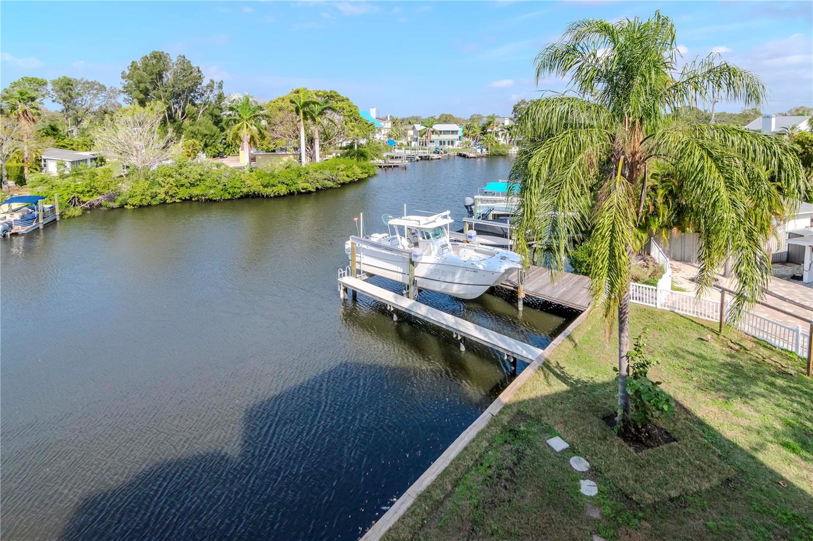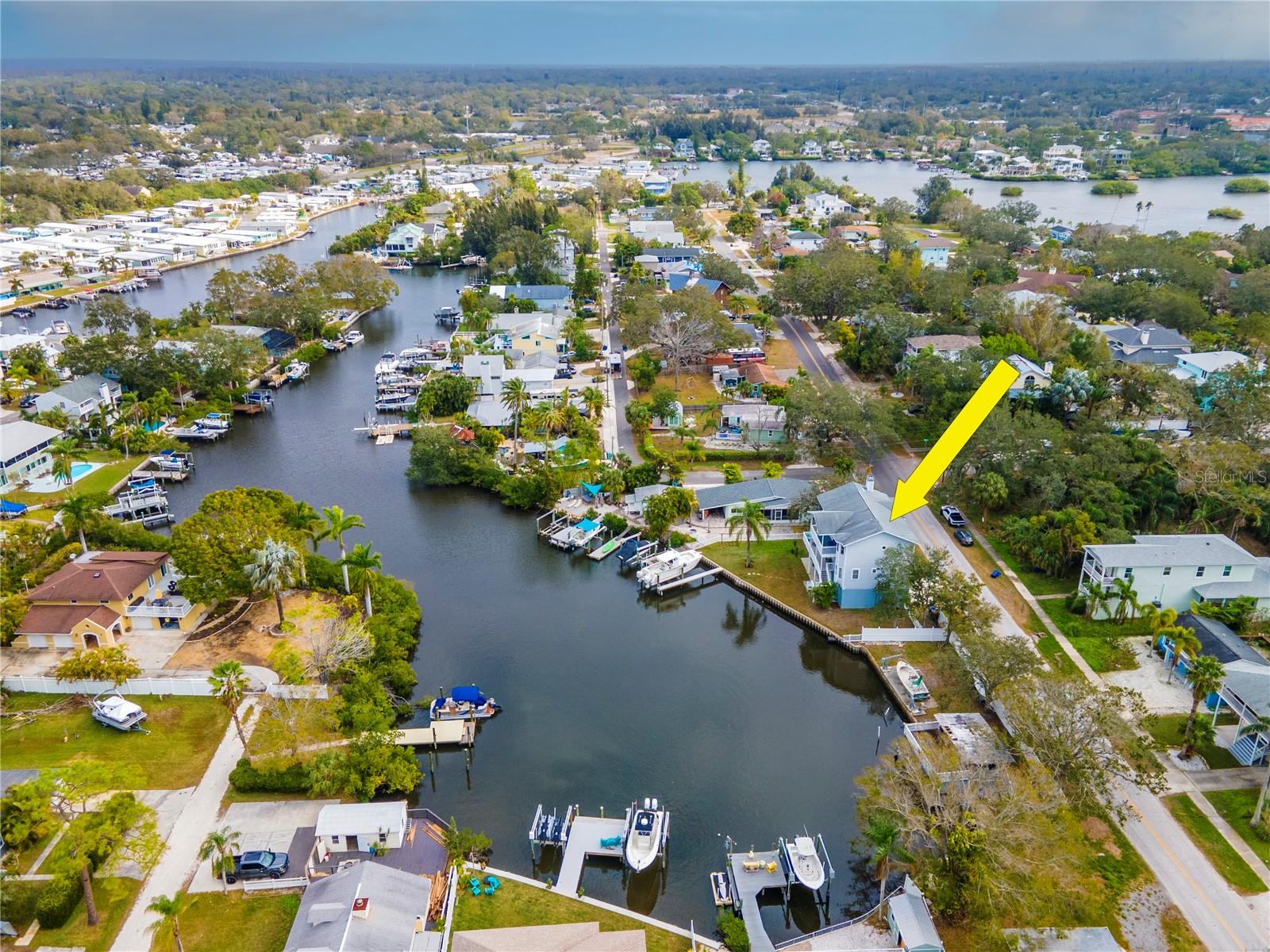MOVE-IN READY waterfront home in the picturesque, golf cart community of Crystal Beach, near the Pinellas Trail. Waterfront stilt home on a protected bayou with 16,000 lb boat lift and no bridges to open Gulf of Mexico (Gulf of America) water. Rare, deep water access in northern Pinellas County. A true boater's paradise. Third floor has a huge primary bedroom and office with a private balcony overlooking the bayou. Walk-in shower, double sink vanity, jetted bathtub, and two walk-in closets. Second floor has two bedrooms and one and a half bathrooms. Kitchen has updated stainless steel appliances with real wood cabinets and granite countertops. New water heater and garbage disposal. Huge great room with fireplace and 20 foot ceilings. Carpet in great room has hardwood floors underneath and can easily be converted back. First floor has a two car garage with tons of storage room. Electric car charging outlet already installed in the garage for your electric car. New 25-year dimensional shingle roof installed March 2025. Whole home automatic fire extinguisher system and assumable $630 per year flood insurance policy. Zoned for A-rated Palm Harbor school district. Additional information available at www.320georgia.com