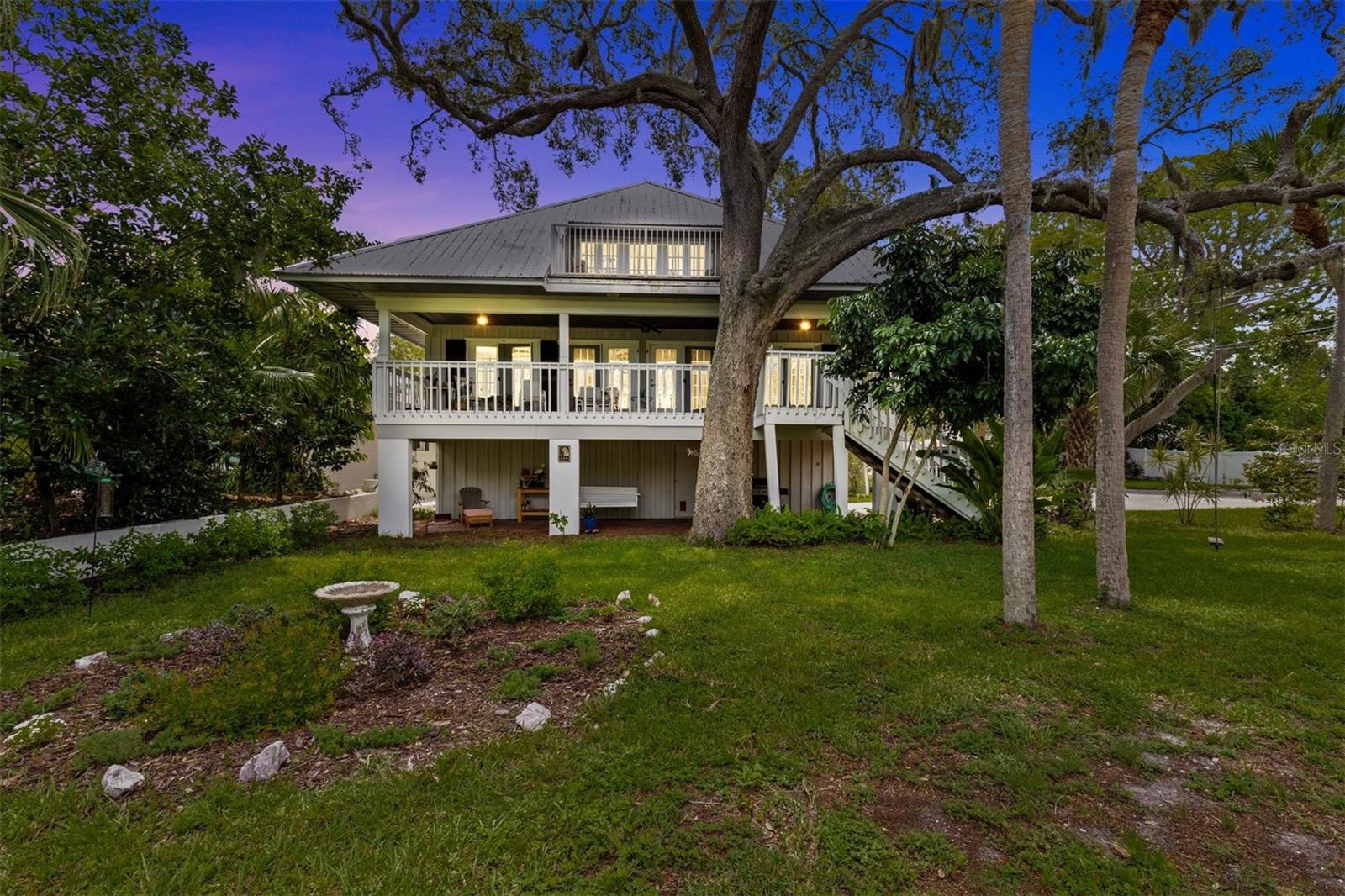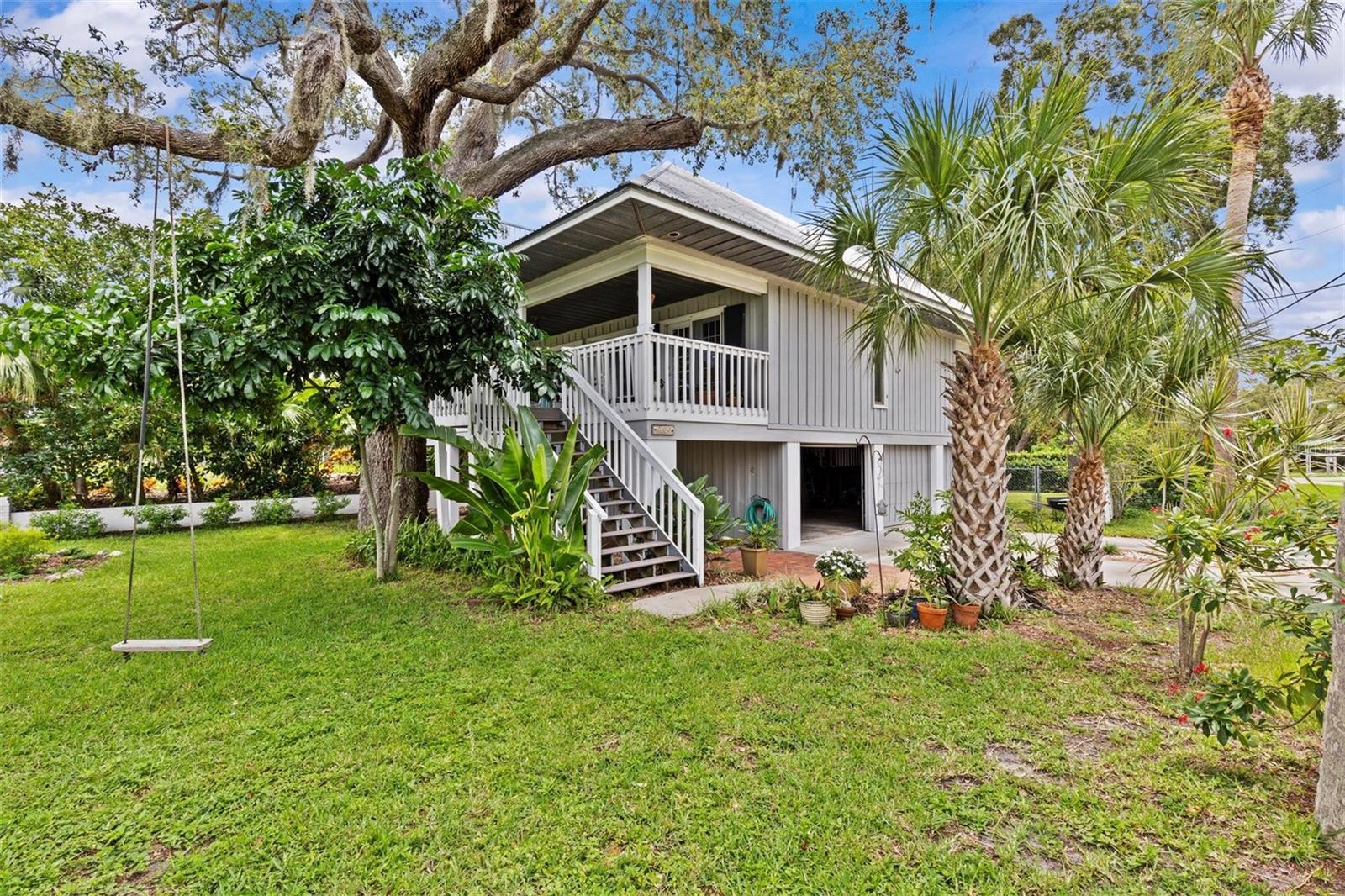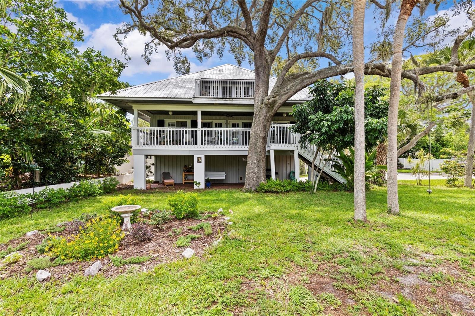 Coastal Key West home with Gulf water views! Located on a large corner lot in the heart of Crystal Beach. This property has never flooded! Featuring the great room layout with wood floors in the main living area. Two brand new A/C units in 2024 & 2025 and a metal roof in 2011. Three way split floor plan. The primary suite is up the spiral staircase with a private sitting room and a 3rd story private porch with Gulf water views! Plenty of natural light shines in throughout the whole home. Seven sets of French doors and spacious porches off every room for your outdoor living enjoyment! A very peaceful and serene treehouse style setting with Gulf breezes. The sunrise & sunsets offer a spectacular pallet of pastel color skies in the morning and evening, along with birds chirping. Wonderful cross ventilation on spring and fall days. Full size air conditioned laundry room off the back porch. Fenced-in backyard.The garage is spacious enough for 4 cars, workshop and room to store your kayaks, paddle boards & golf cart. This is a non-deed restricted area with no HOA. Your watercrafts & recreational vehicles can be stored on site. Located less than a block away from the Pinellas Exercise Trail offering a 45 mile stretch. A few short blocks to Crystal Beach’s Live Oak Park, Gulf Shore Park, new fishing pier being installed, and the coastline shell walking path down S. Gulf Dr. Less than 10 minutes to Downtown Dunedin to the south, or Tarpon Springs to the north. A prime Location! Come live the dream in the charming coastal community of Crystal beach, established in the early 1900s. Still holding the old world charm. A home you’ll be sure to be happy to own!