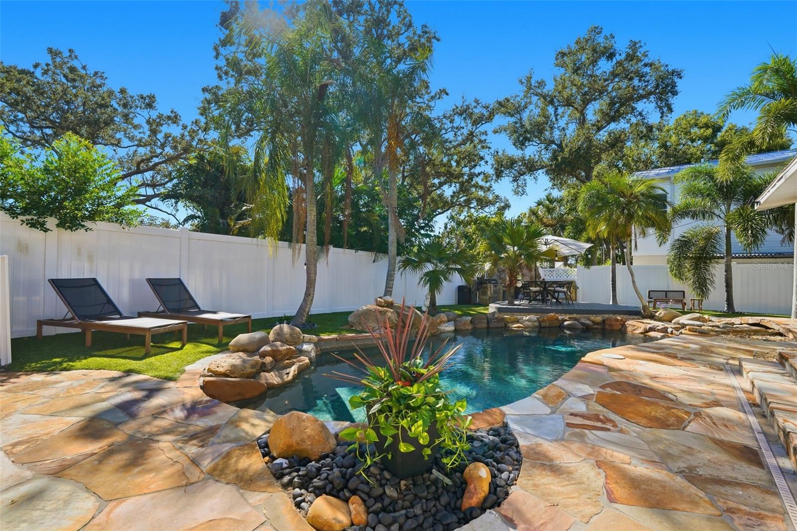 NO FLOOD INSURANCE REQUIRED, HIGH AND DRY. Embrace the Crystal Beach lifestyle in this mid-century-inspired bungalow where resort-style outdoor living meets everyday comfort. Just one block from the Gulf, with water views from you front patio and directly across from a scenic park with a brand-new pier, this rare four-bedroom, three-bath home sits safely outside the flood zone and has remained untouched through recent storms. Zoned for A rated Palm Harbor School District. Blending clean design with natural textures, the interior captures a warm, modern feel that’s both inviting and low-maintenance. Thoughtful updates — including new impact windows, dual-zone air conditioning with a recently replaced main unit, and updated mechanicals — offer everyday comfort and peace of mind. Outside, the home unfolds into a private, spa-like retreat. The front and back yards have been fully reimagined with dog-friendly turf, stone hardscaping, and a heated pool and spa that flow together through a river-run spillway beneath an arched bridge. The setting is anchored by a stone fireplace lounge, surrounded by lush greenery and ambient lighting that transforms the space into a true boutique-style resort — perfect for entertaining or unwinding in complete privacy. A flexible fourth bedroom with its own ensuite bath adds versatility — ideal for a home office, guest suite, or quiet studio tucked apart from the main living areas. Set in the golf-cart-friendly community of Crystal Beach, known for its laid-back rhythm and local charm, you’re just steps from the famous Pinellas Trail and home to the best sunsets in Pinellas County. It’s a rare blend of style, serenity, and freedom — with no HOA. One visit and you’ll see why this property feels equally at home as a hidden getaway or a family haven along Florida’s most charming stretch of coastline.