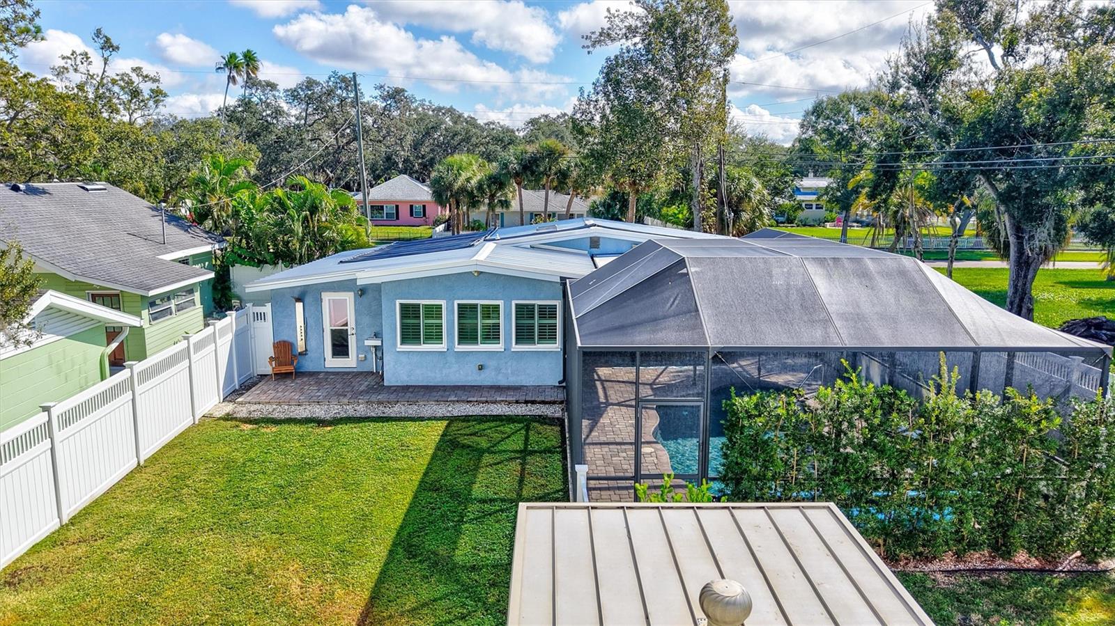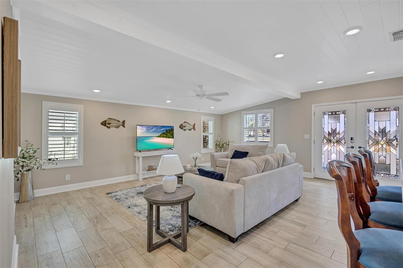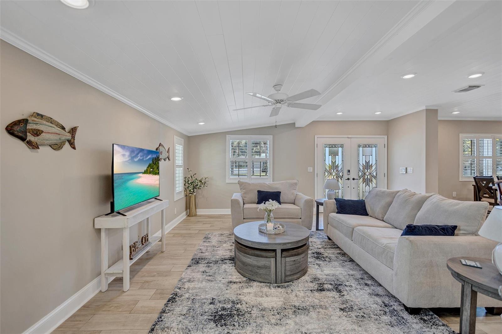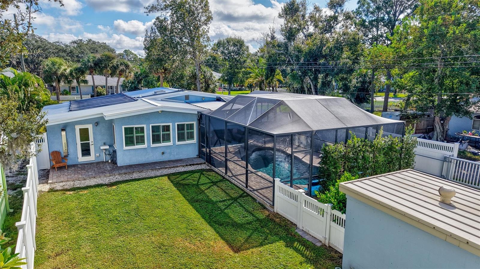 Come home to Crystal Beach — a charming, golf cart–friendly waterfront community where neighbors gather to watch breathtaking sunsets by the shore. This beautifully updated home has been completely transformed and is move-in ready. Step inside to an inviting open floor plan featuring plank tile flooring throughout, fresh interior paint, custom lighting, and a stunning wood plank ceiling. Enjoy peace of mind with hurricane-impact windows, solid block construction, a metal roof, and a brand-new AC system installed in 2023. Plus, new solar panels (fully paid off!) efficiently heat the sparkling saltwater pool, helping you relax and unwind in your private backyard oasis. The chef’s kitchen is a showstopper, offering bar seating, stainless steel appliances, granite countertops, and custom wood cabinetry. Both bathrooms have been tastefully remodeled with elegant tiled showers, glass doors, and brushed nickel rain shower heads. The primary suite features a walk-in closet and stylish barn doors for both the bedroom and bathroom, while the second bedroom (also with a barn door) currently serves as a cozy additional living area with direct pool access. The indoor laundry room is spacious and has access to the large fenced back yard. Step outside to your screened lanai and enjoy the heated saltwater pool, outdoor shower with hand-held rain shower and sink, a fully fenced yard, and detached storage shed—plus plenty of space for extra parking. The home features an additional parking pad in the rear of the home accessed by the alley, which is the perfect spot for the RV, Boat or extra cars. The block shed is equipped with electric and is perfect to store all your lawn tools and bikes, or to create your mini-workshop. The front pavered driveway is beautiful and spacious, and additional parking is also in the front of the home on the shelled drive. This incredible home is located just steps from the water and minutes from local dining and shops. There is an OPTIONAL HOA (Crystal Beach Community Association) with fees of just $30 per year, which hosts numerous events throughout the year for the community. Crystal Beach is the perfect location to launch your paddle boards, take in the sunset, meet up with friends, and enjoy the Live Oak park located across from the water. The community will soon have a new Fishing pier which is currently being re-built. Zoned for great schools including Ozona Elementary, Palm Harbor Middle and Palm Harbor University. Whether you’re looking to downsize, find your perfect winter retreat, or invest in a property that can be leased short or long term, (as there are no rental restrictions here!) this Crystal Beach gem checks every box.