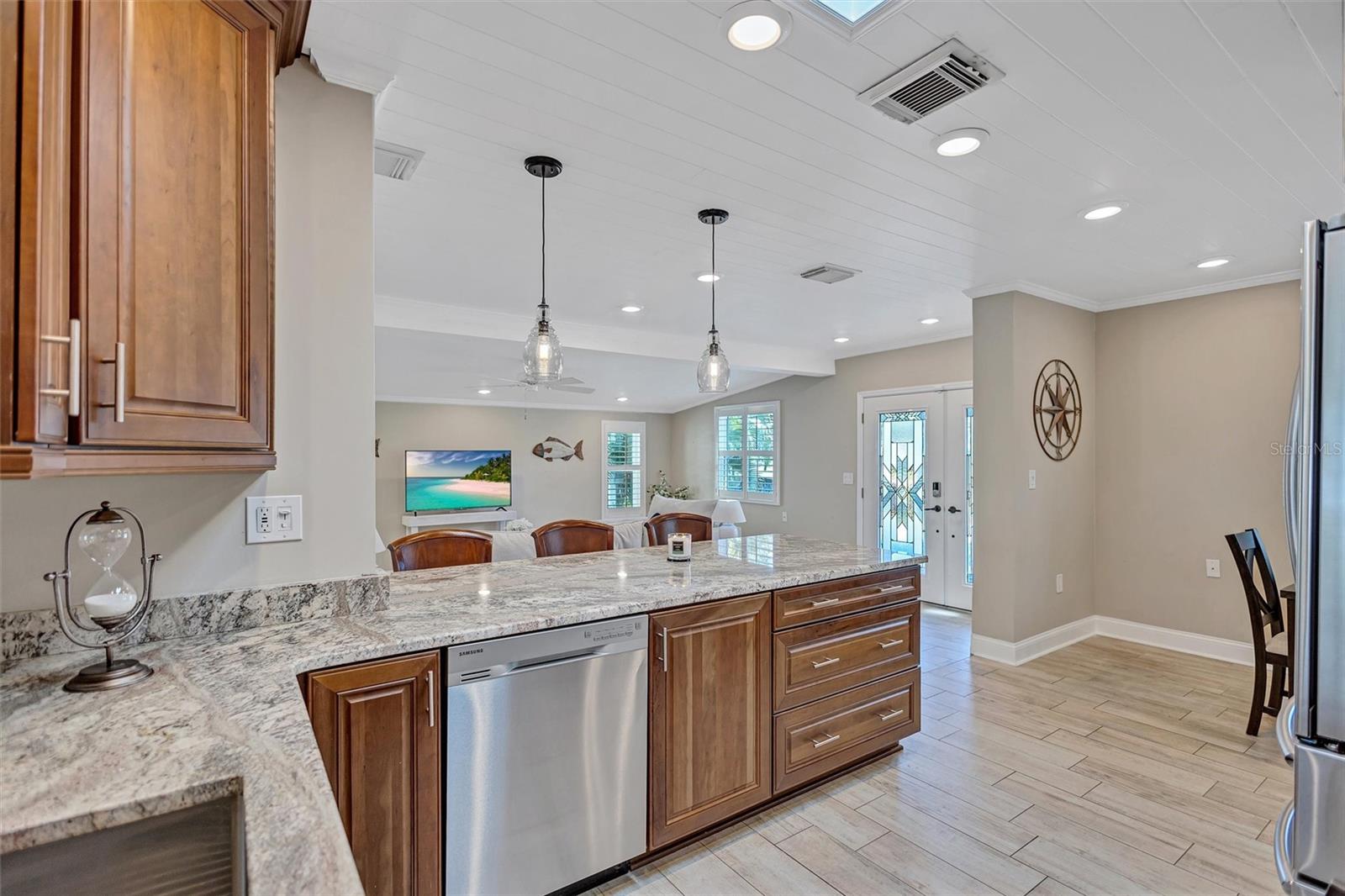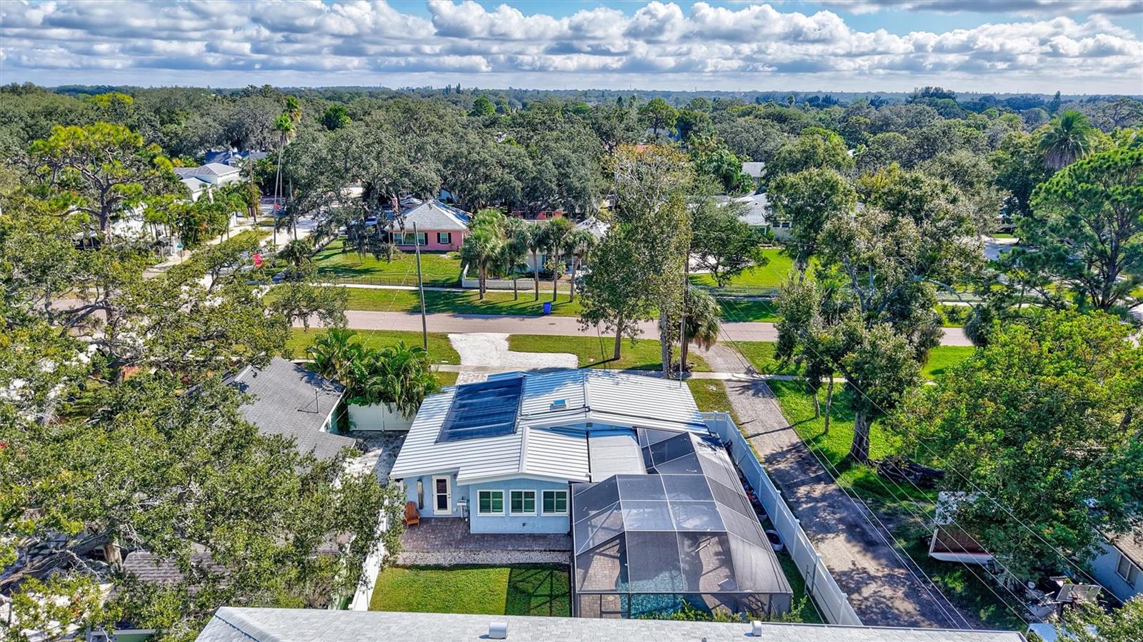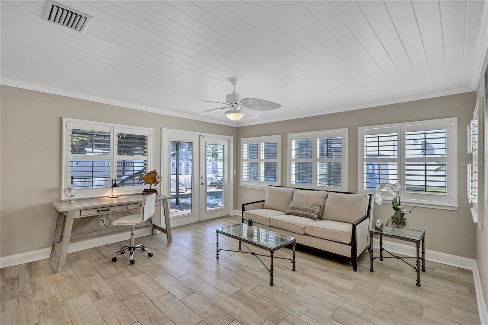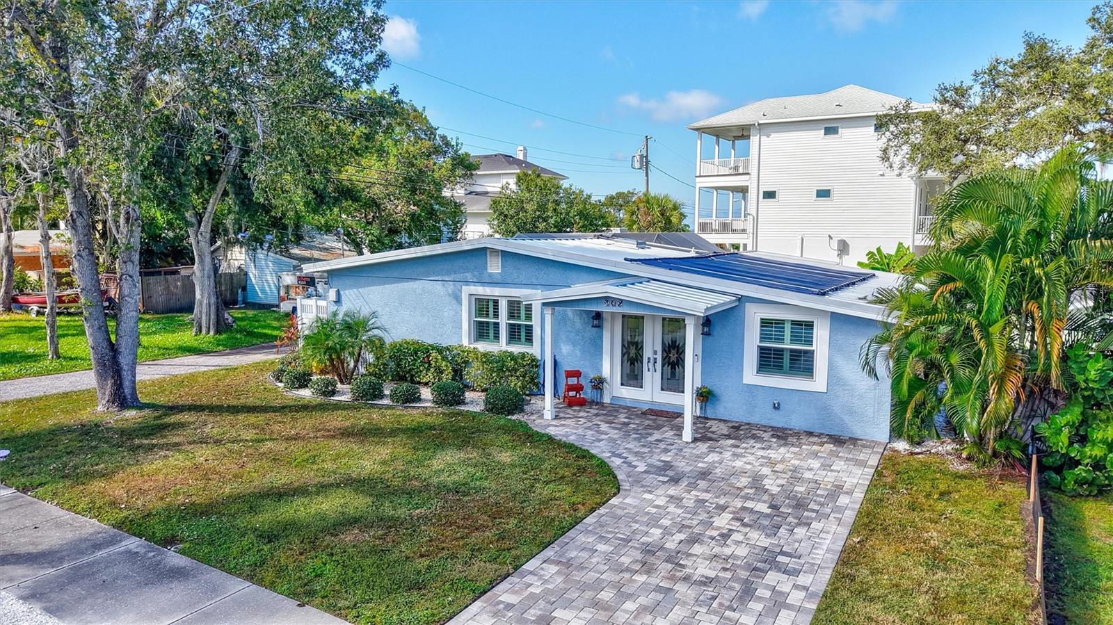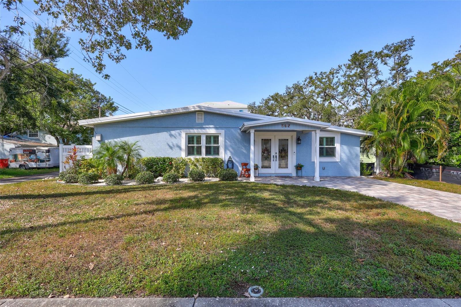 Come home to Crystal Beach — a charming, golf cart–friendly waterfront community where neighbors gather to watch breathtaking sunsets by the shore. This beautifully updated home has been completely transformed and is move-in ready. Step inside to an inviting open floor plan featuring plank tile flooring throughout, fresh interior paint, custom lighting, and a stunning wood plank ceiling. Enjoy peace of mind with hurricane-impact windows, solid block construction, a metal roof, and a brand-new AC system installed in 2023. Plus, new solar panels (fully paid off!) efficiently heat the sparkling saltwater pool, helping you relax and unwind in your private backyard oasis. The chef’s kitchen is a showstopper, offering bar seating, stainless steel appliances, granite countertops, and custom wood cabinetry. Both bathrooms have been tastefully remodeled with elegant tiled showers, glass doors, and brushed nickel rain shower heads. The primary suite features a walk-in closet and stylish barn doors for both the bedroom and bathroom, while the second bedroom (also with a barn door) currently serves as a cozy additional living area with direct pool access. The indoor laundry room is spacious and has access to the large fenced back yard. Step outside to your screened lanai and enjoy the heated saltwater pool, outdoor shower with hand-held rain shower and sink, a fully fenced yard, and detached storage shed—plus plenty of space for extra parking. The home features an additional parking pad in the rear of the home accessed by the alley, which is the perfect spot for the RV, Boat or extra cars. The block shed is equipped with electric and is perfect to store all your lawn tools and bikes, or to create your mini-workshop. The front pavered driveway is beautiful and spacious, and additional parking is also in the front of the home on the shelled drive. This incredible home is located just steps from the water and minutes from local dining and shops. There is an OPTIONAL HOA (Crystal Beach Community Association) with fees of just $30 per year, which hosts numerous events throughout the year for the community. Crystal Beach is the perfect location to launch your paddle boards, take in the sunset, meet up with friends, and enjoy the Live Oak park located across from the water. The community will soon have a new Fishing pier which is currently being re-built. Zoned for great schools including Ozona Elementary, Palm Harbor Middle and Palm Harbor University. Whether you’re looking to downsize, find your perfect winter retreat, or invest in a property that can be leased short or long term, (as there are no rental restrictions here!) this Crystal Beach gem checks every box.