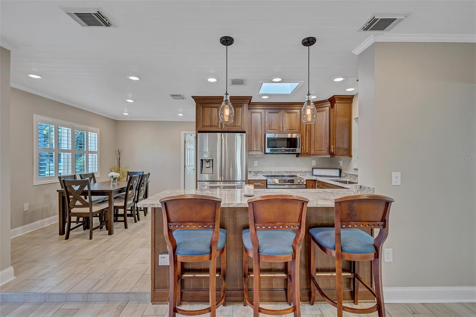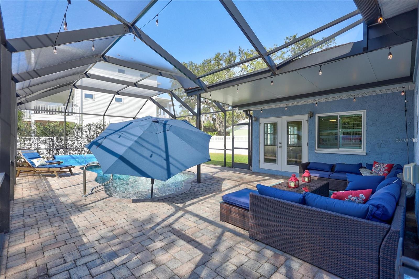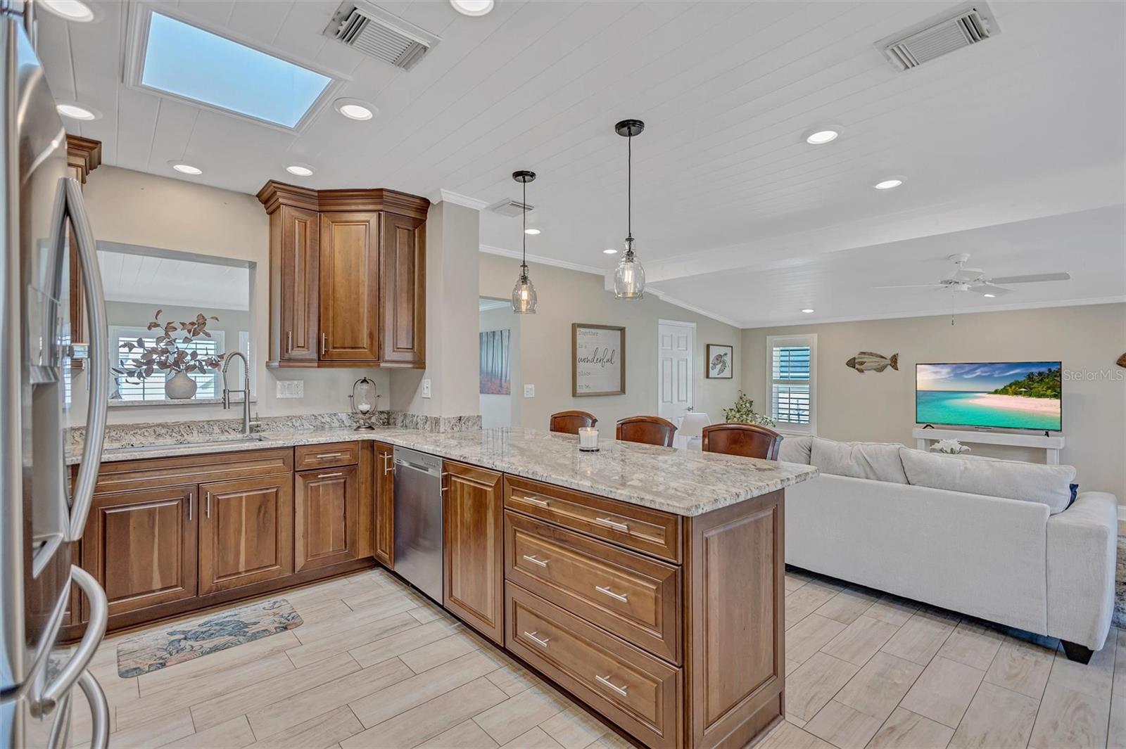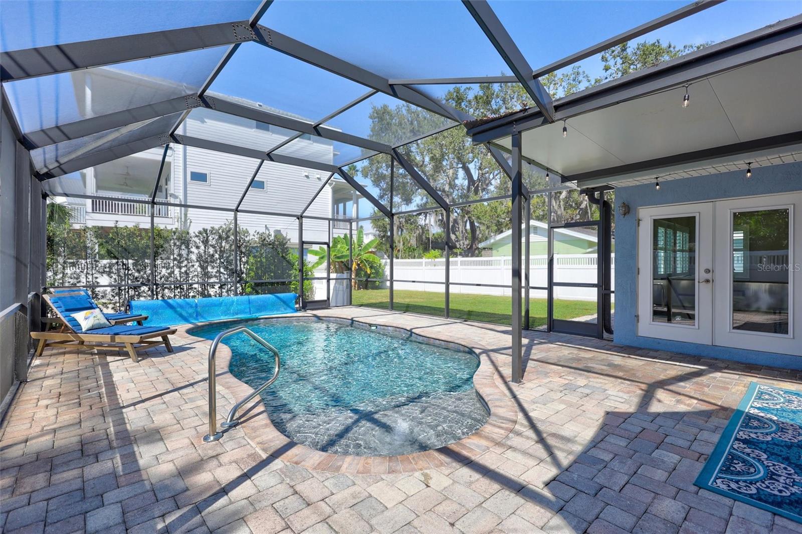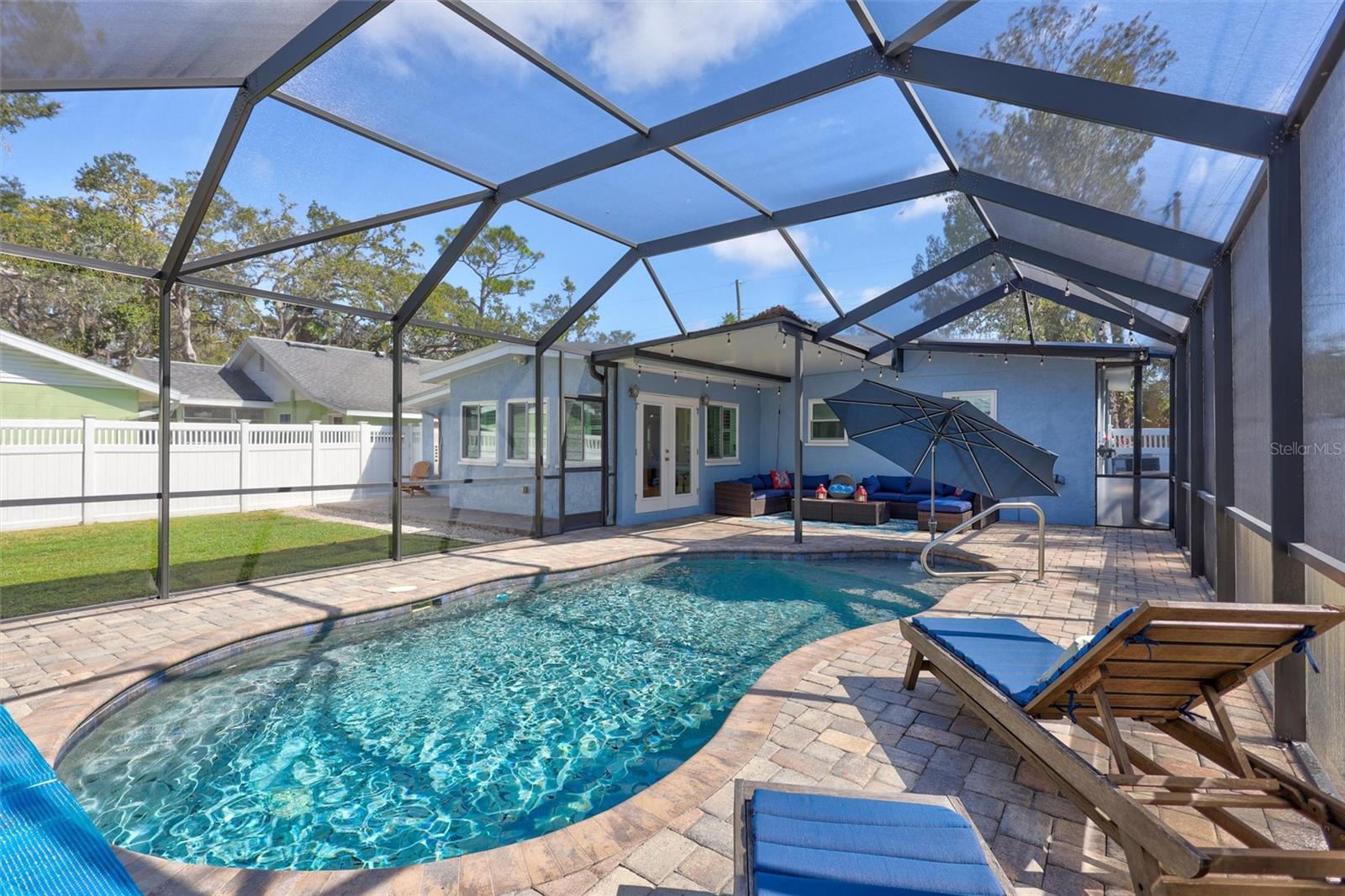 Come home to Crystal Beach — a charming, golf cart–friendly waterfront community where neighbors gather to watch breathtaking sunsets by the shore. This beautifully updated home has been completely transformed and is move-in ready. Step inside to an inviting open floor plan featuring plank tile flooring throughout, fresh interior paint, custom lighting, and a stunning wood plank ceiling. Enjoy peace of mind with hurricane-impact windows, solid block construction, a metal roof, and a brand-new AC system installed in 2023. Plus, new solar panels (fully paid off!) efficiently heat the sparkling saltwater pool, helping you relax and unwind in your private backyard oasis. The chef’s kitchen is a showstopper, offering bar seating, stainless steel appliances, granite countertops, and custom wood cabinetry. Both bathrooms have been tastefully remodeled with elegant tiled showers, glass doors, and brushed nickel rain shower heads. The primary suite features a walk-in closet and stylish barn doors for both the bedroom and bathroom, while the second bedroom (also with a barn door) currently serves as a cozy additional living area with direct pool access. The indoor laundry room is spacious and has access to the large fenced back yard. Step outside to your screened lanai and enjoy the heated saltwater pool, outdoor shower with hand-held rain shower and sink, a fully fenced yard, and detached storage shed—plus plenty of space for extra parking. The home features an additional parking pad in the rear of the home accessed by the alley, which is the perfect spot for the RV, Boat or extra cars. The block shed is equipped with electric and is perfect to store all your lawn tools and bikes, or to create your mini-workshop. The front pavered driveway is beautiful and spacious, and additional parking is also in the front of the home on the shelled drive. This incredible home is located just steps from the water and minutes from local dining and shops. There is an OPTIONAL HOA (Crystal Beach Community Association) with fees of just $30 per year, which hosts numerous events throughout the year for the community. Crystal Beach is the perfect location to launch your paddle boards, take in the sunset, meet up with friends, and enjoy the Live Oak park located across from the water. The community will soon have a new Fishing pier which is currently being re-built. Zoned for great schools including Ozona Elementary, Palm Harbor Middle and Palm Harbor University. Whether you’re looking to downsize, find your perfect winter retreat, or invest in a property that can be leased short or long term, (as there are no rental restrictions here!) this Crystal Beach gem checks every box.