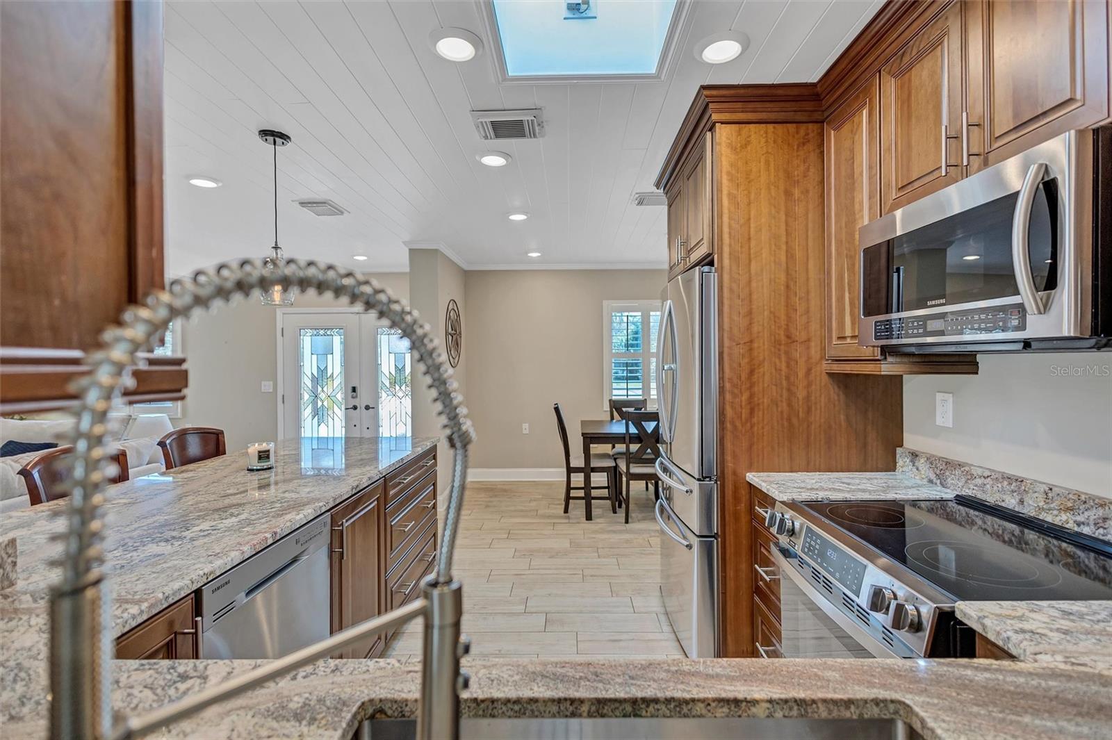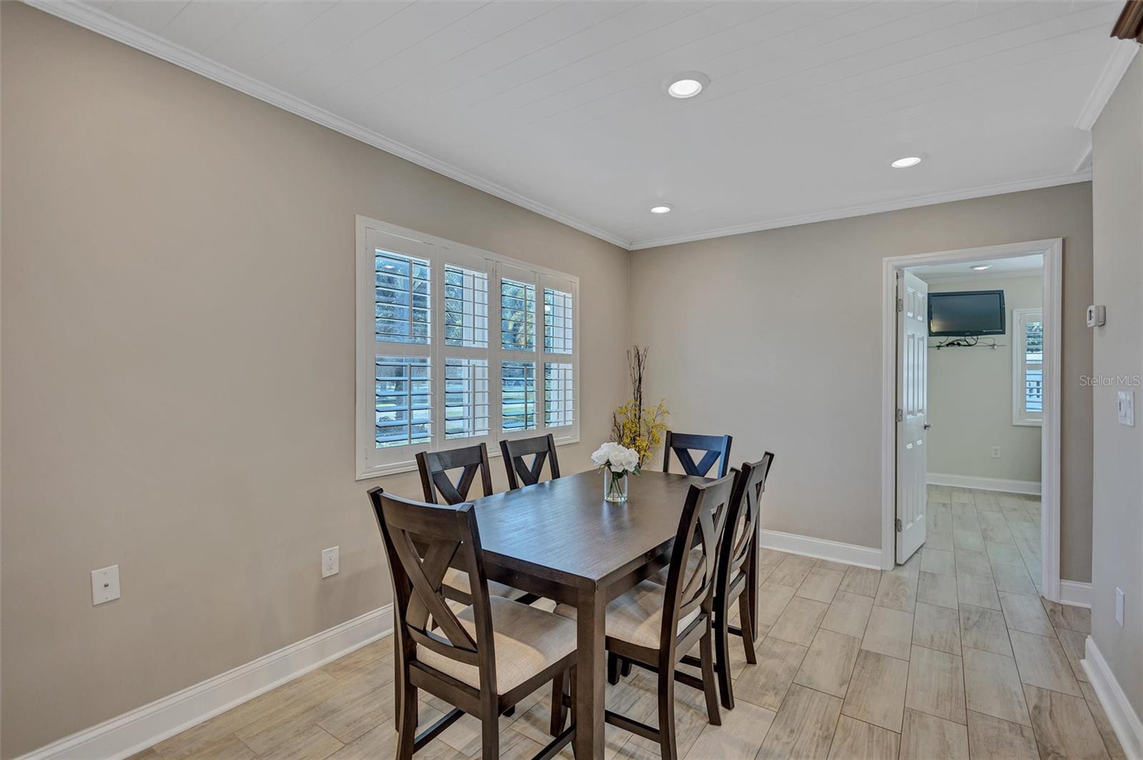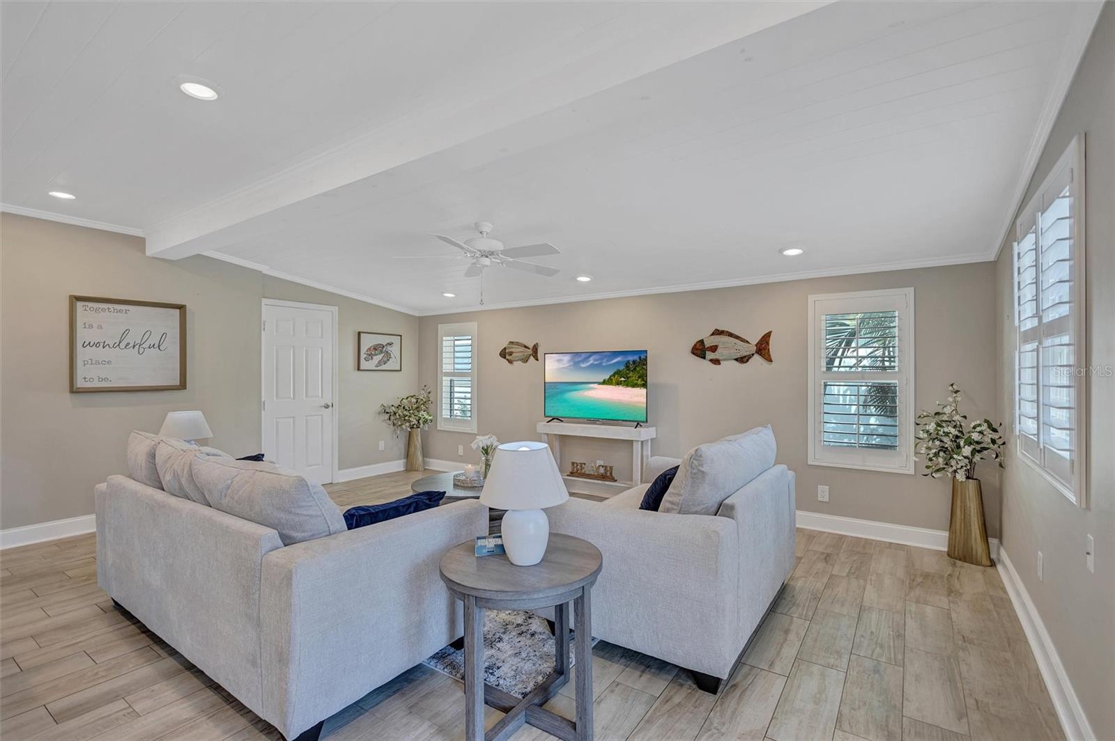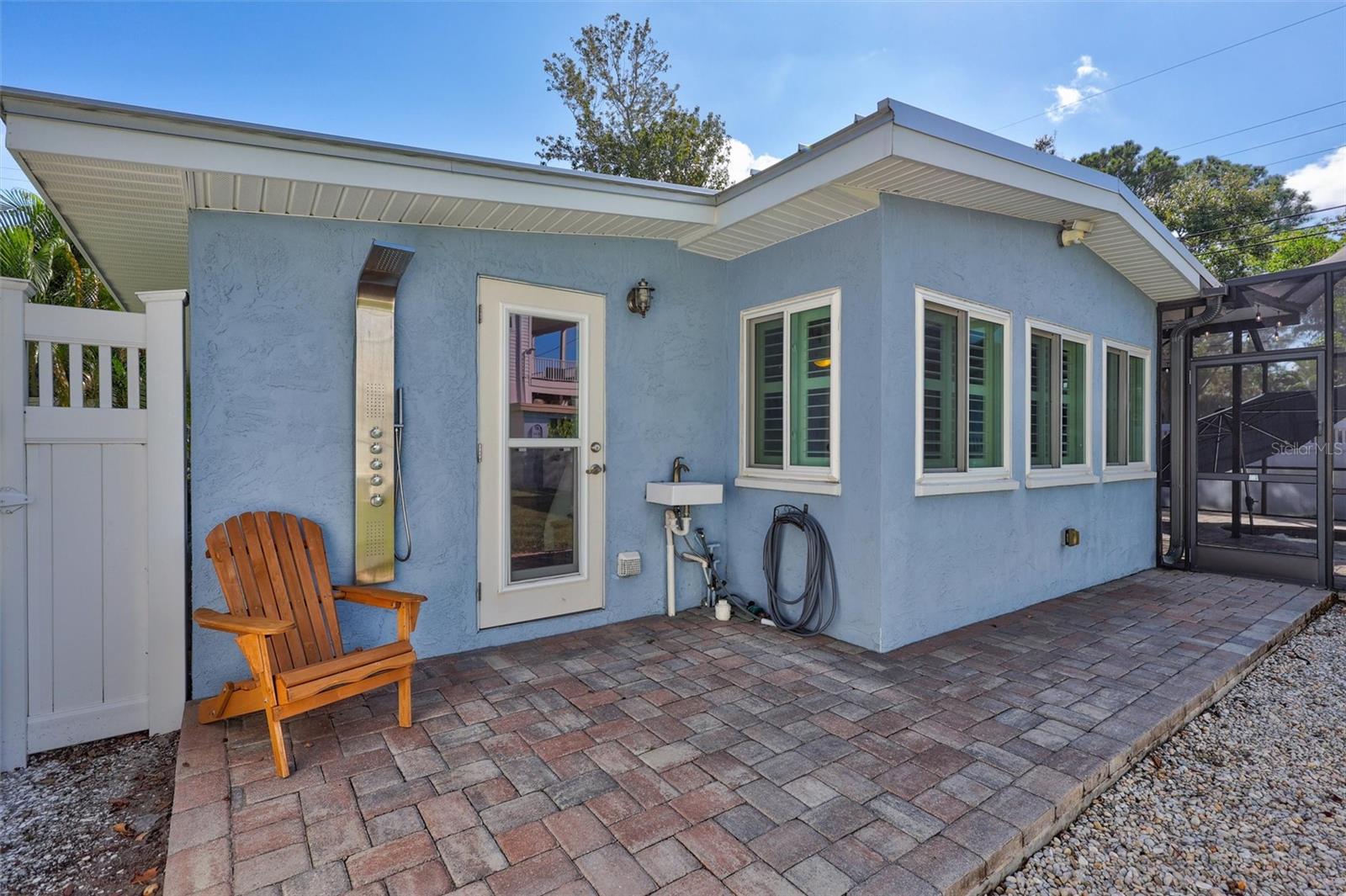 Come home to Crystal Beach — a charming, golf cart–friendly waterfront community where neighbors gather to watch breathtaking sunsets by the shore. This beautifully updated home has been completely transformed and is move-in ready. Step inside to an inviting open floor plan featuring plank tile flooring throughout, fresh interior paint, custom lighting, and a stunning wood plank ceiling. Enjoy peace of mind with hurricane-impact windows, solid block construction, a metal roof, and a brand-new AC system installed in 2023. Plus, new solar panels (fully paid off!) efficiently heat the sparkling saltwater pool, helping you relax and unwind in your private backyard oasis. The chef’s kitchen is a showstopper, offering bar seating, stainless steel appliances, granite countertops, and custom wood cabinetry. Both bathrooms have been tastefully remodeled with elegant tiled showers, glass doors, and brushed nickel rain shower heads. The primary suite features a walk-in closet and stylish barn doors for both the bedroom and bathroom, while the second bedroom (also with a barn door) currently serves as a cozy additional living area with direct pool access. The indoor laundry room is spacious and has access to the large fenced back yard. Step outside to your screened lanai and enjoy the heated saltwater pool, outdoor shower with hand-held rain shower and sink, a fully fenced yard, and detached storage shed—plus plenty of space for extra parking. The home features an additional parking pad in the rear of the home accessed by the alley, which is the perfect spot for the RV, Boat or extra cars. The block shed is equipped with electric and is perfect to store all your lawn tools and bikes, or to create your mini-workshop. The front pavered driveway is beautiful and spacious, and additional parking is also in the front of the home on the shelled drive. This incredible home is located just steps from the water and minutes from local dining and shops. There is an OPTIONAL HOA (Crystal Beach Community Association) with fees of just $30 per year, which hosts numerous events throughout the year for the community. Crystal Beach is the perfect location to launch your paddle boards, take in the sunset, meet up with friends, and enjoy the Live Oak park located across from the water. The community will soon have a new Fishing pier which is currently being re-built. Zoned for great schools including Ozona Elementary, Palm Harbor Middle and Palm Harbor University. Whether you’re looking to downsize, find your perfect winter retreat, or invest in a property that can be leased short or long term, (as there are no rental restrictions here!) this Crystal Beach gem checks every box.