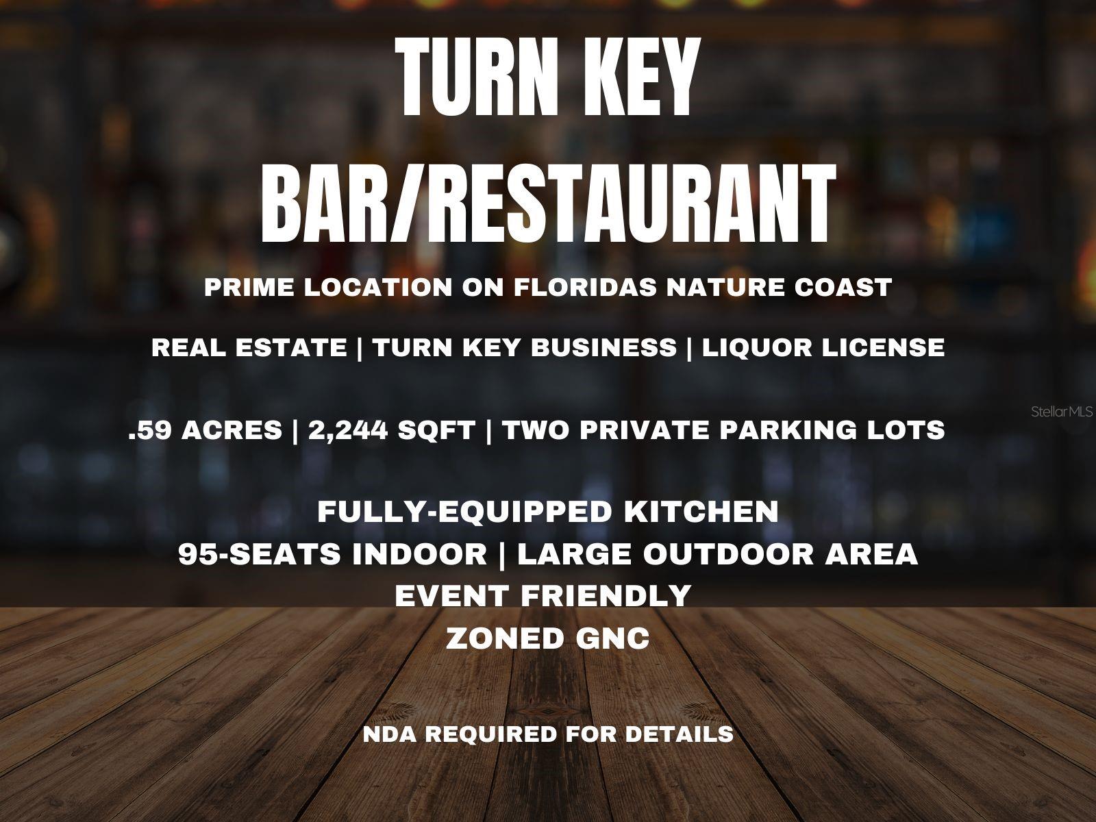 Discover the perfect chance to own a thriving restaurant and bar in the heart of Florida's bustling Nature Coast, renowned for its small-town charm. This prime Gulf Coast location features a fully-equipped restaurant, a 16-top horseshoe bar, an 80-seat dining area, and a large outdoor dining area. The property, situated on a spacious 0.59-acre lot, includes two private parking lots for overflow parking, ensuring ample space for your patrons. The sale includes both the land and the business, along with a valuable liquor license, offering a comprehensive 2,244 sq ft facility with plenty of room for hosting events. Due to the confidential nature of this sale, interested buyers are required to sign a Non-Disclosure Agreement to access detailed information, including financial documents and equipment lists. Don't miss this incredible opportunity to step into a ready-made business in one of Florida's most desirable locations.