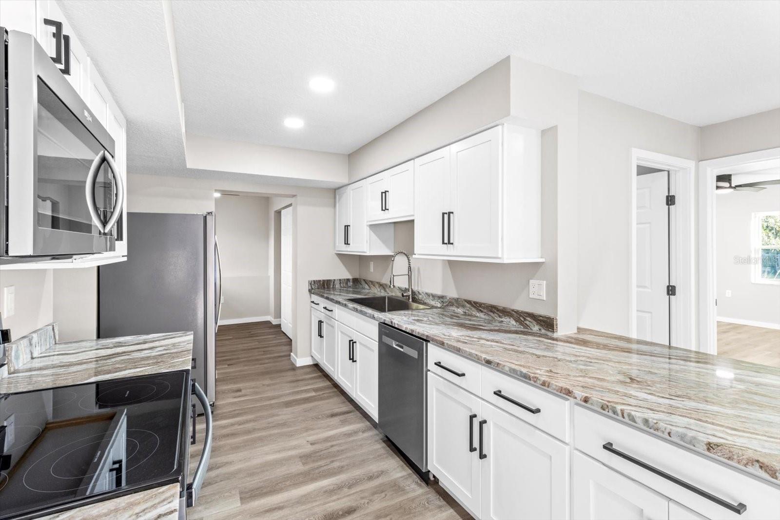 INVITING PROMISES OF TIMELESSNESS! SELLER OFFERING $5,000 TOWARDS CLOSING COSTS & PREPAIDS! Home Appraised OVER List Price! This is the moment for this 4 BD/2 BA Midcentury Transitional to shine; showcasing a traditional, classic exterior w/ dramatic linear lines, yet w/ an interior that features all the modern conveniences & functionality of today. The low, flat profile is an eye catcher, w/ the NEW FLAT ROOF & wide extension of the eaves. The freshly painted exterior & NEW dual paned, double hung windows complete the look. The front entrance expresses the spirit of the entire house...BEAUTIFUL & HOSPITABLE. Once inside, behold a COMPLETELY RENOVATED & FRESHLY PAINTED, 1969sqft OPEN FLOOR PLAN. The bright, spacious living/dining room combo already fulfills the inviting promises of the exterior, especially w/ the GIANT picture window, which is A MIDMOD MUST for bringing the outside in. The NEWLY UPDATED KITCHEN boasts NEW: white shaker cabinets, European Bar pulls, granite tops, S/S appliances, & breakfast bar. TWO NEWLY UPDATED BATHROOMS feature NEW vanities, granite tops, toilets, sinks, matte black plumbing fixtures & accessories, and sleek, marble patterned tile surrounds w/ accent borders. The NEW: luxury vinyl planking, recessed lighting & ceiling fans throughout add the finishing touch. The more family & guests the merrier, w/ 4 ample sized bedrooms, a flex/family room & office/workstation space w/ large pantry/storage closet off the kitchen. Fenced Backyard a plus! NO HOA & NO DEED RESTRICTIONS! Nestled on a .26-acre corner lot, right in the HEART of the CITY of CRYSTAL RIVER, this EXTREMLY DESIRABLE LOCATION is only 2 blocks from The Crosstown Trail. This paved, lighted walking/biking path takes you past the historic Crystal River train depot & continues for just over a mile through the city. Enjoy the 15-min walk to Downtown Crystal River for shopping, dining & schools nearby. Hunter Springs Beach/Park & Three Sisters Springs is 1.5 miles away for boating, fishing, kayaking, paddleboarding & SWIMMING WITH THE MANATEES! Also, a 1 yr HOME WARRANTY for PEACE OF MIND is OFFERED as a GIFT to the Buyer!