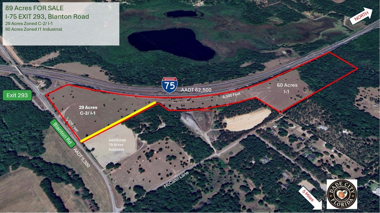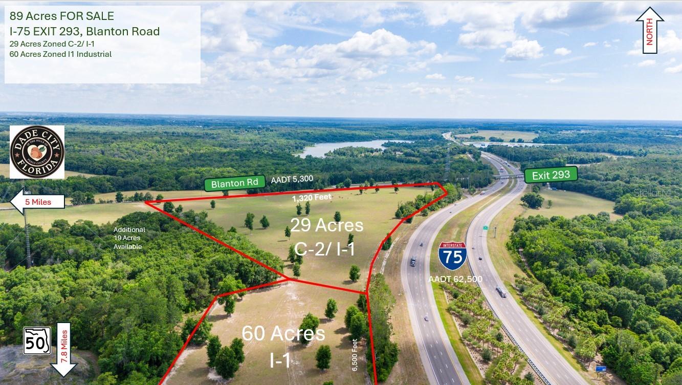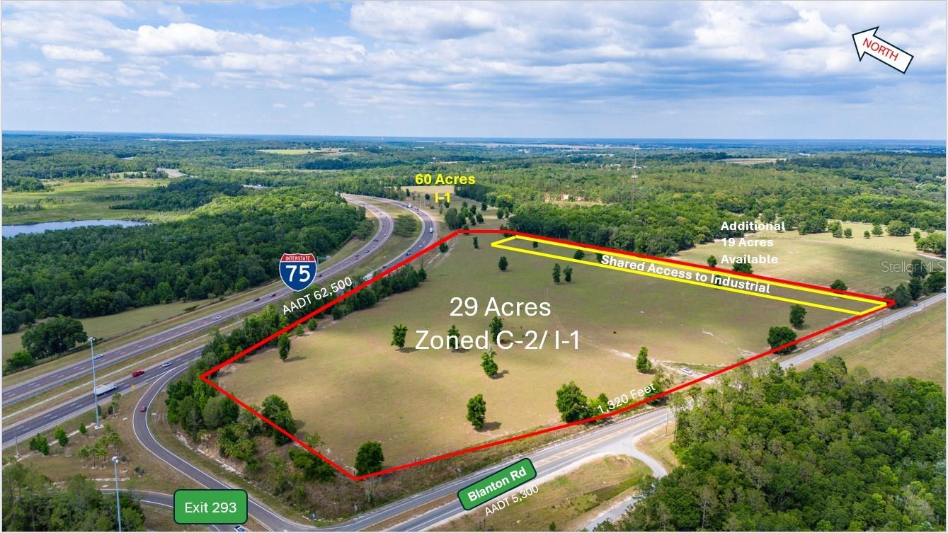 Welcome to an exceptional opportunity to acquire 89 acres of strategically located land along the bustling Interstate 75 corridor. This expansive property offers a perfect blend of 29 acres zoned C-2 (Commercial) and 60 acres zoned I-1 (Light Industrial), catering to a wide range of development possibilities. Key Features: Location: Situated directly along Interstate 75, providing unparalleled visibility and access for commercial and industrial ventures. Zoning: 29 acres zoned C2 (Commercial) for retail, service-oriented businesses, and mixed-use developments. 60 acres zoned I-1 (Light Industrial) suitable for manufacturing, warehousing, distribution centers, and industrial parks. Transportation Access: Proximity to Interstate 75 facilitates efficient transportation and logistics, enhancing connectivity to regional and national markets. Investment Potential: Ideal for investors, developers, and businesses seeking to capitalize on the area's economic growth and strategic location. Frontage: Over 6,500 linear feet of frontage on I-75 and 1,320 linear feet of frontage on Blanton Road. Ideal Uses: Retail Centers Hotels and Hospitality Office Parks Light Manufacturing Distribution Warehouses Logistics Centers Community: Located in a thriving economic region with a growing population base, ensuring a robust consumer market and ample workforce availability. Don't miss out on this rare opportunity to secure a significant parcel of land with versatile zoning options in a highly desirable location. Whether you are planning to establish a retail destination, industrial facility, or mixed-use development, this property offers the space and infrastructure to support your vision. Contact us today to schedule a tour and explore the potential of this prime Interstate 75 land opportunity.