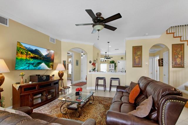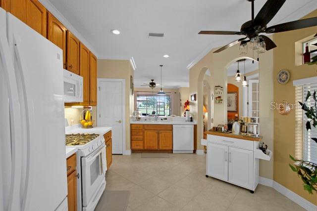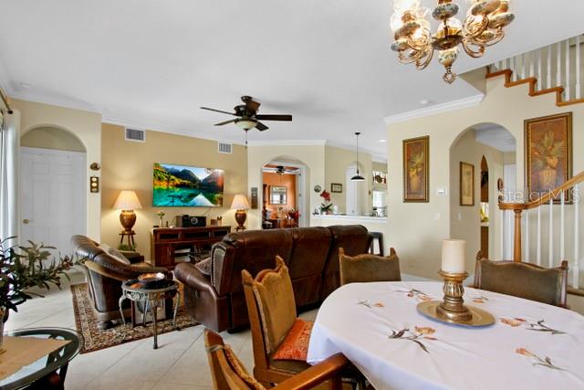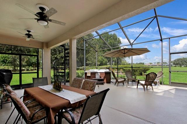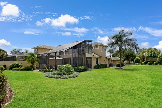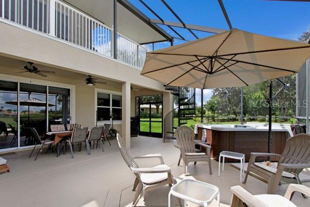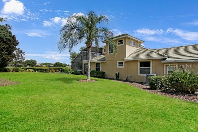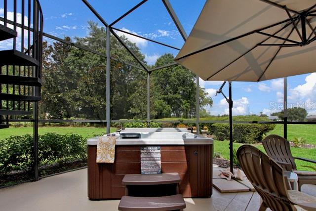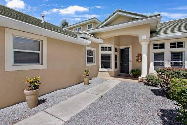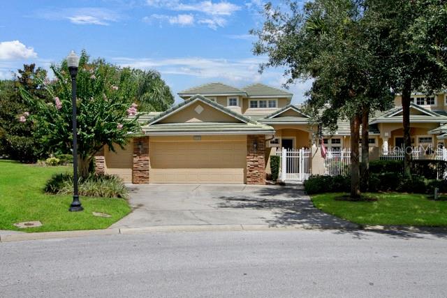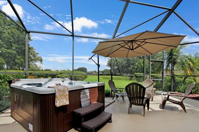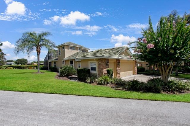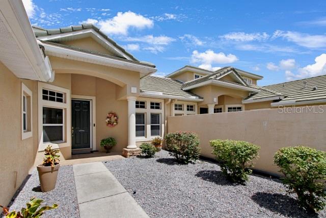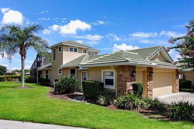 RARE OPPORTUNITY to own a one-of-a-kind 3-bed, 3-bath villa in the prestigious Lake Jovita Golf & Country Club. Situated on one of only two oversized lots in the Heathers section, this home offers breathtaking sunsets and panoramic views of the North Course. A gated courtyard, stacked stone accents, and a brand-new tile roof (2025) enhance its curb appeal. Inside, an open foyer leads to an oversized screened lanai with a hot tub and stunning golf course views. Architectural details include crown molding, arches, niches, and accent walls. A versatile flex space with tray ceilings and transom windows can be used as a formal dining room, library, office, bar, or fourth bedroom. The bright living and dining areas feature large windows and sliding glass doors. The kitchen boasts 42” wood cabinets, Corian countertops, a Kohler sink, a GE Profile gas range, a pantry with extra shelving, and updated appliances including a refrigerator and dishwasher (2023) and a new garbage disposal (2025). The private owner’s suite offers direct lanai access and scenic golf course views. The ensuite bath features a large garden tub, walk-in shower, dual sinks, private water closet, and two walk-in closets. A separate guest wing includes a spacious bedroom and full bath. Upstairs, a newly remodeled third bedroom (2025) features new carpet, a closet, an ensuite bath, and a private balcony overlooking the golf course, with a custom spiral staircase leading down to the lanai. Additional features include a new AC system and hot water heater (2023), a two-car garage with built-in storage and golf cart bay, an interior laundry room with extra cabinetry, a Maytag washer and dryer (2023), a whole-house GE Elite water system with reverse osmosis filtration, and a central vacuum system. The HOA covers landscaping, sprinklers, Spectrum cable, exterior painting (scheduled for 2025), and annual roof cleaning. Community amenities include walking trails, a dog run, playground, picnic areas, basketball, tennis, and pickleball courts. The clubhouse offers a top-rated restaurant and bar with golf course views. Conveniently located just one exit north of Wesley Chapel with easy access to shopping, dining, Downtown Tampa, the airport, and just 10 minutes from Mirada Lagoon. Call today for a private showing.