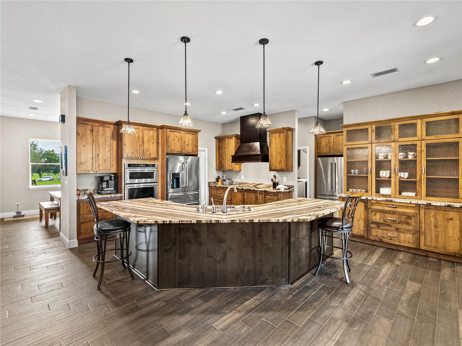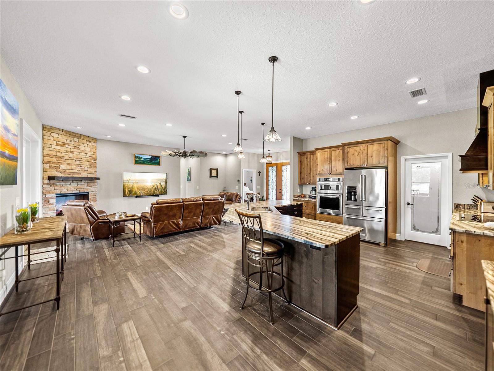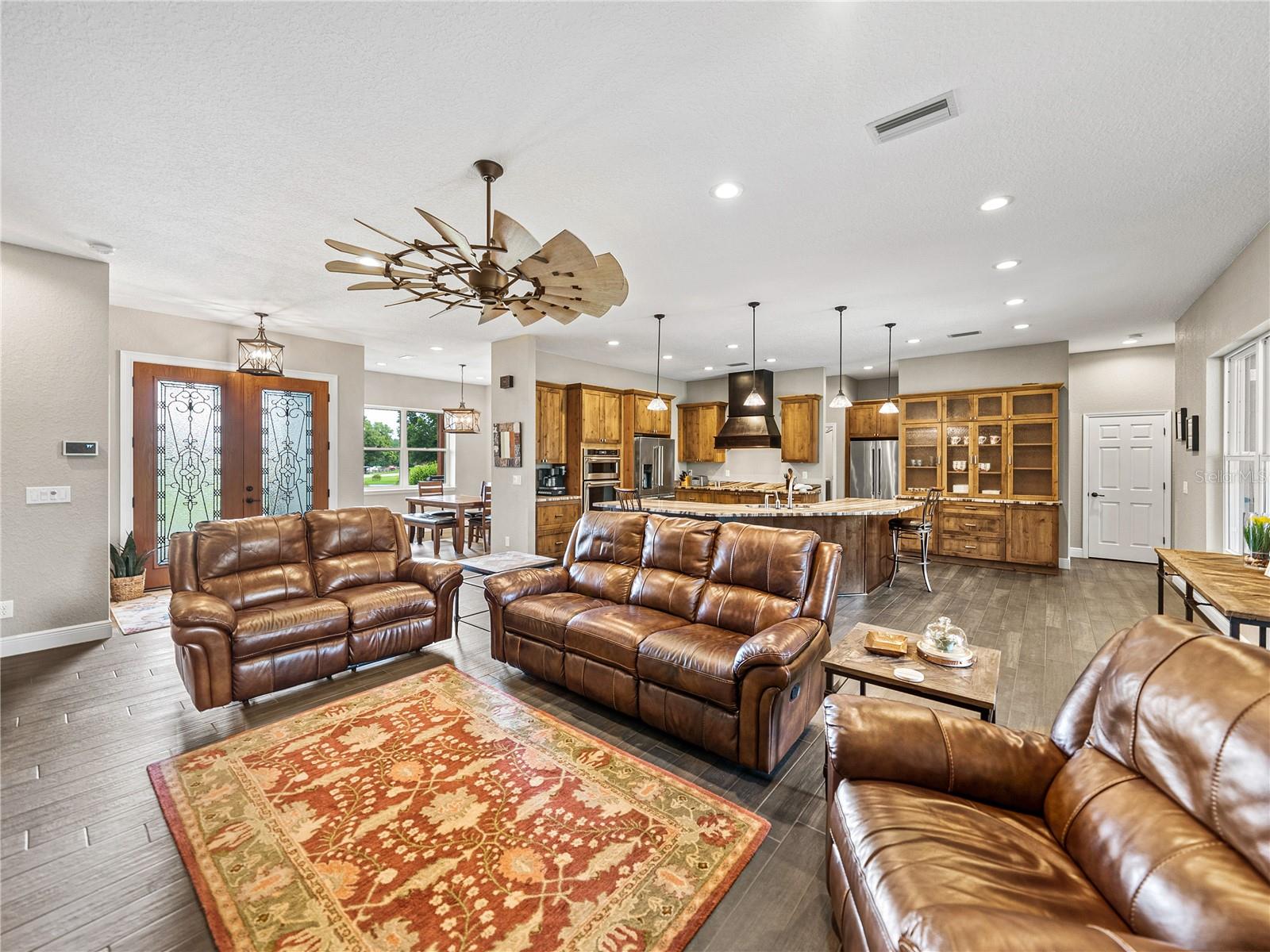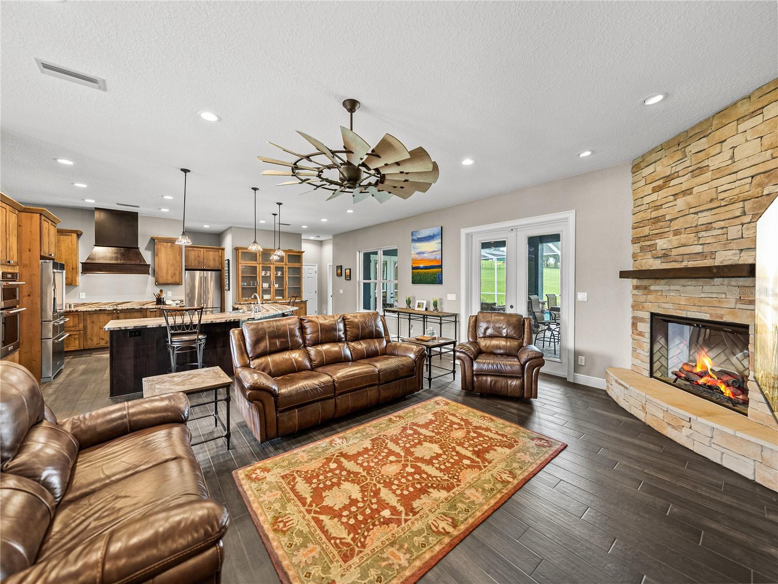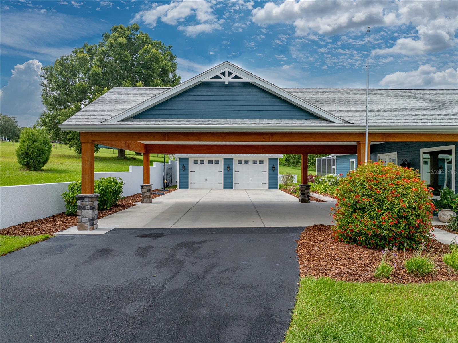 The epitome of luxurious rural Dade City living, this inviting 4 bed, 3.5 bath modern farmhouse pool home rests on 2.87 beautiful acres. Built in 2017, this property boasts a welcoming exterior with a stunning front elevation featuring stone and wood beam accents, a detached 2-car garage, an oversized covered parking area/patio, a lush lawn, lovely landscaping, and a picturesque front porch. Step inside to an open floor plan great room offering sweeping views of the main living areas and the pool beyond. Entertain with ease, enjoying the natural flow from the living room, formal dining room, and kitchen, all adorned with durable plank tile floors. Create culinary works of art from the well-equipped chef’s kitchen featuring leathered granite countertops, custom wood cabinetry, a built-in oven and microwave, 2 refrigerators, a cooktop, range hood, dry bar, walk-in pantry, stylish pendant lighting, and comfortable breakfast bar seating. For added convenience, the oversized covered parking has double-door access to the 26x25 family room, which provides an expansive entertaining space, luxury vinyl plank flooring, and it leads into the kitchen and laundry, allowing for easy cleanup and grocery drop off! Split away from the secondary bedrooms for privacy; the primary suite is a pleasant retreat at the end of the day; relax in the spacious sleeping quarters, head out through French doors to the patio and pool, or indulge in a spa-like experience within the ensuite bathroom offering an oversized soaking tub, a large walk-in shower, dual sinks, and a water closet. Two great-sized walk-in closets add extra storage space! Three guest bedrooms are on the opposite side of the home, each with a generous closet, plush carpeting, and access to a full ensuite bathroom. Live the ideal Florida lifestyle relaxing poolside under the covered patio with a bar area and seating or on the paver pool deck, enjoying the serene views of one of Dade City’s most desirable areas. Several quality finishes and upgrades have been completed in this one-of-a-kind home, including upgraded bathrooms with upscale light fixtures and tile work, a half bathroom for guests, a Generac Generator, Hardie Board siding, fresh exterior paint, and a detached 2 car garage with plenty of space to work on cars or store extra items. This location and this construction are truly top-notch. Call us today to privately tour this lovely home!