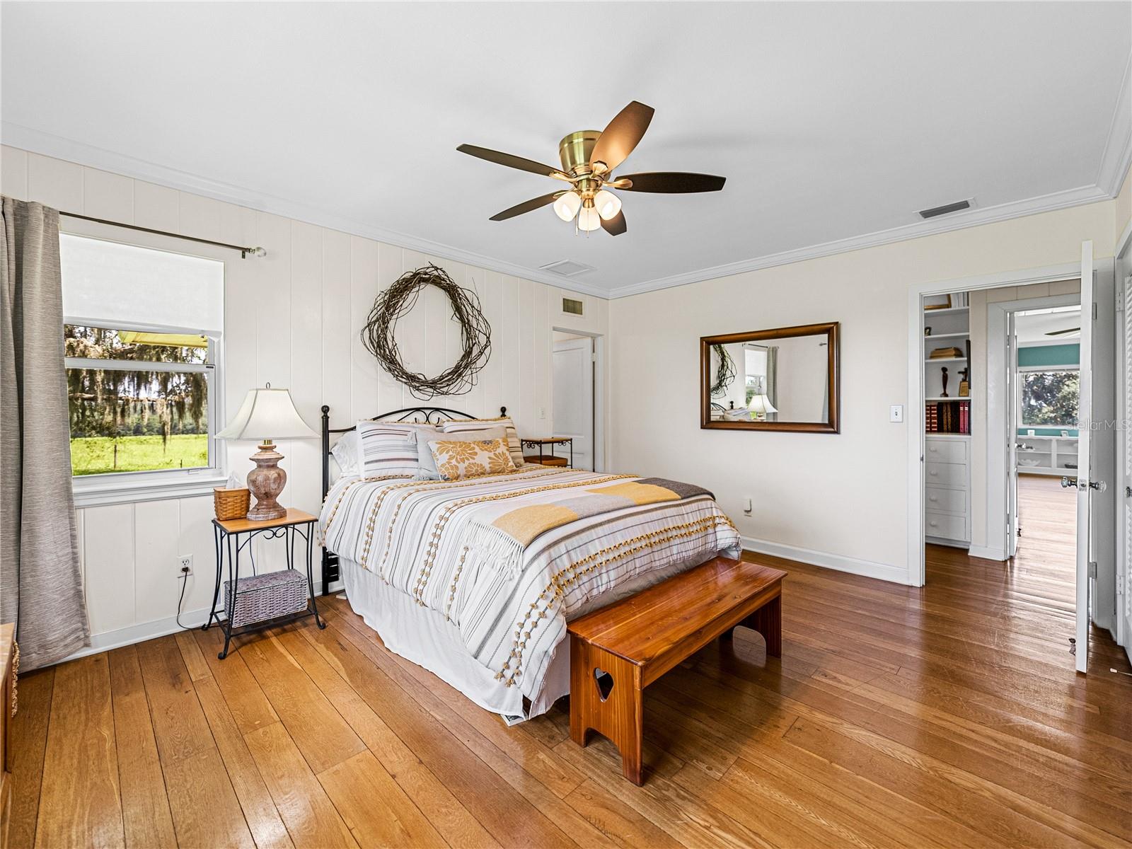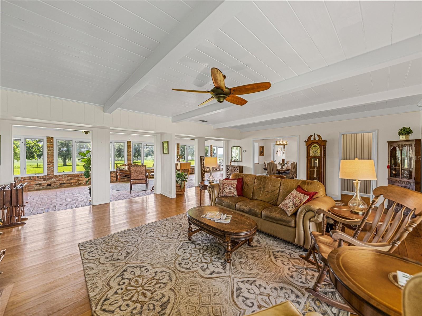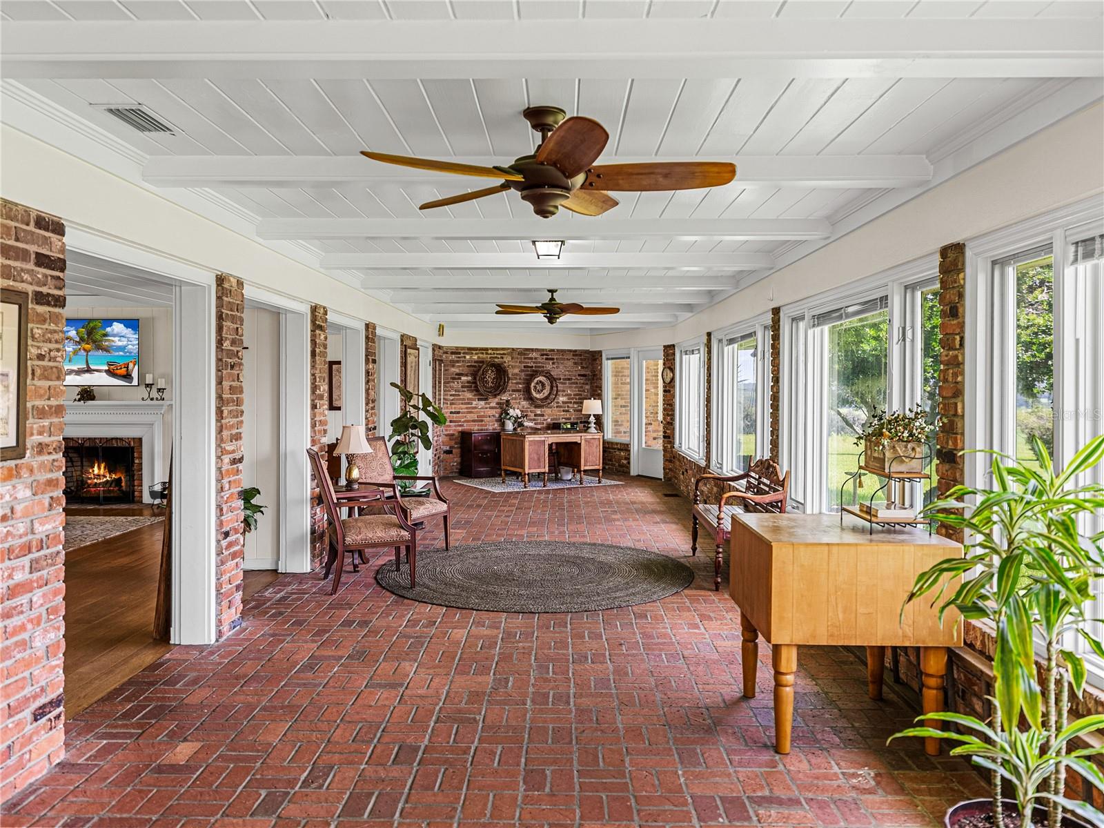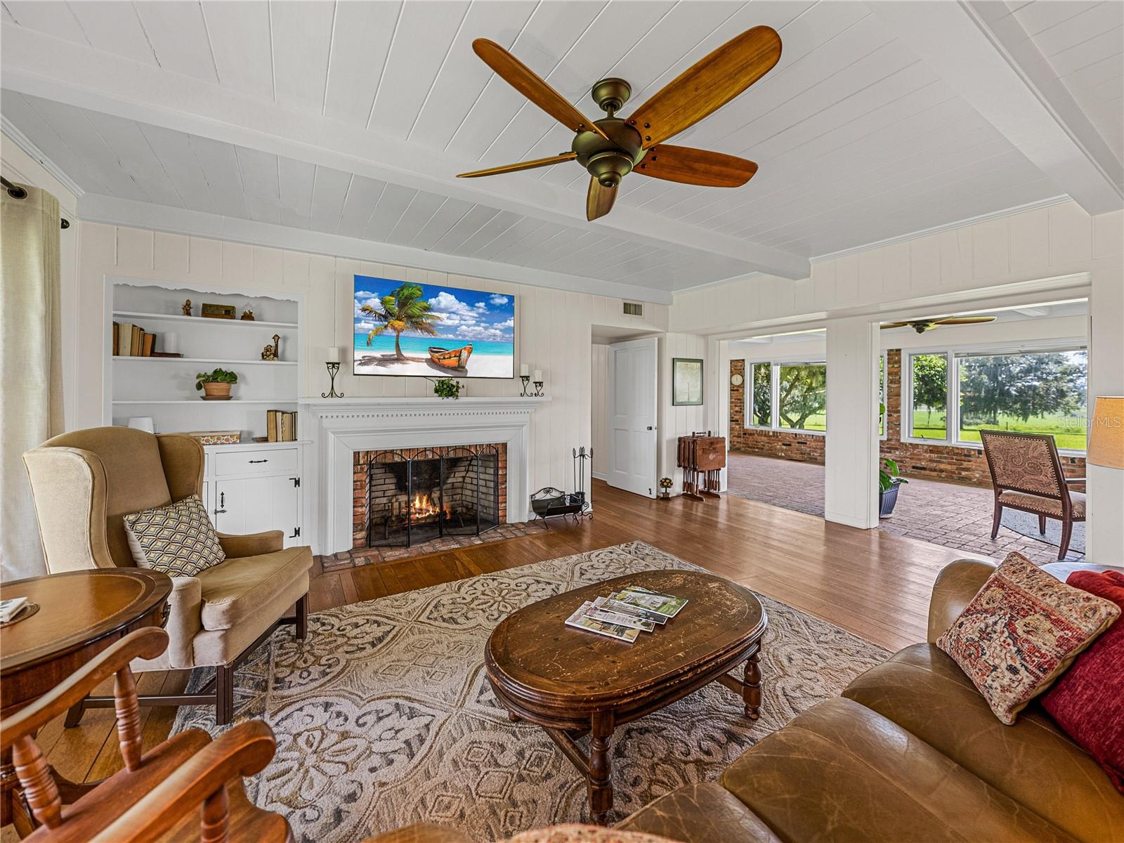 One-of-a-kind Old Florida Hilltop Estate with a sweeping million-dollar view, never before offered to the public. Set on a picturesque 2.26-acre hilltop with panoramic lake vistas in every direction, this Southern gem pairs timeless craftsmanship with an irreplaceable setting. Bricks sourced from the historic Bank of Tampa add a touch of legacy and elegance to the exterior, hinting at the character found throughout the home. Inside, the view takes center stage with dual lake panoramas framed by large casement windows and warmed by architectural details, brick accents, and thoughtfully selected materials. The main residence provides 4 bedrooms and 3.5 baths, while a private-entry in-law suite adds a fifth bedroom, a full bathroom, and its own living room, ideal for multi-generational living or long-term guests. Most of the home showcases original Heart Pine flooring, crown molding, and classic tongue-and-groove paneling. Multiple living spaces offer room to gather, including the inviting living room with a wood-burning fireplace and the expansive 58x12 Sun Parlor with brick flooring, wood beam accents, and a wall of windows that fills the space with natural light. A formal dining room, guest half bath, and private kitchen make this layout well-suited for hosting. The morning sun pours into the primary suite through bay windows, complementing its beautifully remodeled ensuite bath with dual sinks, quartz countertop, walk-in closet with custom organizers, skylight, and walk-in shower. Bedroom 2 is generously sized and connects to a Jack-and-Jill style full bathroom shared with the hallway. Bedroom 3 offers comfortable space and sits near the 4th bedroom, which features two closets and an ensuite bath. Step through the brick-accented courtyard to the private in-law quarters, complete with a spacious bedroom, full bath, and a 14x13 living room. Opportunities like this rarely come to market. This Old Florida hilltop estate combines a commanding setting, timeless materials, and multi-generational flexibility, a truly unique chance to own a historic home with breathtaking views and enduring charm.