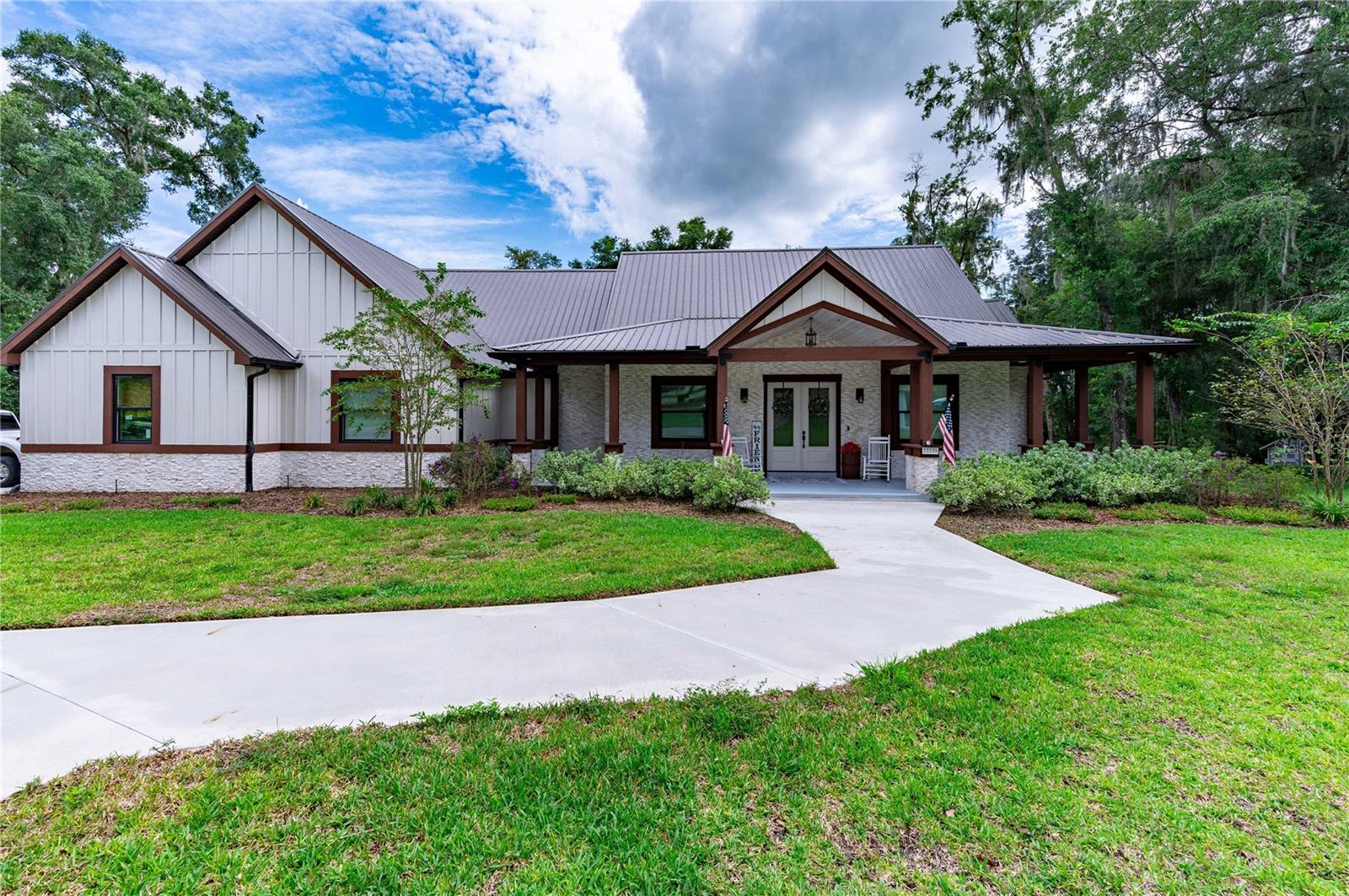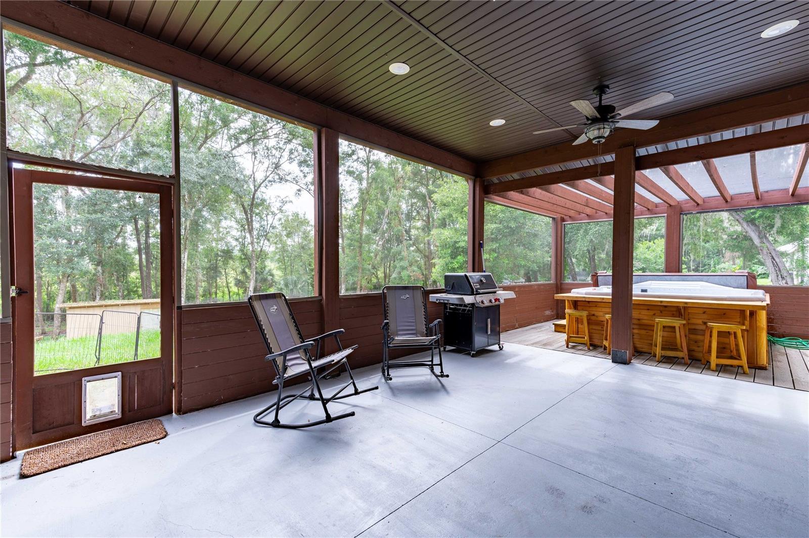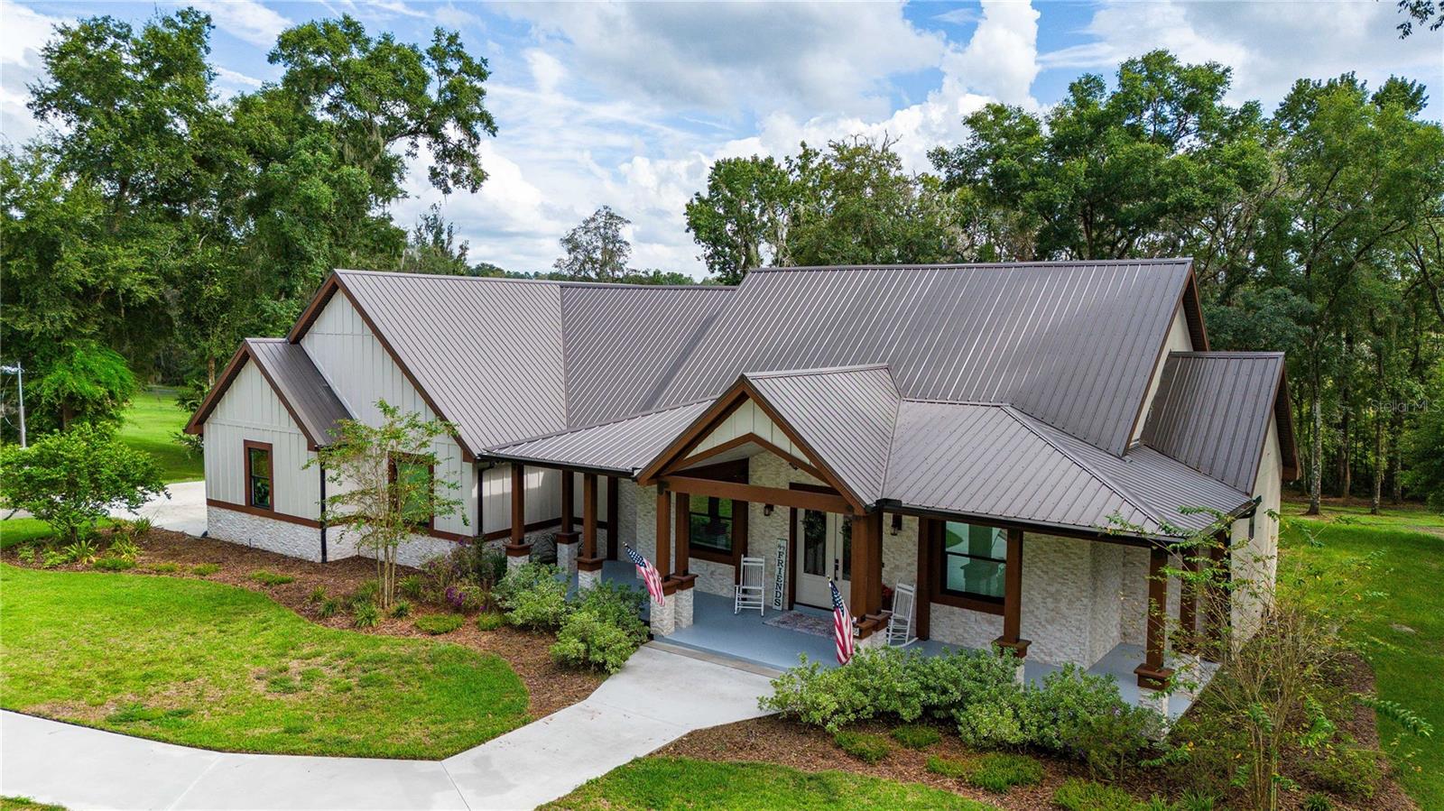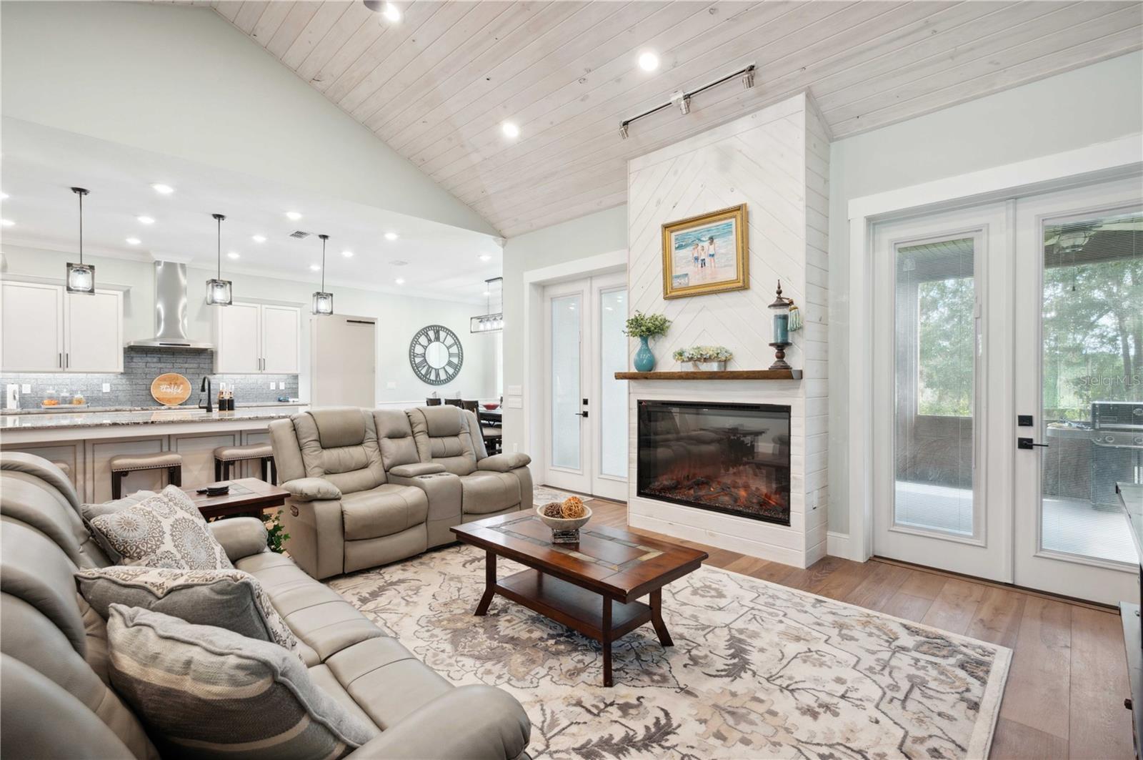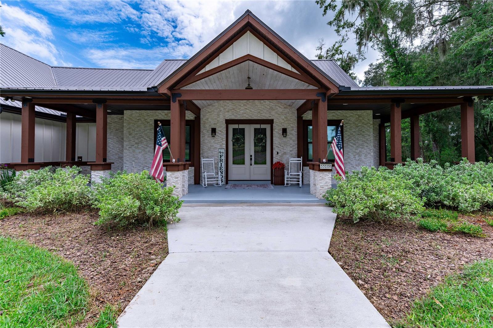 Welcome to this spectacular 3-bedroom, 3-bathroom home set on an impressive 5-acre property with no neighbors behind, offering both privacy and panoramic views of the conservation area. Step into the grand foyer adorned with a coffered ceiling, setting the tone for the luxurious finishes throughout. The kitchen is a chef's dream, featuring granite countertops, a glass backsplash, custom cabinets with under-cabinet lighting, and a true butler's pantry perfect for storing large appliances. The centerpiece is a single slab of granite on the island with breakfast bar seating, hidden storage, and a standalone icemaker. The vaulted whitewashed knotty pine ceiling in the living room offers a rustic charm, complemented by a double-sided electric fireplace that also warms the living room and the screened lanai. The primary bedroom boasts high ceilings, a magnificent custom walk-in closet, and an ensuite bath complete with a soaking tub, a vast shower with double regular AND rainfall showerheads, and dual vanities. Additional features include hardwood flooring, a fireplace, high ceilings, and a flex/office space. Guests enjoy comfortable accommodations with split-bedroom design, jack and jill bathrooms, and custom walk-in closets. Functionality meets luxury in the large laundry room equipped with built-in hampers and a spacious oversized 3-car garage that offers tall attic space—potential for additional living quarters. A screened lanai invites you with an 8 man hot tub, perfect for relaxing in the evenings bug free! The large pole barn will store all of your toys and then some. Every detail in this home has been thoughtfully planned to ensure comfort and luxury. Don’t miss the opportunity to own this exquisite property—contact us today to schedule your viewing!
