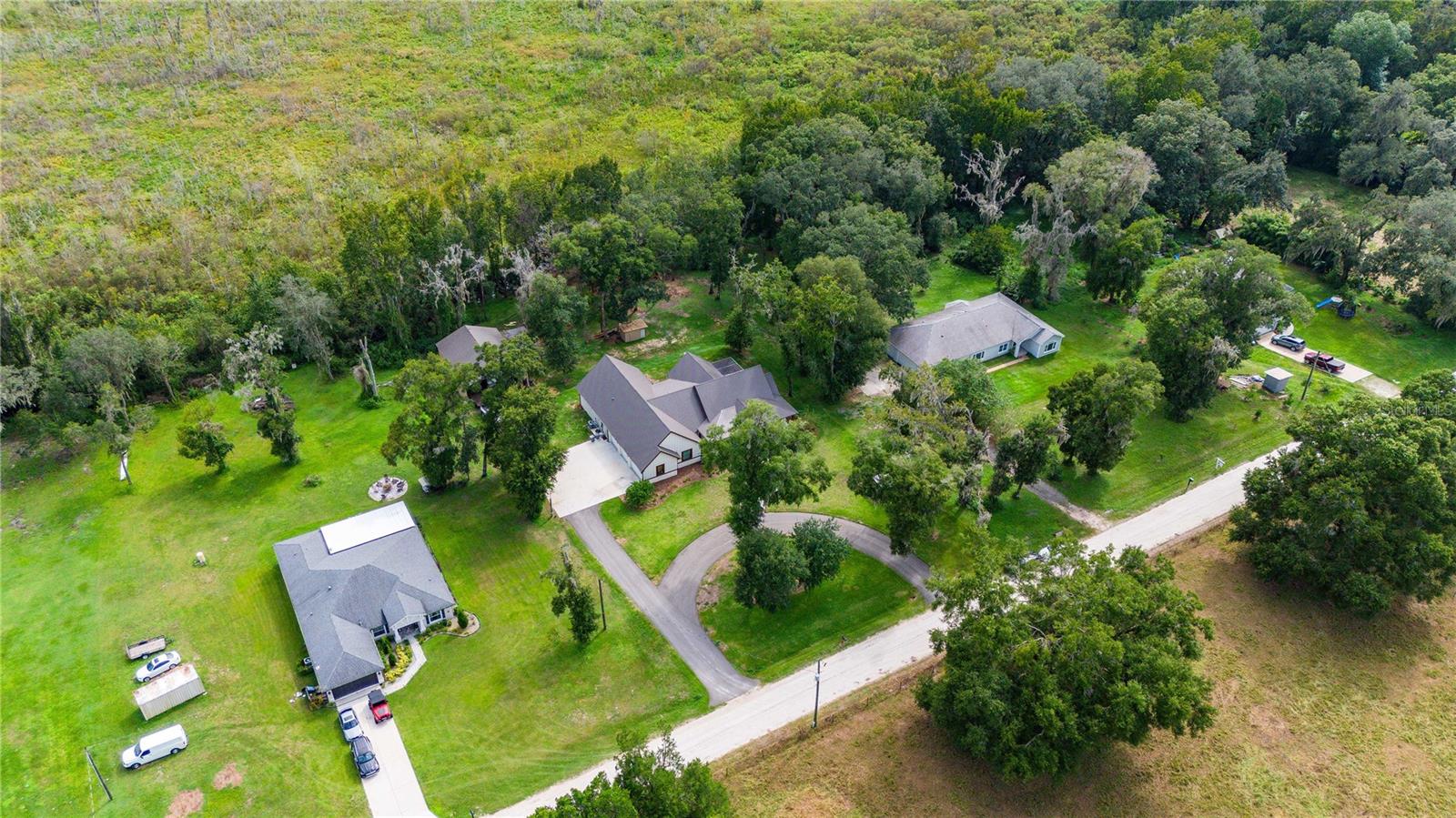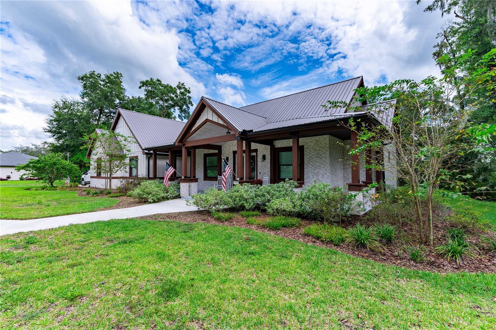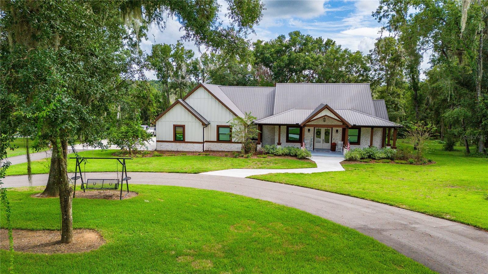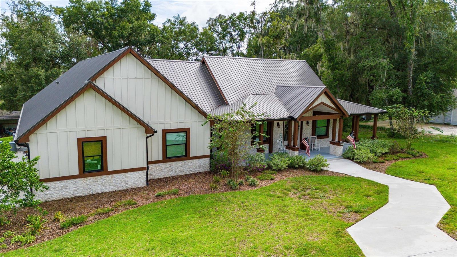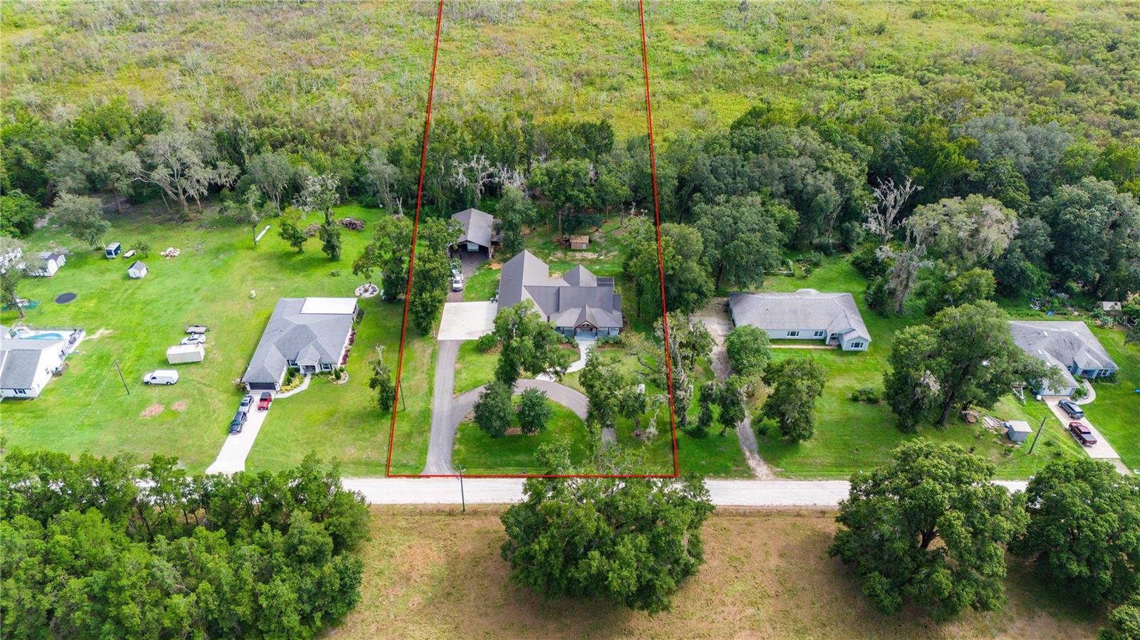 Welcome to this spectacular 3-bedroom, 3-bathroom home set on an impressive 5-acre property with no neighbors behind, offering both privacy and panoramic views of the conservation area. Step into the grand foyer adorned with a coffered ceiling, setting the tone for the luxurious finishes throughout. The kitchen is a chef's dream, featuring granite countertops, a glass backsplash, custom cabinets with under-cabinet lighting, and a true butler's pantry perfect for storing large appliances. The centerpiece is a single slab of granite on the island with breakfast bar seating, hidden storage, and a standalone icemaker. The vaulted whitewashed knotty pine ceiling in the living room offers a rustic charm, complemented by a double-sided electric fireplace that also warms the living room and the screened lanai. The primary bedroom boasts high ceilings, a magnificent custom walk-in closet, and an ensuite bath complete with a soaking tub, a vast shower with double regular AND rainfall showerheads, and dual vanities. Additional features include hardwood flooring, a fireplace, high ceilings, and a flex/office space. Guests enjoy comfortable accommodations with split-bedroom design, jack and jill bathrooms, and custom walk-in closets. Functionality meets luxury in the large laundry room equipped with built-in hampers and a spacious oversized 3-car garage that offers tall attic space—potential for additional living quarters. A screened lanai invites you with an 8 man hot tub, perfect for relaxing in the evenings bug free! The large pole barn will store all of your toys and then some. Every detail in this home has been thoughtfully planned to ensure comfort and luxury. Don’t miss the opportunity to own this exquisite property—contact us today to schedule your viewing!