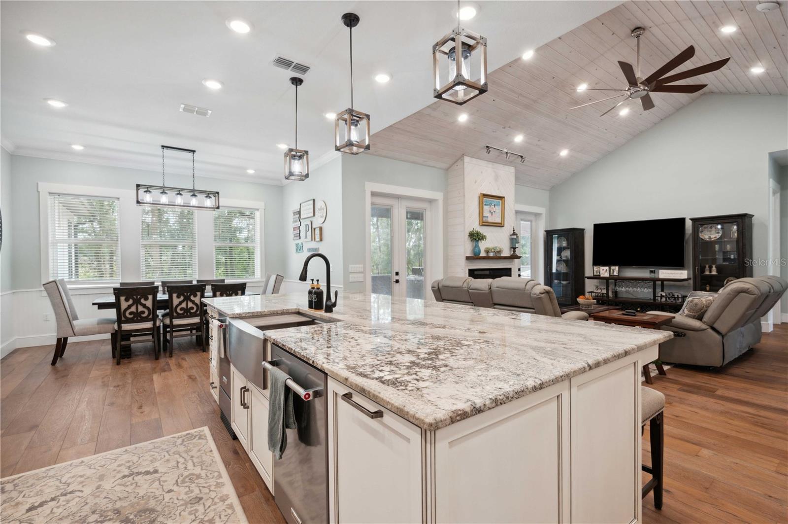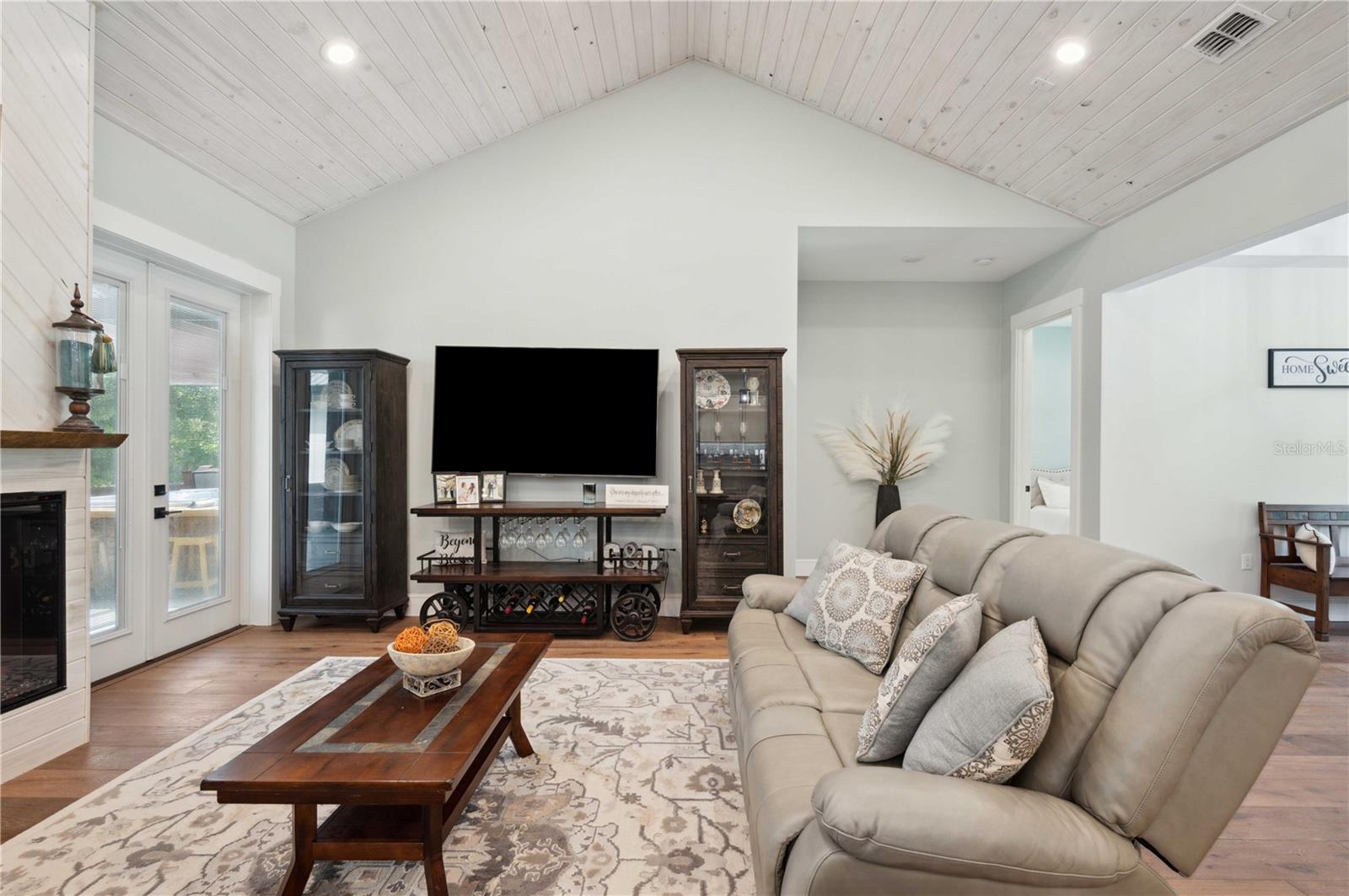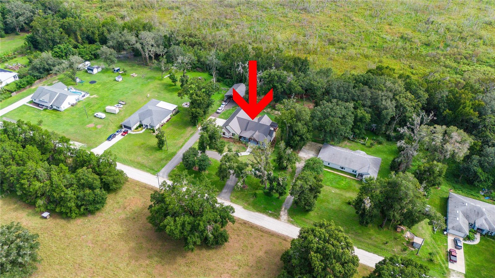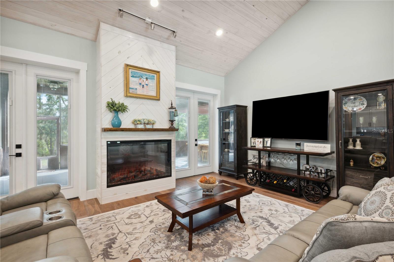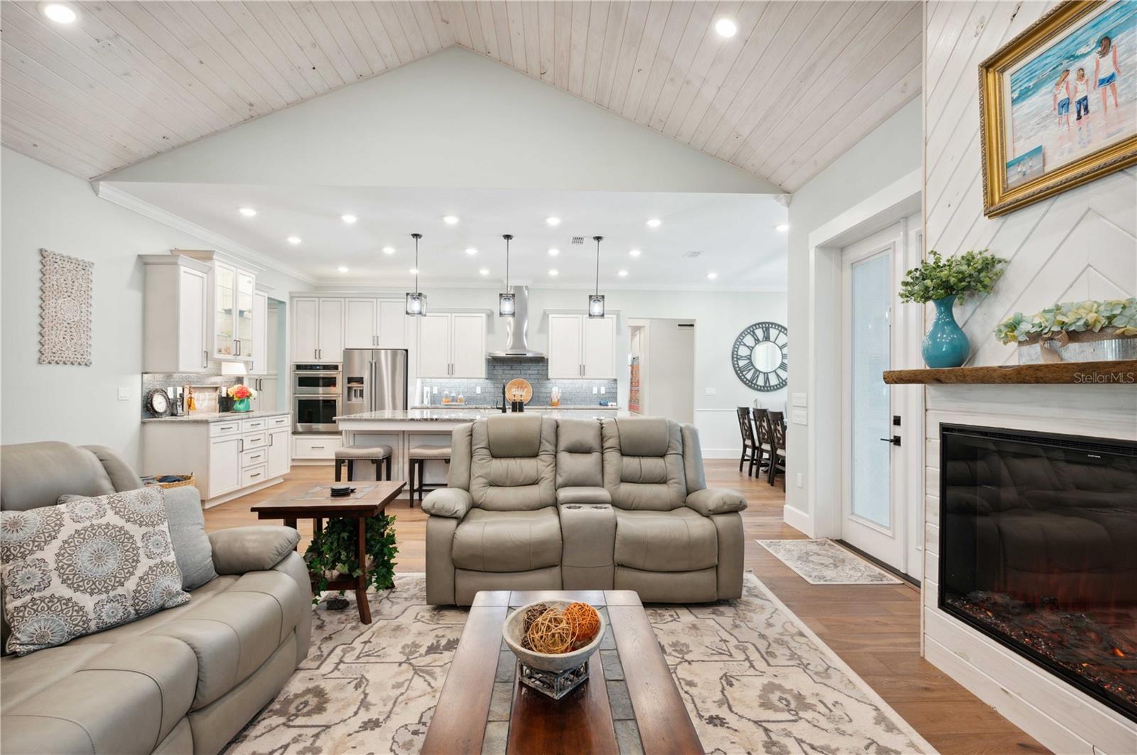 Welcome to this spectacular 3-bedroom, 3-bathroom home set on an impressive 5-acre property with no neighbors behind, offering both privacy and panoramic views of the conservation area. Step into the grand foyer adorned with a coffered ceiling, setting the tone for the luxurious finishes throughout. The kitchen is a chef's dream, featuring granite countertops, a glass backsplash, custom cabinets with under-cabinet lighting, and a true butler's pantry perfect for storing large appliances. The centerpiece is a single slab of granite on the island with breakfast bar seating, hidden storage, and a standalone icemaker. The vaulted whitewashed knotty pine ceiling in the living room offers a rustic charm, complemented by a double-sided electric fireplace that also warms the living room and the screened lanai. The primary bedroom boasts high ceilings, a magnificent custom walk-in closet, and an ensuite bath complete with a soaking tub, a vast shower with double regular AND rainfall showerheads, and dual vanities. Additional features include hardwood flooring, a fireplace, high ceilings, and a flex/office space. Guests enjoy comfortable accommodations with split-bedroom design, jack and jill bathrooms, and custom walk-in closets. Functionality meets luxury in the large laundry room equipped with built-in hampers and a spacious oversized 3-car garage that offers tall attic space—potential for additional living quarters. A screened lanai invites you with an 8 man hot tub, perfect for relaxing in the evenings bug free! The large pole barn will store all of your toys and then some. Every detail in this home has been thoughtfully planned to ensure comfort and luxury. Don’t miss the opportunity to own this exquisite property—contact us today to schedule your viewing!