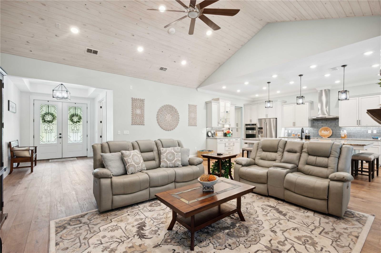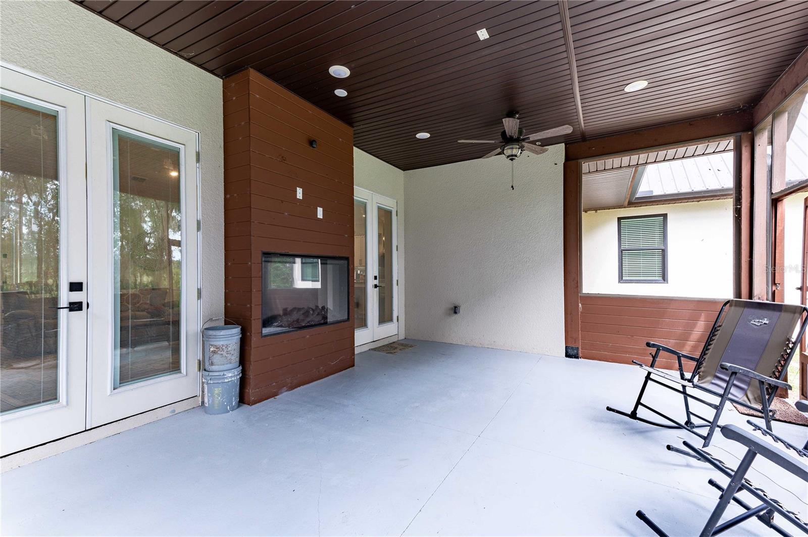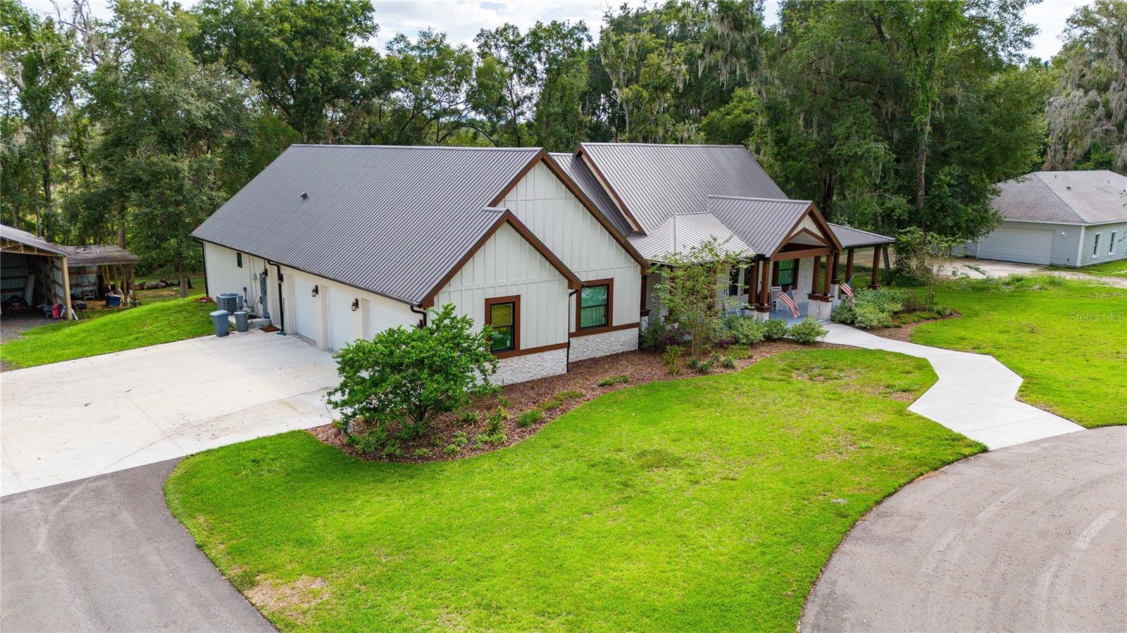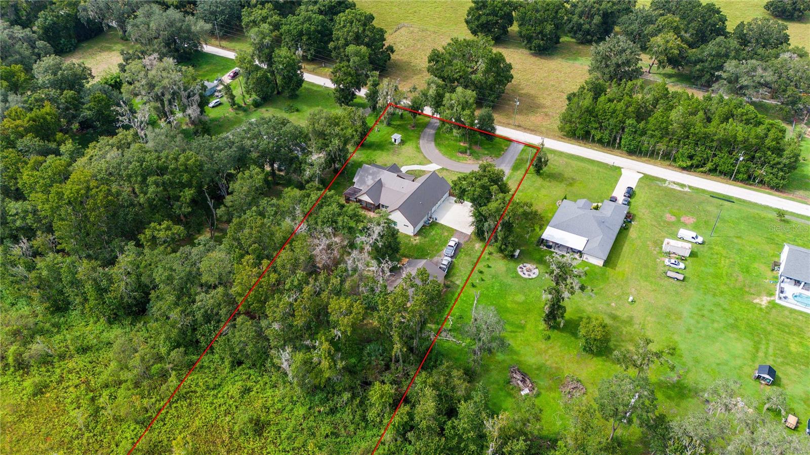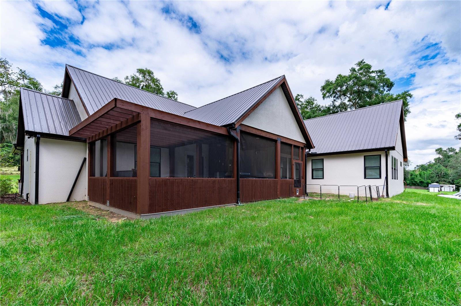 Welcome to this spectacular 3-bedroom, 3-bathroom home set on an impressive 5-acre property with no neighbors behind, offering both privacy and panoramic views of the conservation area. Step into the grand foyer adorned with a coffered ceiling, setting the tone for the luxurious finishes throughout. The kitchen is a chef's dream, featuring granite countertops, a glass backsplash, custom cabinets with under-cabinet lighting, and a true butler's pantry perfect for storing large appliances. The centerpiece is a single slab of granite on the island with breakfast bar seating, hidden storage, and a standalone icemaker. The vaulted whitewashed knotty pine ceiling in the living room offers a rustic charm, complemented by a double-sided electric fireplace that also warms the living room and the screened lanai. The primary bedroom boasts high ceilings, a magnificent custom walk-in closet, and an ensuite bath complete with a soaking tub, a vast shower with double regular AND rainfall showerheads, and dual vanities. Additional features include hardwood flooring, a fireplace, high ceilings, and a flex/office space. Guests enjoy comfortable accommodations with split-bedroom design, jack and jill bathrooms, and custom walk-in closets. Functionality meets luxury in the large laundry room equipped with built-in hampers and a spacious oversized 3-car garage that offers tall attic space—potential for additional living quarters. A screened lanai invites you with an 8 man hot tub, perfect for relaxing in the evenings bug free! The large pole barn will store all of your toys and then some. Every detail in this home has been thoughtfully planned to ensure comfort and luxury. Don’t miss the opportunity to own this exquisite property—contact us today to schedule your viewing!