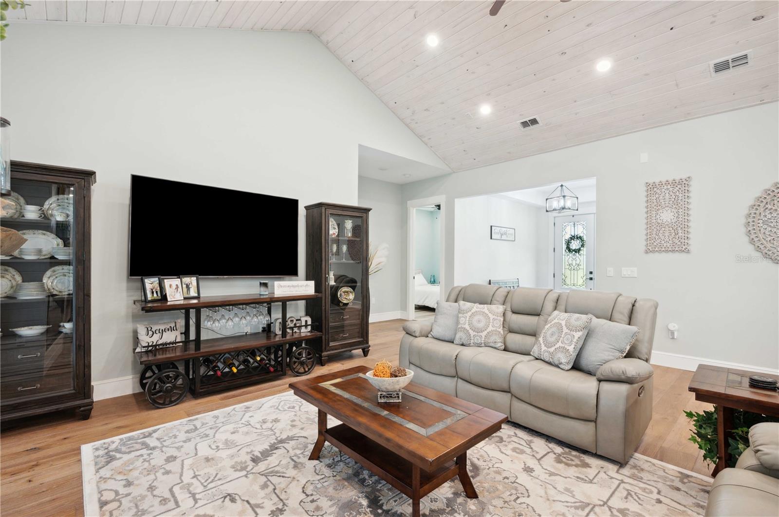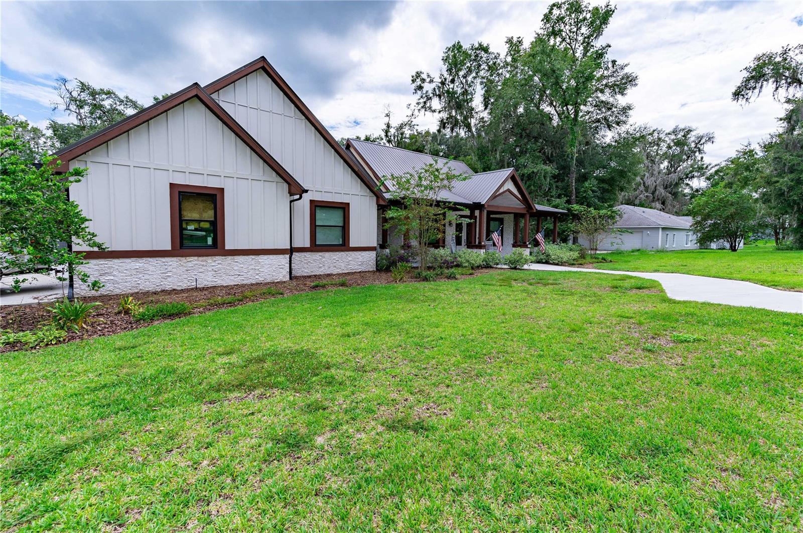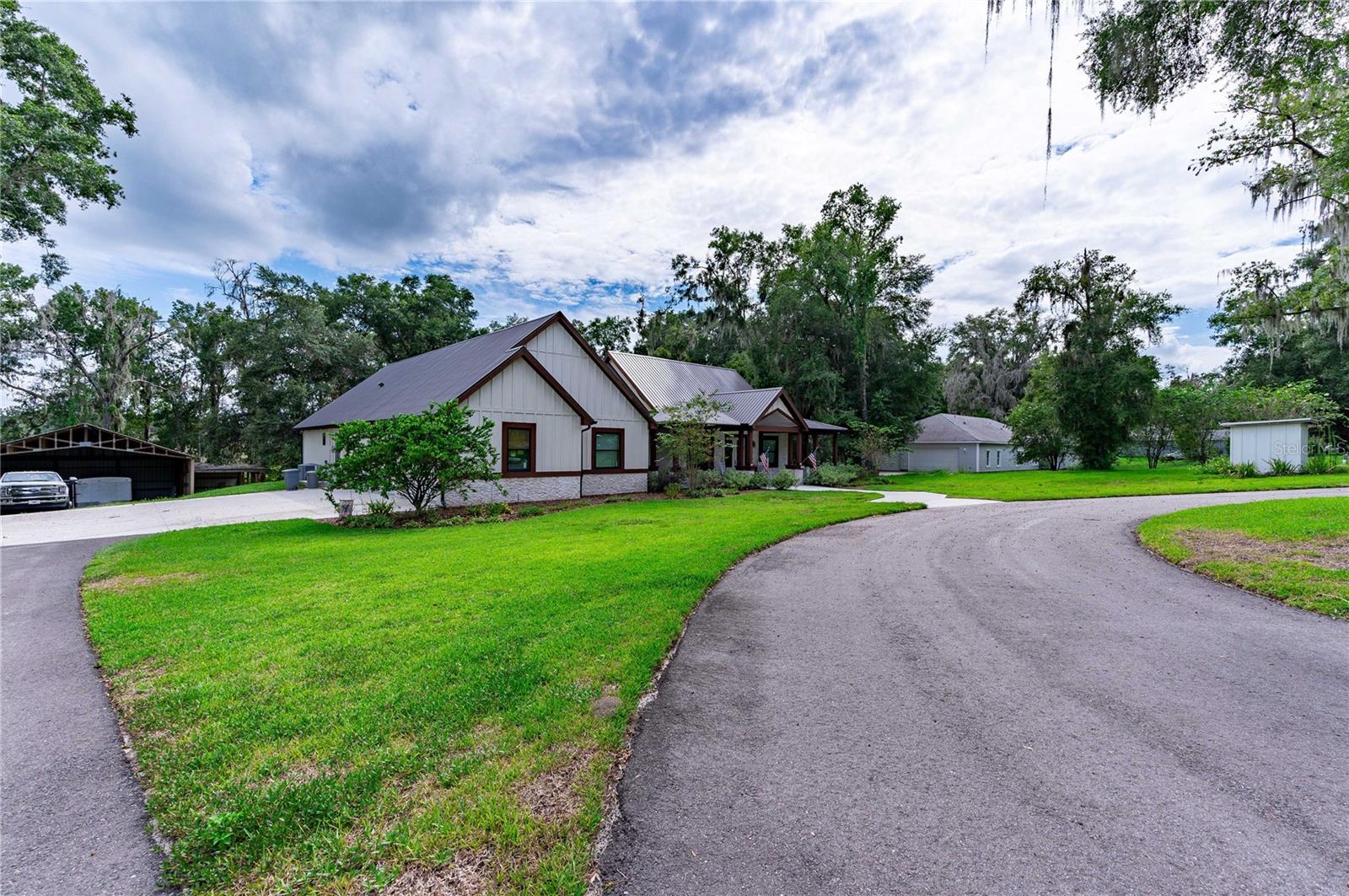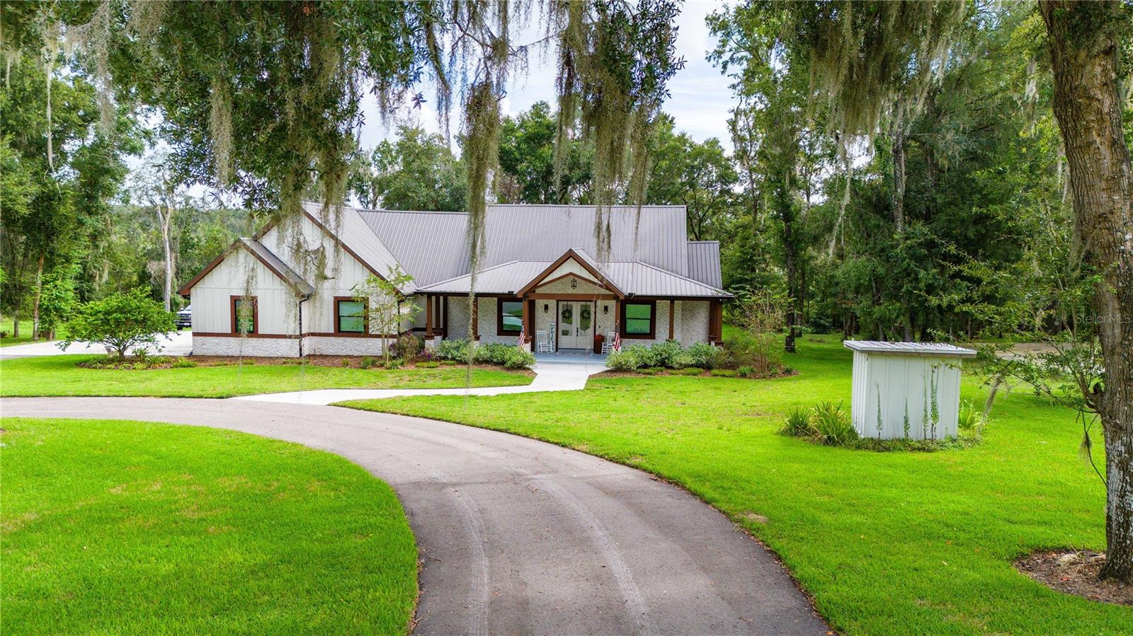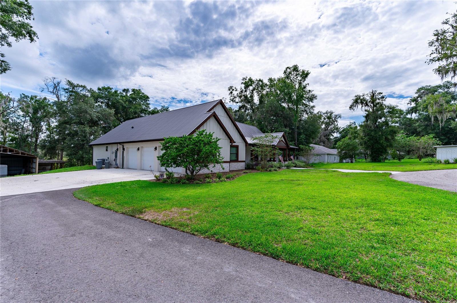Welcome to this spectacular 3-bedroom, 3-bathroom home set on an impressive 5-acre property with no neighbors behind, offering both privacy and panoramic views of the conservation area. Step into the grand foyer adorned with a coffered ceiling, setting the tone for the luxurious finishes throughout. The kitchen is a chef's dream, featuring granite countertops, a glass backsplash, custom cabinets with under-cabinet lighting, and a true butler's pantry perfect for storing large appliances. The centerpiece is a single slab of granite on the island with breakfast bar seating, hidden storage, and a standalone icemaker. The vaulted whitewashed knotty pine ceiling in the living room offers a rustic charm, complemented by a double-sided electric fireplace that also warms the living room and the screened lanai. The primary bedroom boasts high ceilings, a magnificent custom walk-in closet, and an ensuite bath complete with a soaking tub, a vast shower with double regular AND rainfall showerheads, and dual vanities. Additional features include hardwood flooring, a fireplace, high ceilings, and a flex/office space. Guests enjoy comfortable accommodations with split-bedroom design, jack and jill bathrooms, and custom walk-in closets. Functionality meets luxury in the large laundry room equipped with built-in hampers and a spacious oversized 3-car garage that offers tall attic space—potential for additional living quarters. A screened lanai invites you with an 8 man hot tub, perfect for relaxing in the evenings bug free! The large pole barn will store all of your toys and then some. Every detail in this home has been thoughtfully planned to ensure comfort and luxury. Don’t miss the opportunity to own this exquisite property—contact us today to schedule your viewing!