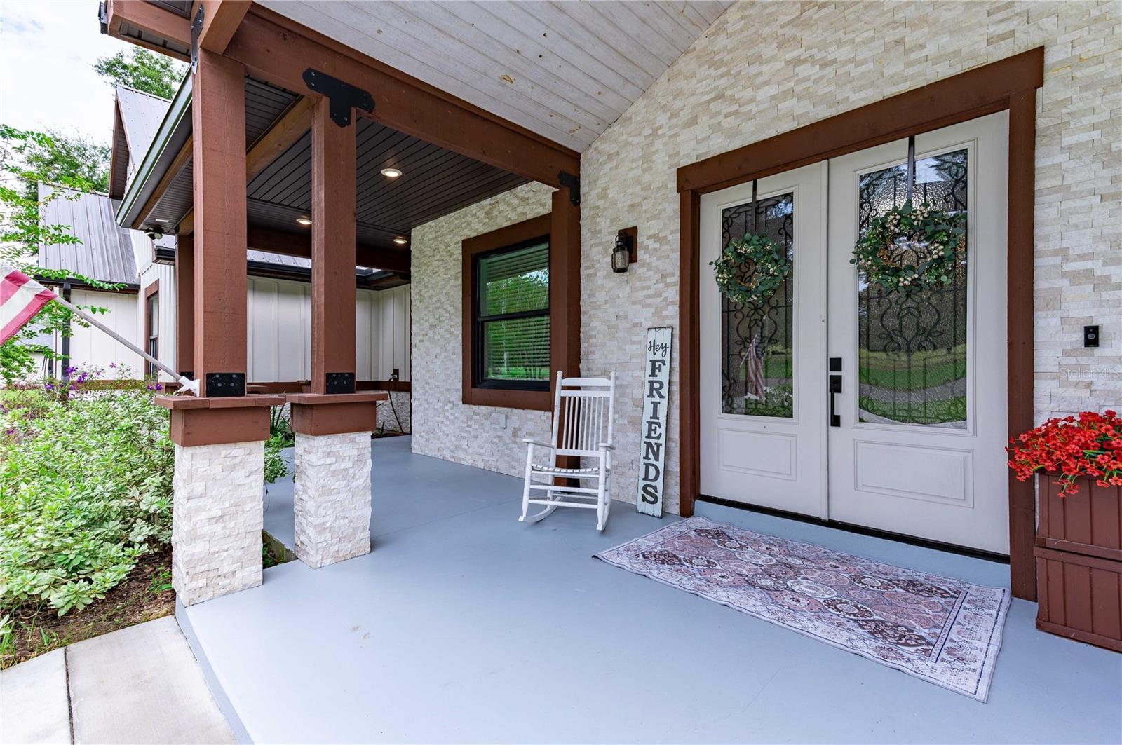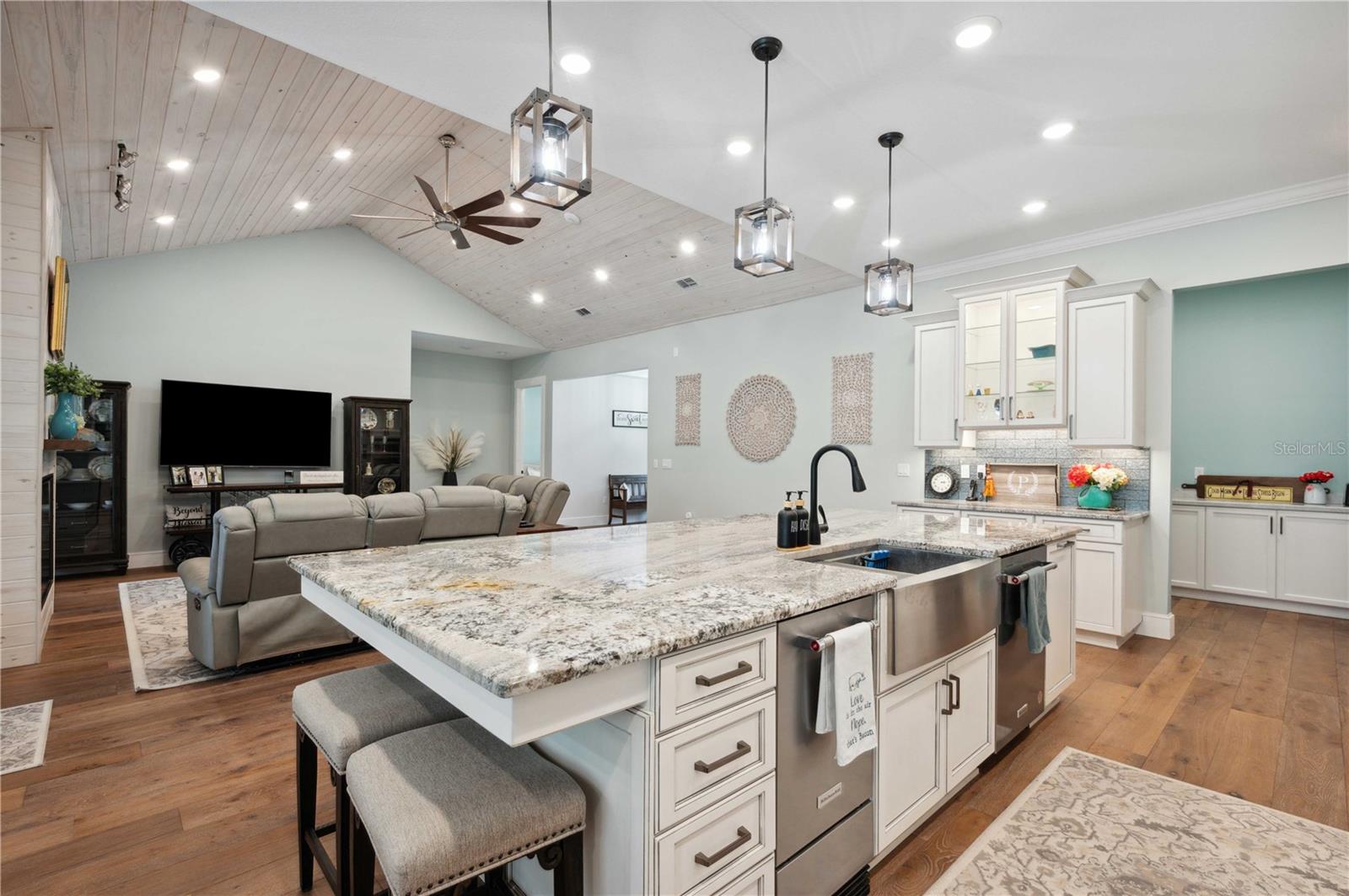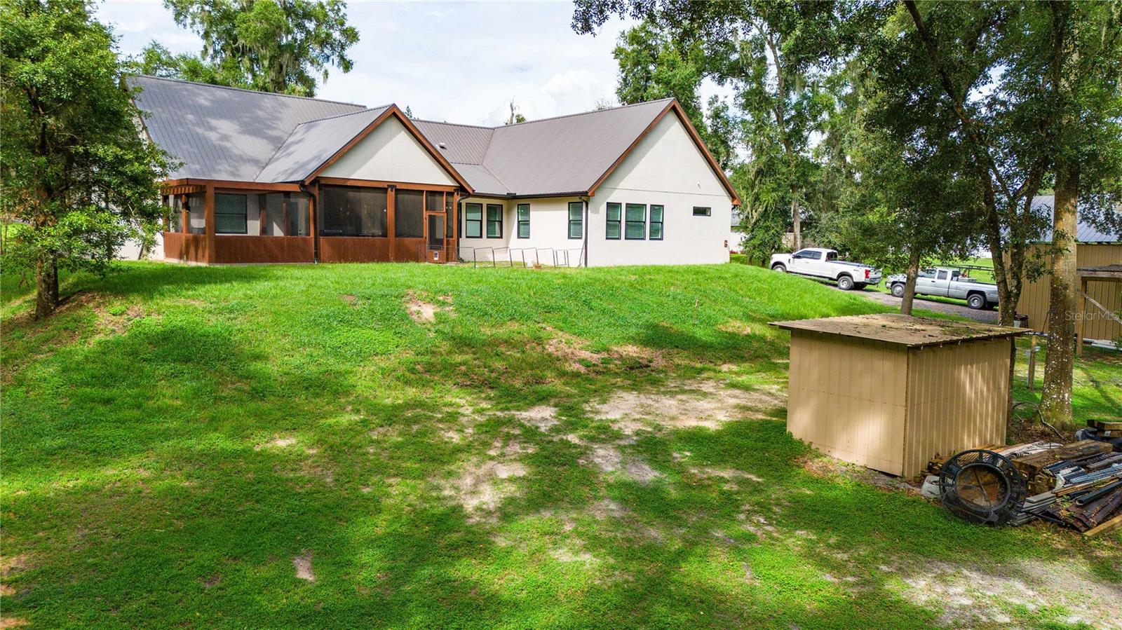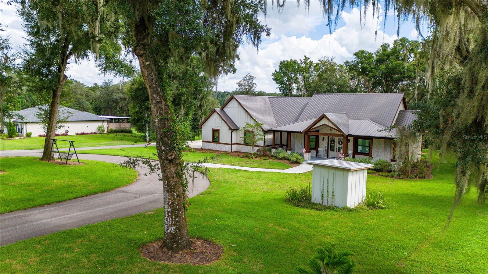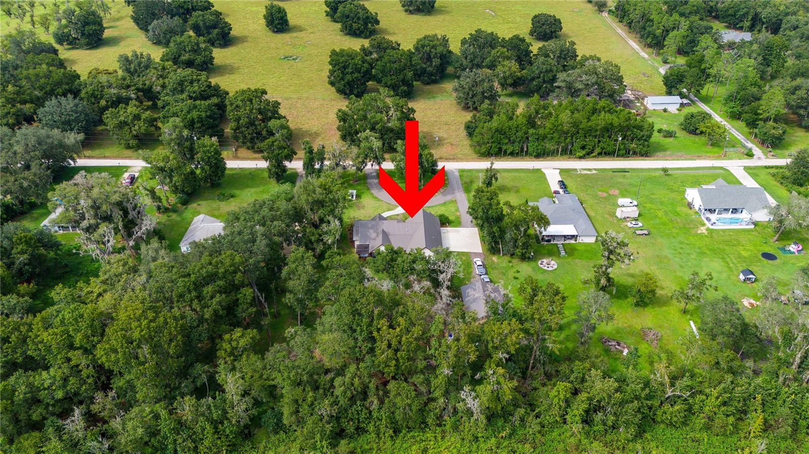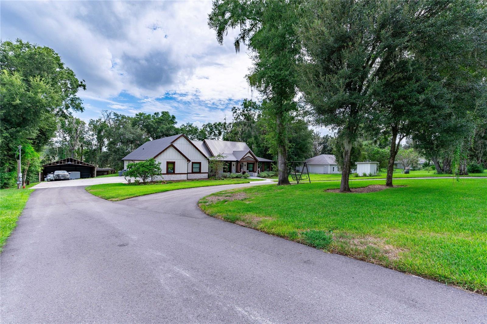 Welcome to this spectacular 3-bedroom, 3-bathroom home set on an impressive 5-acre property with no neighbors behind, offering both privacy and panoramic views of the conservation area. Step into the grand foyer adorned with a coffered ceiling, setting the tone for the luxurious finishes throughout. The kitchen is a chef's dream, featuring granite countertops, a glass backsplash, custom cabinets with under-cabinet lighting, and a true butler's pantry perfect for storing large appliances. The centerpiece is a single slab of granite on the island with breakfast bar seating, hidden storage, and a standalone icemaker. The vaulted whitewashed knotty pine ceiling in the living room offers a rustic charm, complemented by a double-sided electric fireplace that also warms the living room and the screened lanai. The primary bedroom boasts high ceilings, a magnificent custom walk-in closet, and an ensuite bath complete with a soaking tub, a vast shower with double regular AND rainfall showerheads, and dual vanities. Additional features include hardwood flooring, a fireplace, high ceilings, and a flex/office space. Guests enjoy comfortable accommodations with split-bedroom design, jack and jill bathrooms, and custom walk-in closets. Functionality meets luxury in the large laundry room equipped with built-in hampers and a spacious oversized 3-car garage that offers tall attic space—potential for additional living quarters. A screened lanai invites you with an 8 man hot tub, perfect for relaxing in the evenings bug free! The large pole barn will store all of your toys and then some. Every detail in this home has been thoughtfully planned to ensure comfort and luxury. Don’t miss the opportunity to own this exquisite property—contact us today to schedule your viewing!