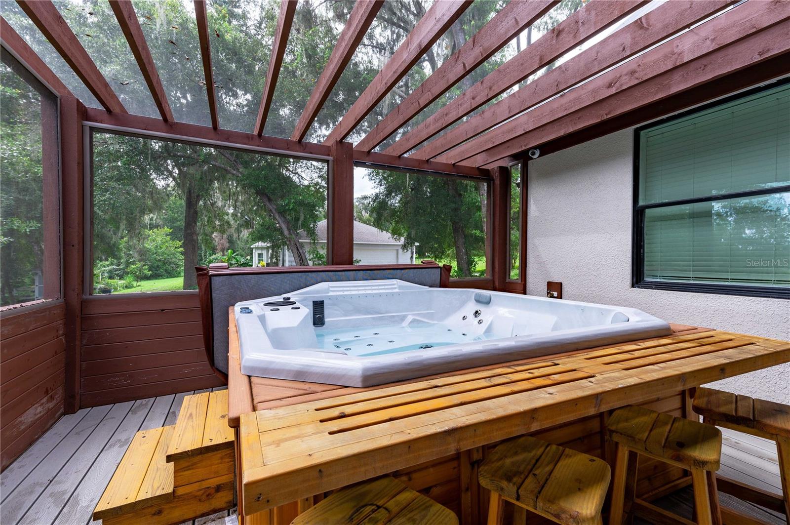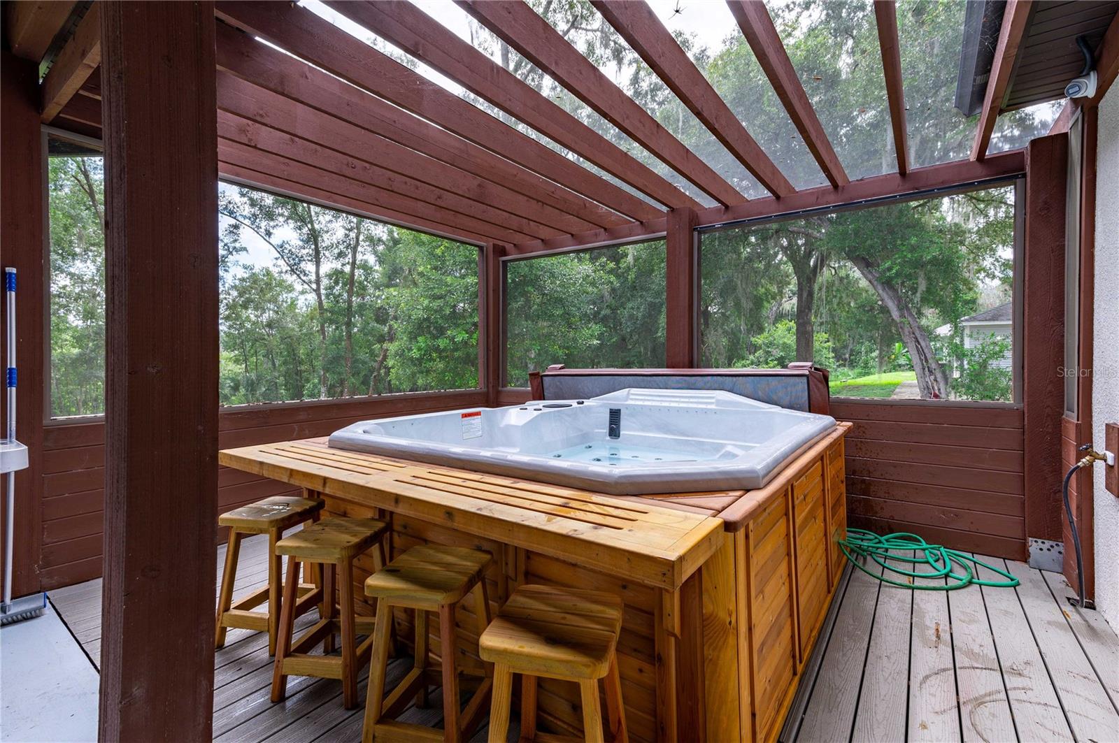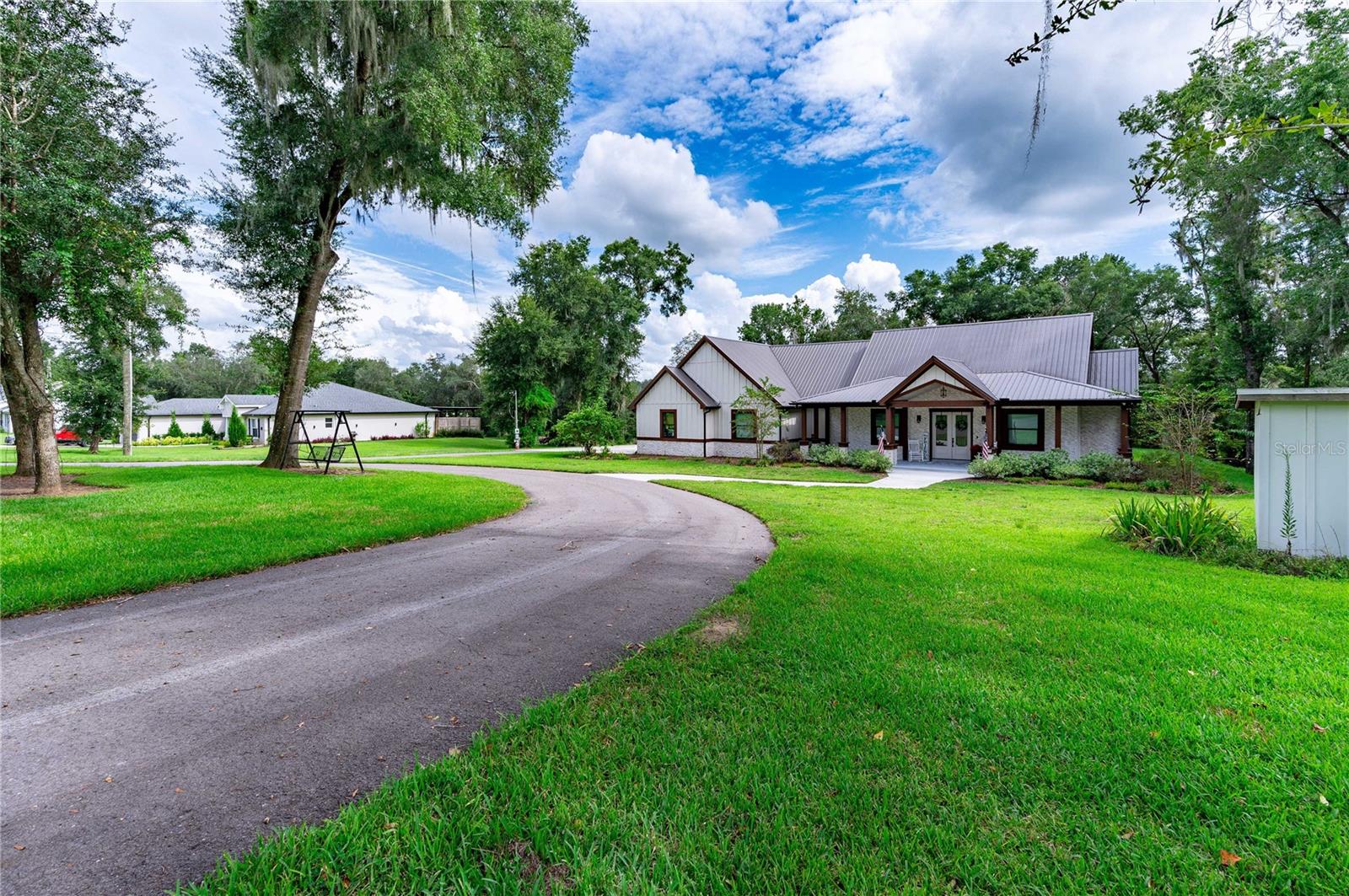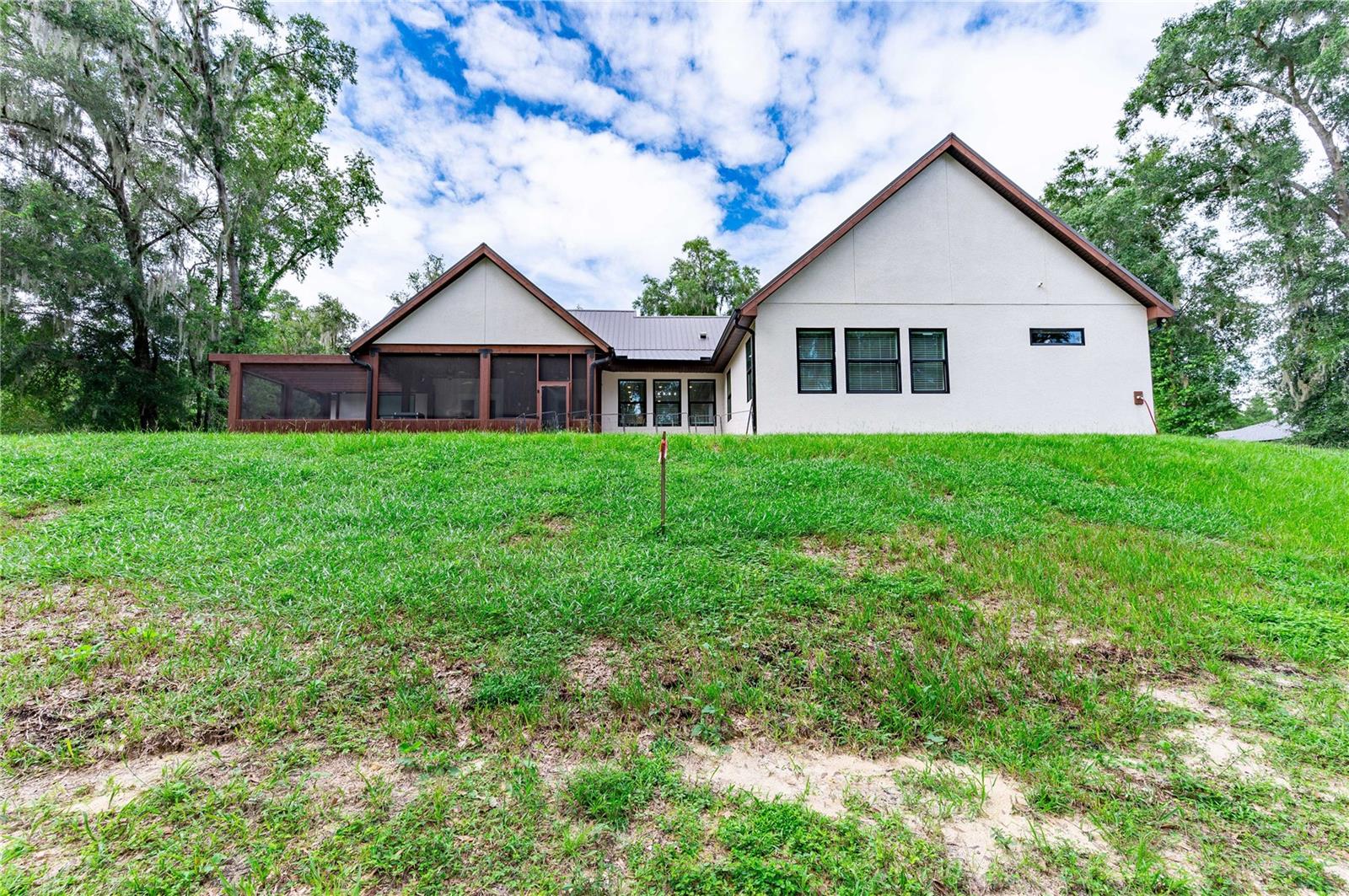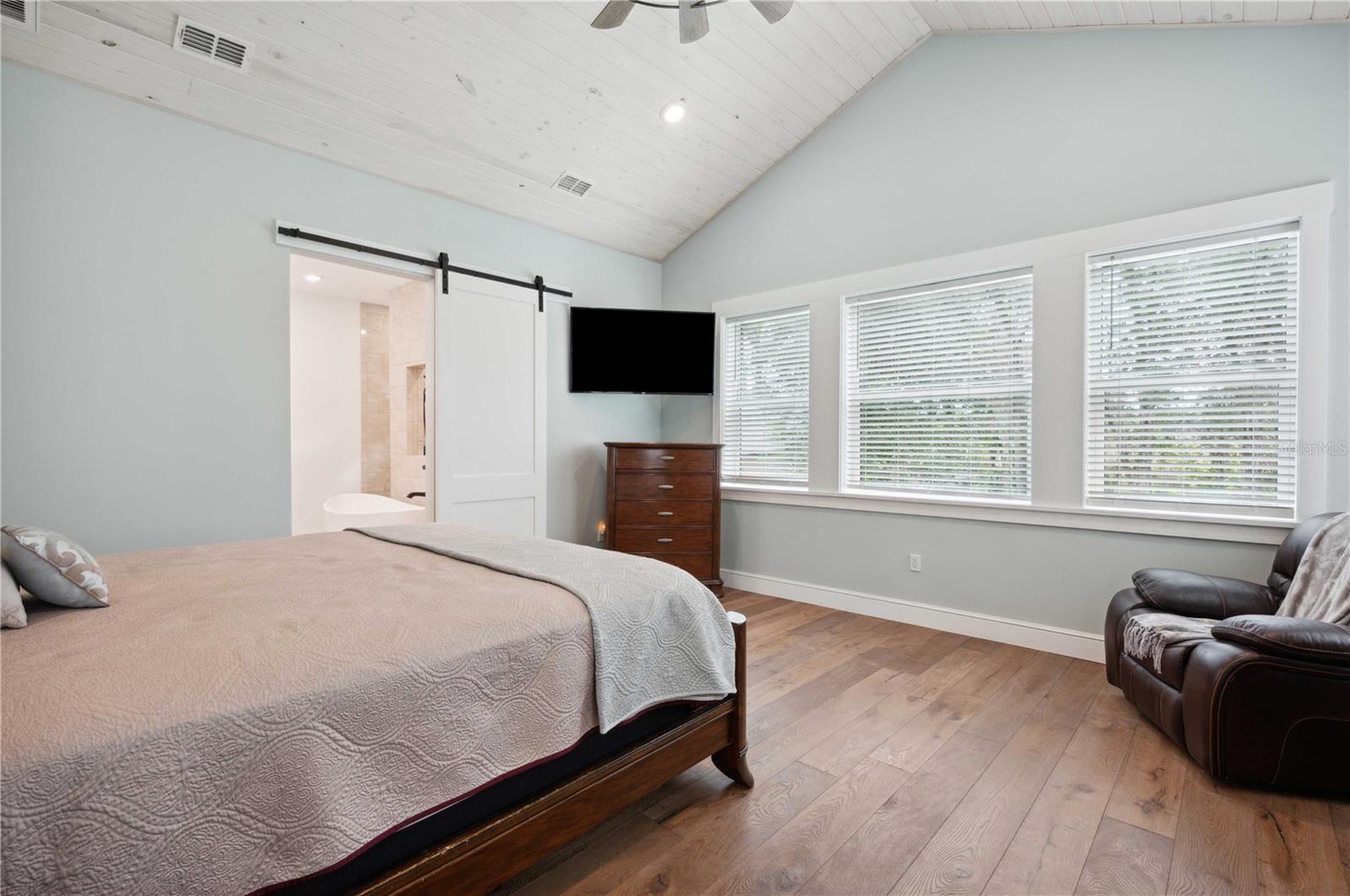 Welcome to this spectacular 3-bedroom, 3-bathroom home set on an impressive 5-acre property with no neighbors behind, offering both privacy and panoramic views of the conservation area. Step into the grand foyer adorned with a coffered ceiling, setting the tone for the luxurious finishes throughout. The kitchen is a chef's dream, featuring granite countertops, a glass backsplash, custom cabinets with under-cabinet lighting, and a true butler's pantry perfect for storing large appliances. The centerpiece is a single slab of granite on the island with breakfast bar seating, hidden storage, and a standalone icemaker. The vaulted whitewashed knotty pine ceiling in the living room offers a rustic charm, complemented by a double-sided electric fireplace that also warms the living room and the screened lanai. The primary bedroom boasts high ceilings, a magnificent custom walk-in closet, and an ensuite bath complete with a soaking tub, a vast shower with double regular AND rainfall showerheads, and dual vanities. Additional features include hardwood flooring, a fireplace, high ceilings, and a flex/office space. Guests enjoy comfortable accommodations with split-bedroom design, jack and jill bathrooms, and custom walk-in closets. Functionality meets luxury in the large laundry room equipped with built-in hampers and a spacious oversized 3-car garage that offers tall attic space—potential for additional living quarters. A screened lanai invites you with an 8 man hot tub, perfect for relaxing in the evenings bug free! The large pole barn will store all of your toys and then some. Every detail in this home has been thoughtfully planned to ensure comfort and luxury. Don’t miss the opportunity to own this exquisite property—contact us today to schedule your viewing!