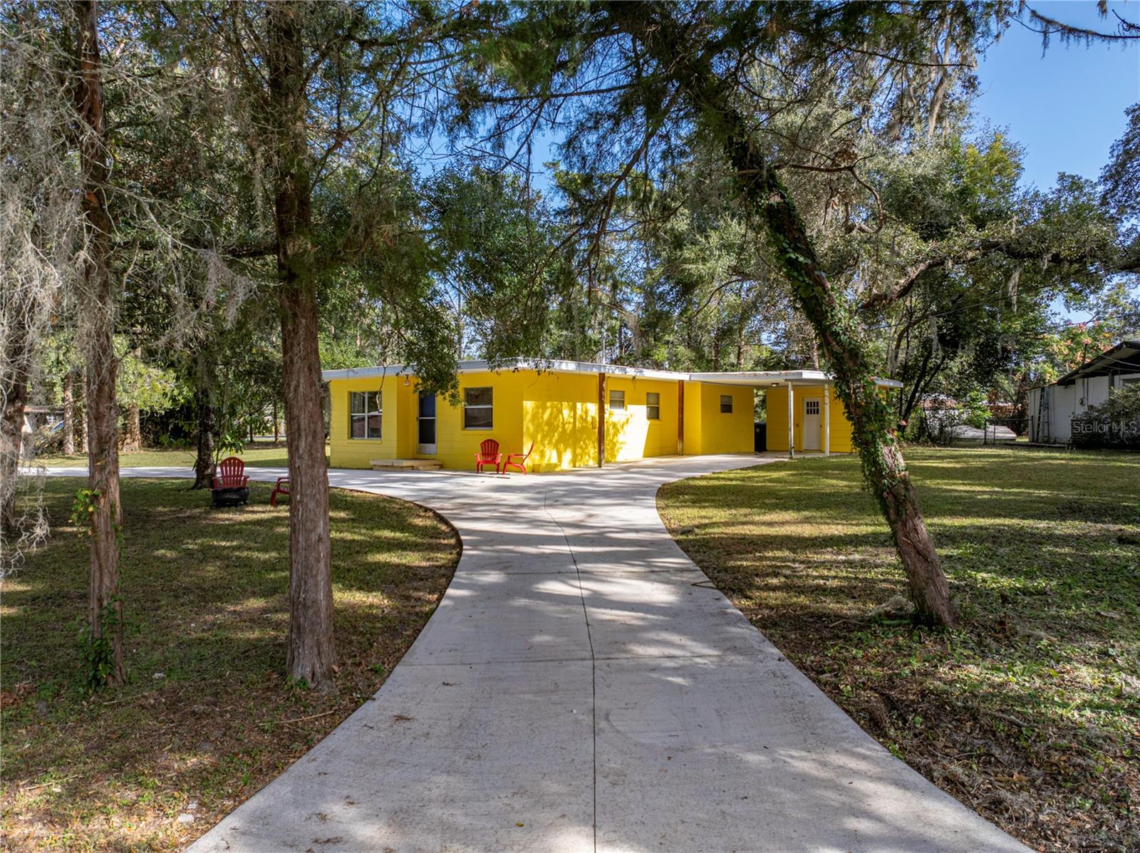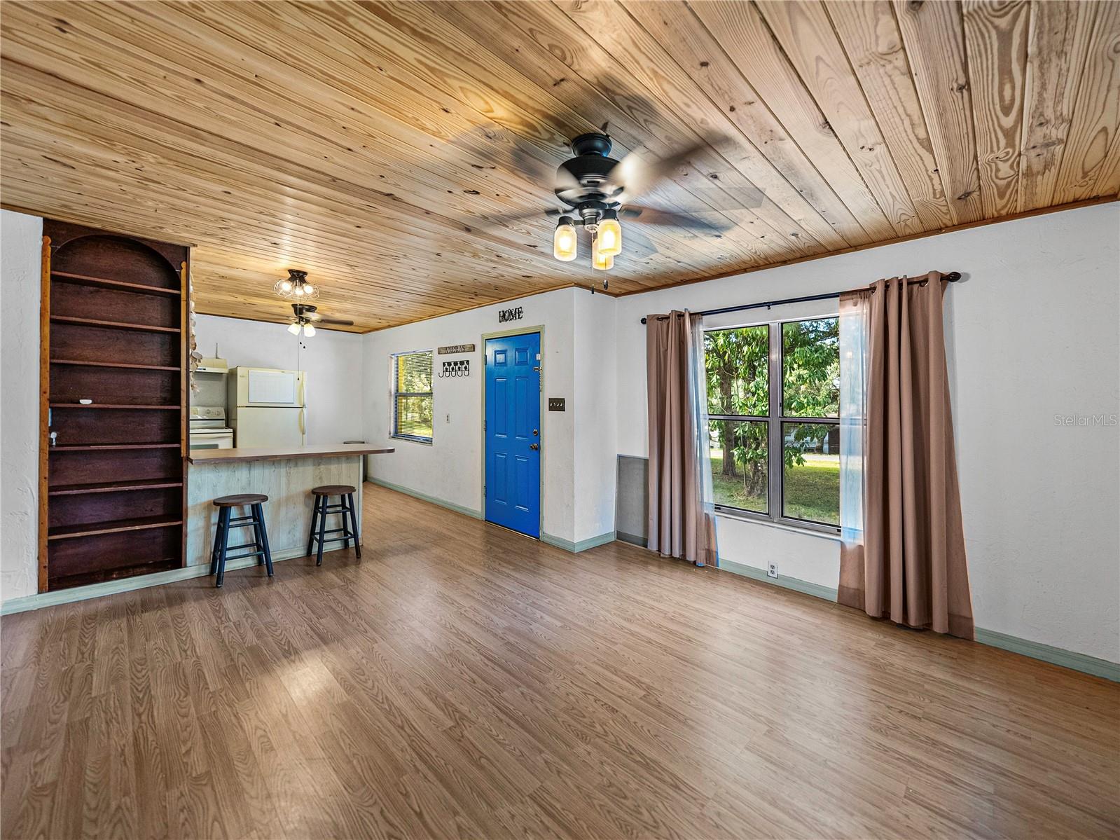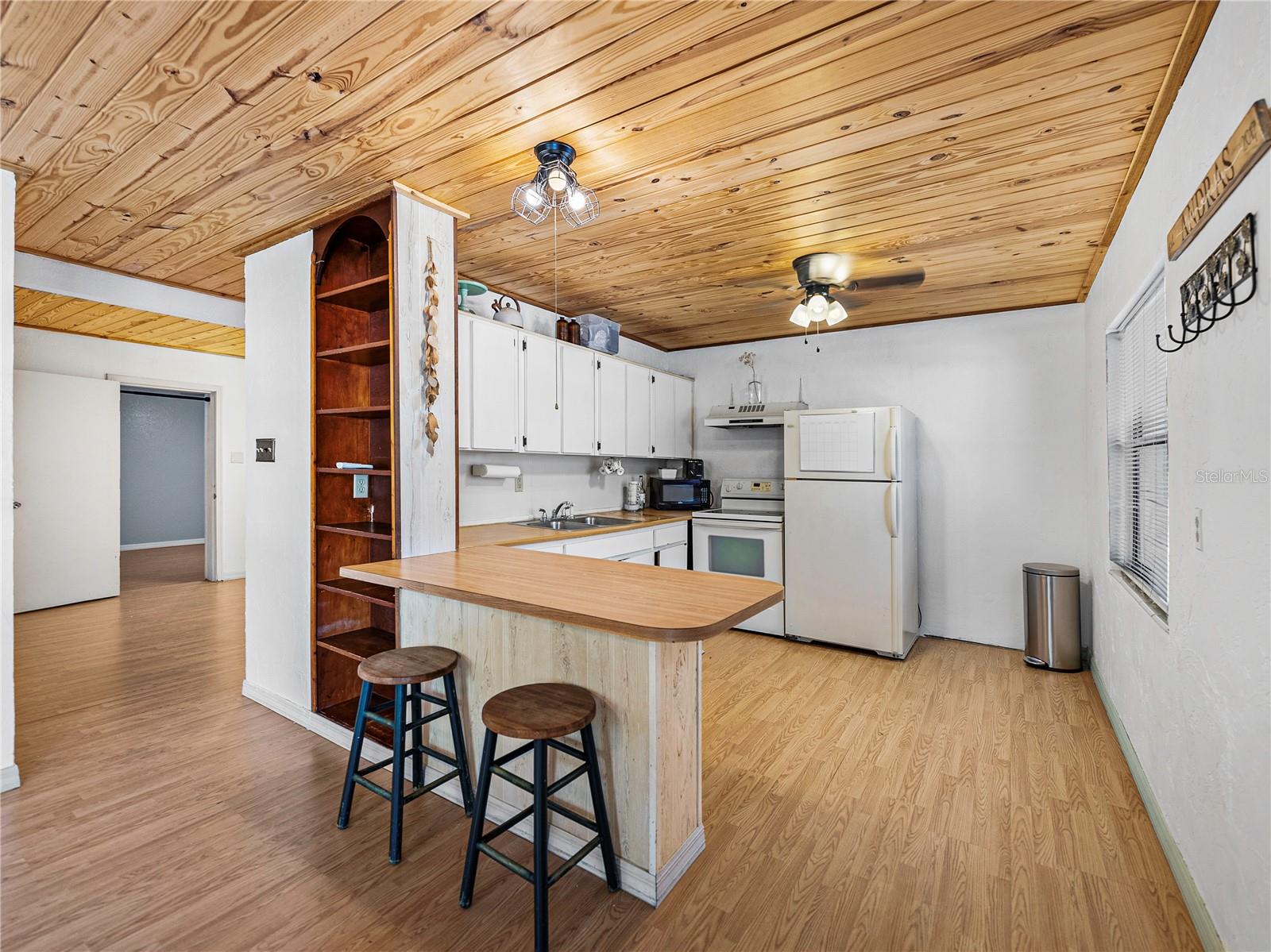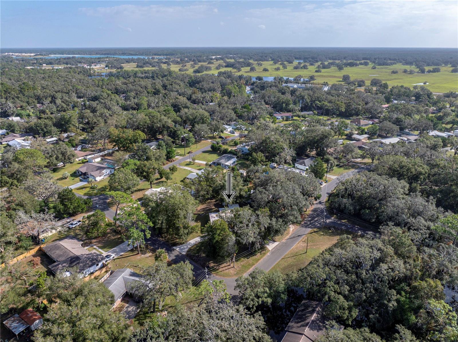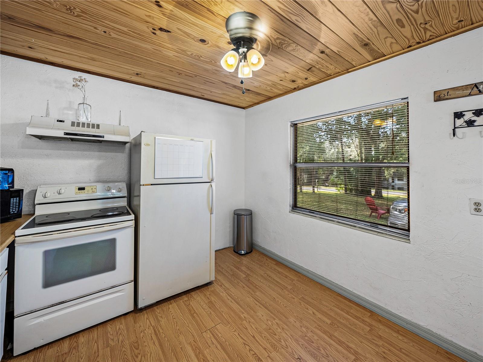 Resting high and dry on an oversized nearly 1/2 an acre corner lot, this beautifully wooded property offers 2 bedrooms, 1 bathroom, an open floor plan, and separate storage spaces! You are welcomed to the residence by a convenient circular driveway that leads to the carport and large front patio. Inside, laminate flooring and a gorgeous tongue and groove ceiling run throughout the space. Entertain with ease from the eat-in kitchen that features wood cabinetry, breakfast bar seating, a refrigerator, a range, and a microwave. A bonus room in the middle of the home adds flexibility as a formal dining room, a second living room, an office, etc. Both bedrooms are generously sized, and they share the home’s full bathroom with a tub/shower combo. New drain field in 2022, the roof was redone in 2018, the exterior has recently been painted, and this property was fortunate enough to stay dry during the storms. Call us today for your private showing and to learn more about the Ridge Manor community, just a short drive into Dade City, Brooksville, Webster, and more!