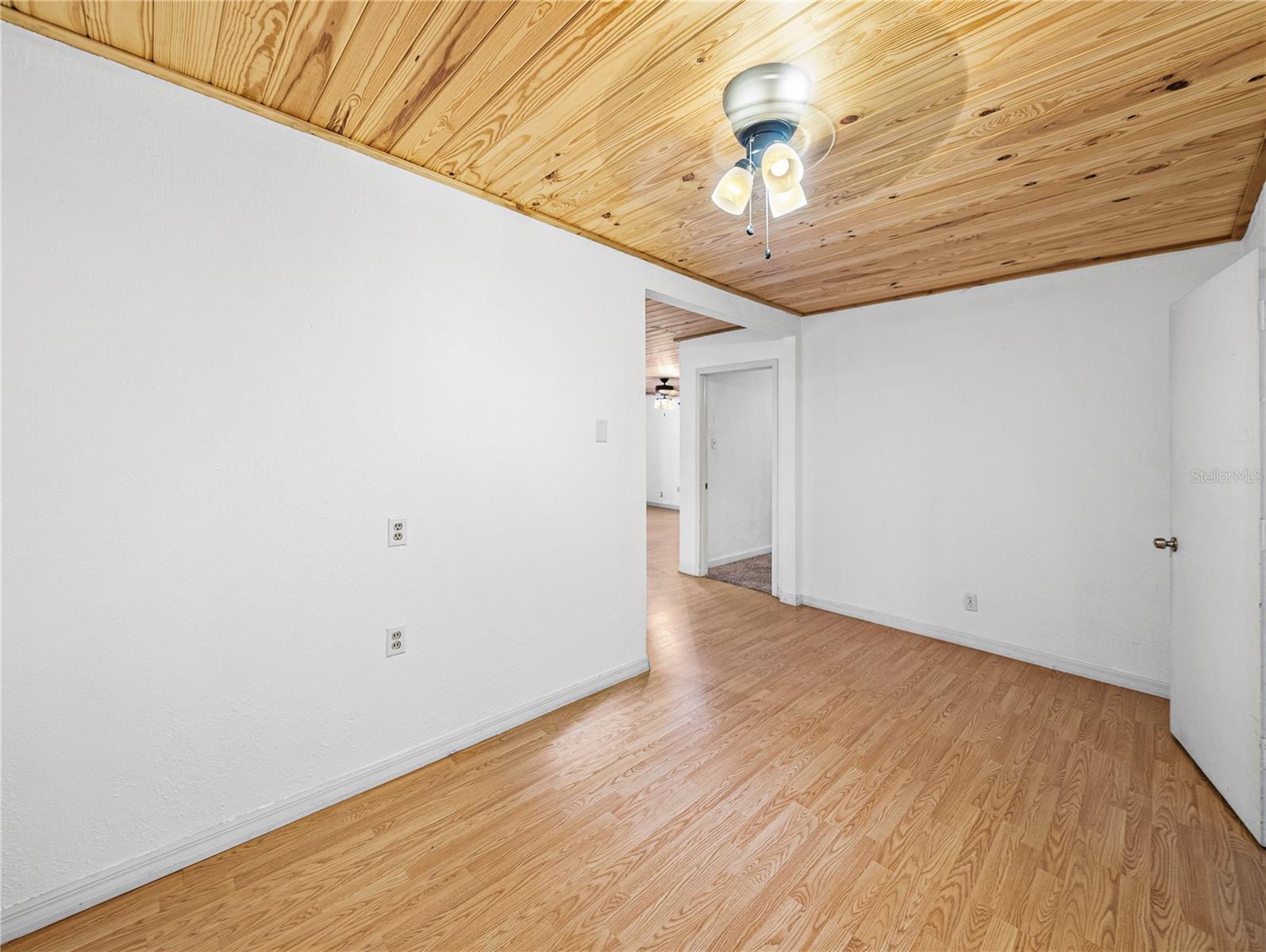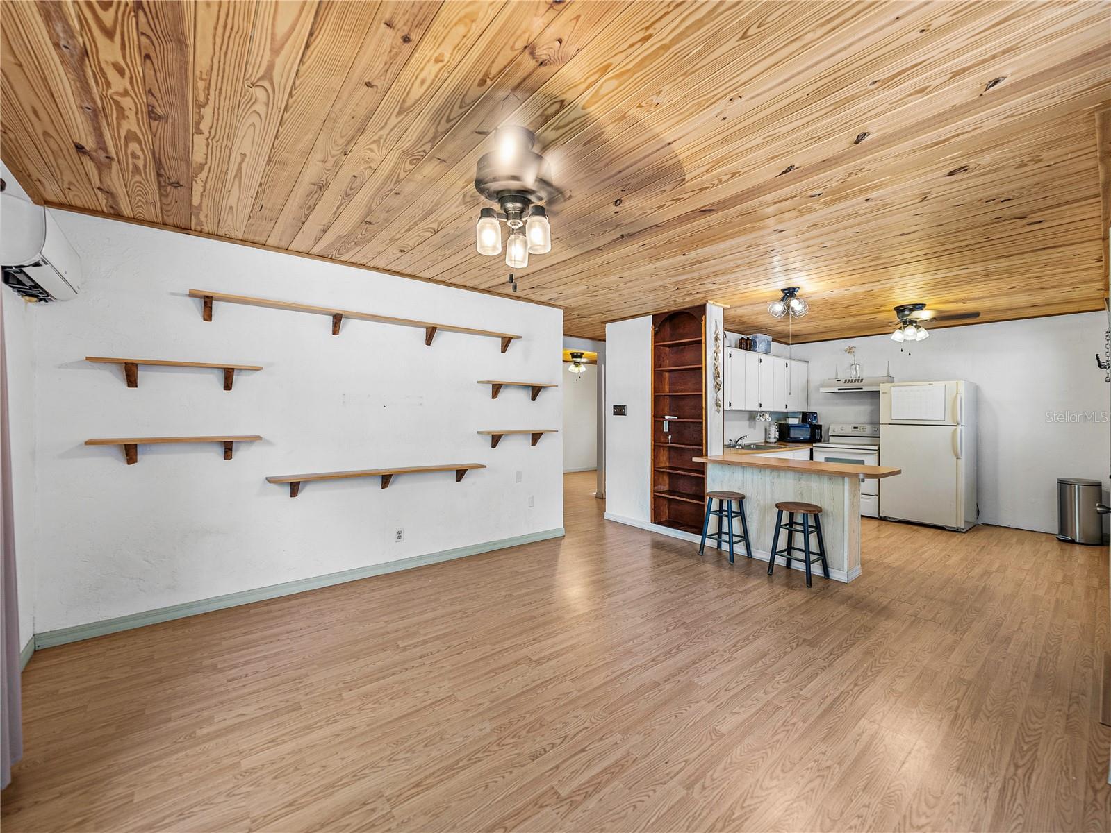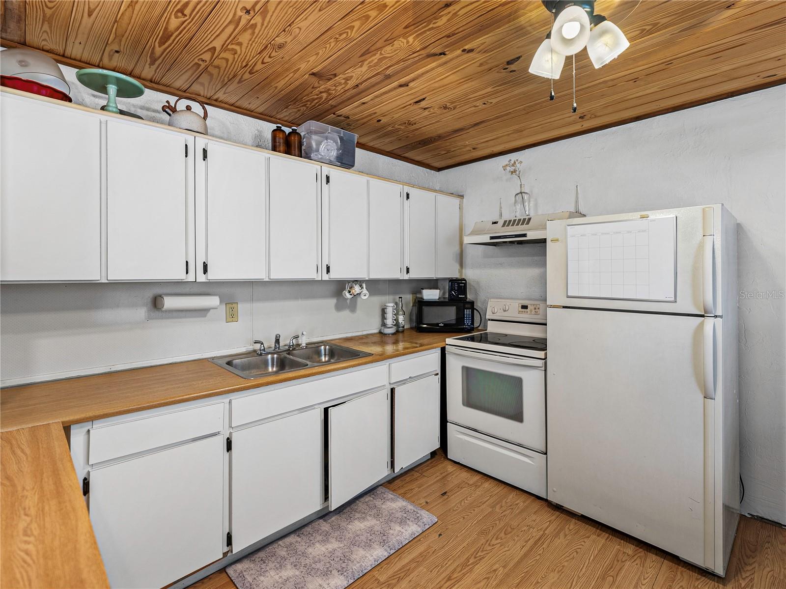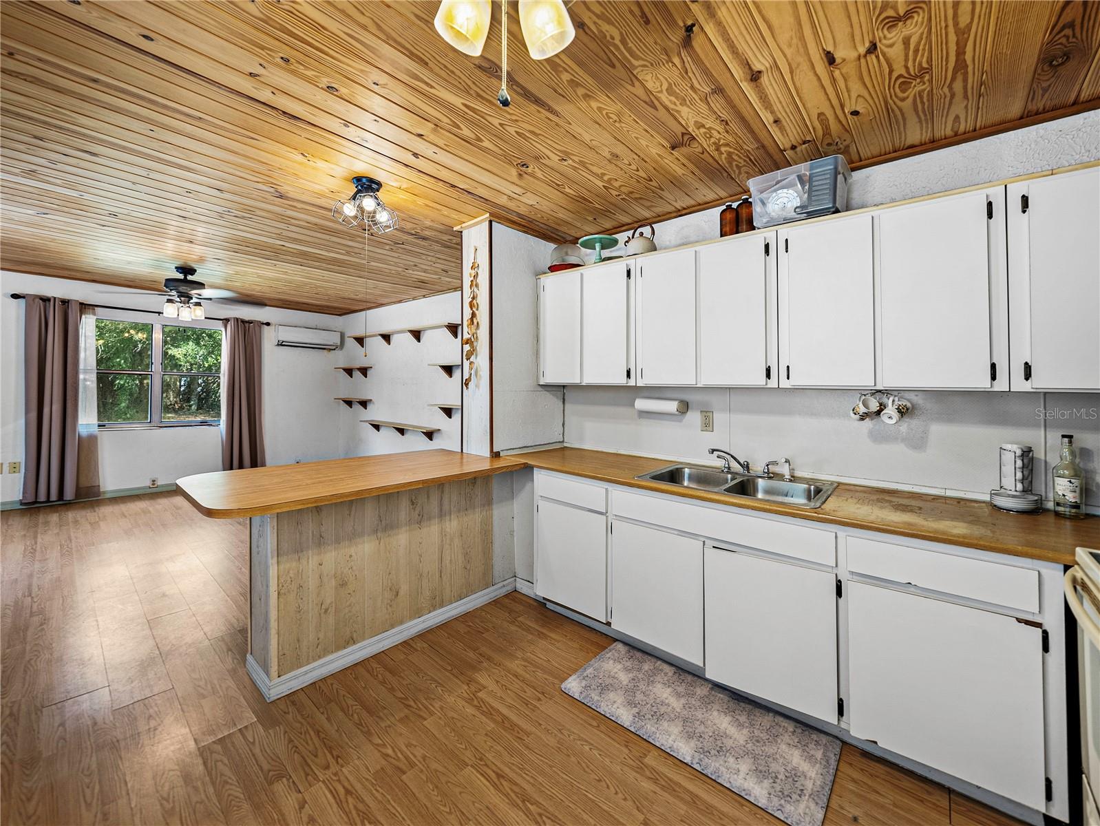 Resting high and dry on an oversized nearly 1/2 an acre corner lot, this beautifully wooded property offers 2 bedrooms, 1 bathroom, an open floor plan, and separate storage spaces! You are welcomed to the residence by a convenient circular driveway that leads to the carport and large front patio. Inside, laminate flooring and a gorgeous tongue and groove ceiling run throughout the space. Entertain with ease from the eat-in kitchen that features wood cabinetry, breakfast bar seating, a refrigerator, a range, and a microwave. A bonus room in the middle of the home adds flexibility as a formal dining room, a second living room, an office, etc. Both bedrooms are generously sized, and they share the home’s full bathroom with a tub/shower combo. New drain field in 2022, the roof was redone in 2018, the exterior has recently been painted, and this property was fortunate enough to stay dry during the storms. Call us today for your private showing and to learn more about the Ridge Manor community, just a short drive into Dade City, Brooksville, Webster, and more!