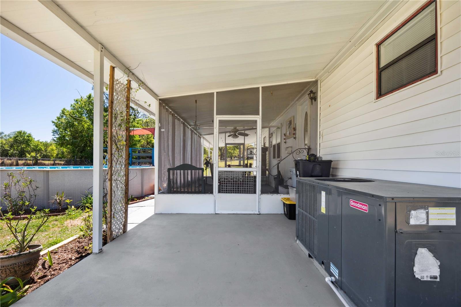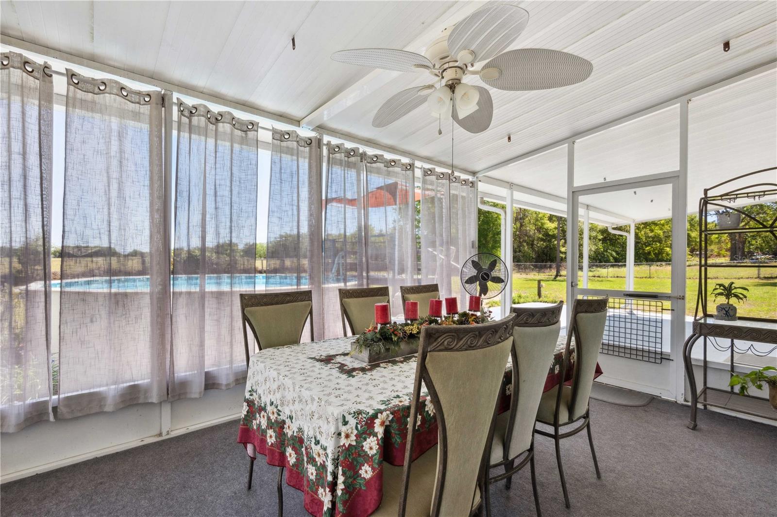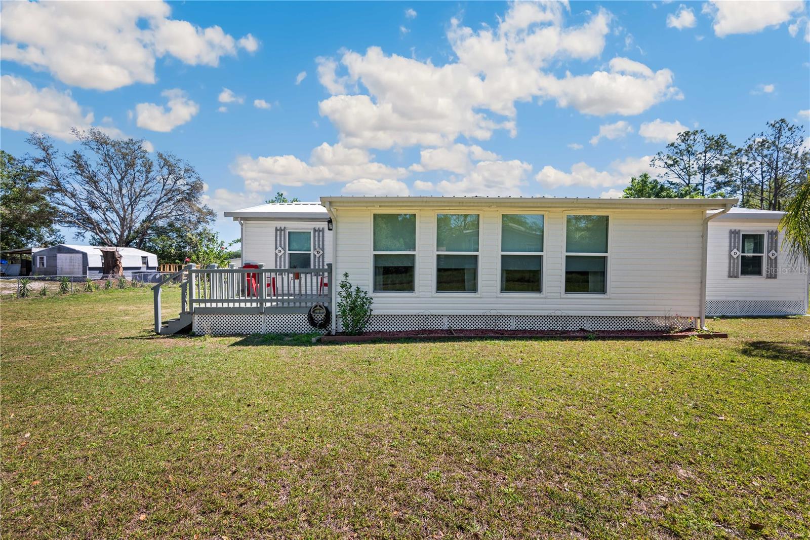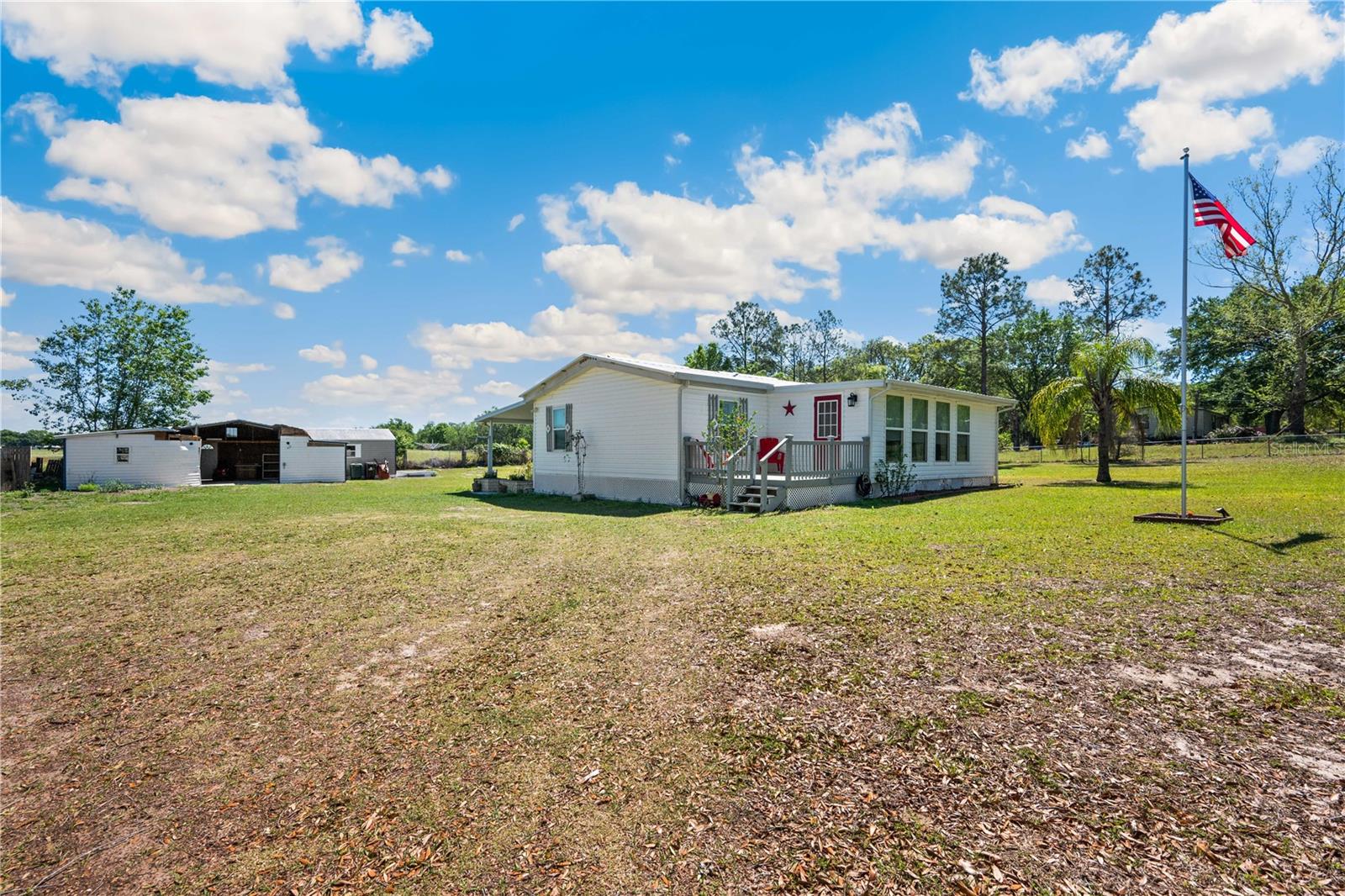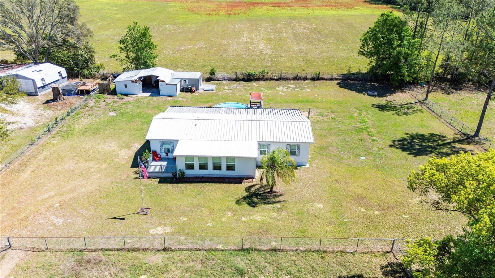 Country Living at Its Finest in Dade City! Welcome to this charming 3BR/2BA pool home, perfectly situated on just under one acre of beautifully maintained land. Fully fenced and gated with chain link, this peaceful retreat is surrounded by open fields, mature trees, and lush landscaping, offering the perfect setting for raising a family or enjoying a quiet retirement. Step inside and be greeted by a spacious, open-concept layout that seamlessly connects the Florida room, living room, dining area, and kitchen. The large kitchen is designed to impress, featuring wood-faced cabinets, updated laminate flooring, a closet pantry, and plenty of counter space to satisfy any cooking enthusiast. A unique highlight of this home is the front-facing Florida room, filled with natural light from its double-pane windows and warmed by a cozy electric fireplace. The living room, complete with a ceiling fan and laminate flooring, provides a welcoming space to unwind or entertain guests. The owner’s retreat offers privacy and comfort with a walk-in closet, ensuite bathroom, step-in shower, tile flooring, and an updated vanity. On the opposite side of the home, the additional two bedrooms are generously sized, featuring built-in closets, tile flooring, and ceiling fans. The nearby guest bathroom has been tastefully updated with a custom step-in tile shower, modern vanity, and tile flooring. Outdoor living is just as impressive as the interior. Enjoy your morning coffee on the charming 10x10 front deck, relax in the large, screened backyard room, or take a refreshing dip in the above-ground pool with an attached deck. Additional features include metal storage buildings, updated appliances, fresh paint, drywall construction, Central AC unit 3-year-old, updated AC duct work, Tiedowns, vapor barrier, and laminate flooring throughout. If you’re searching for a well-maintained home in a beautiful and serene setting, this property is must-see. Schedule your private tour today!