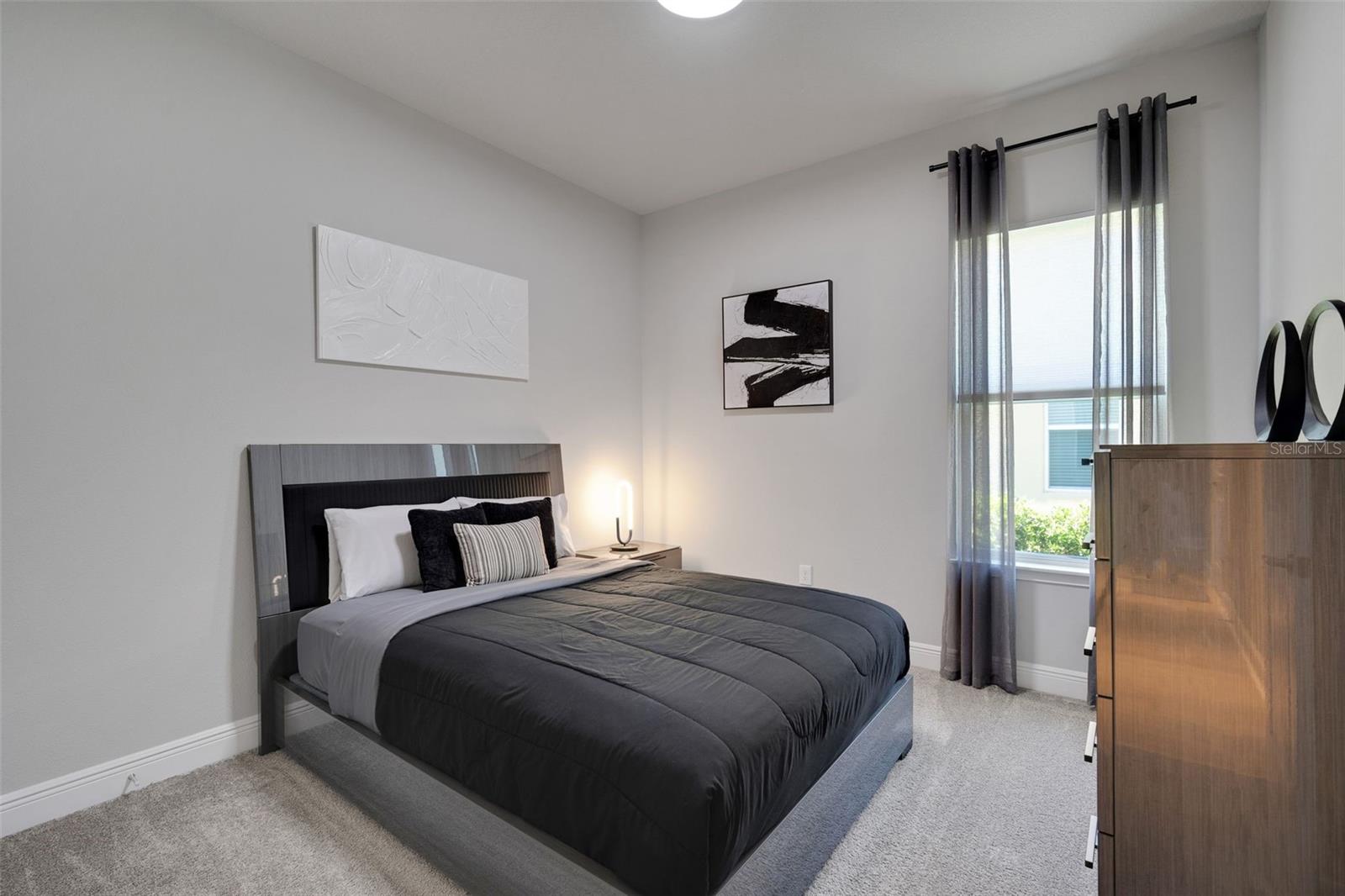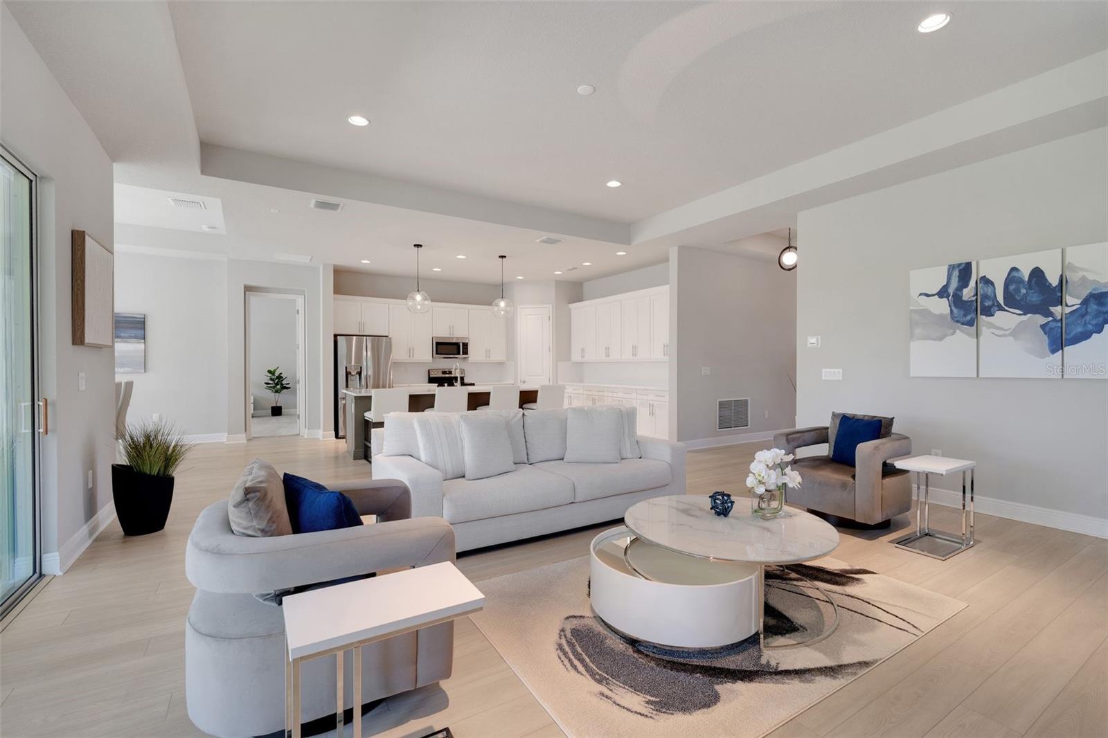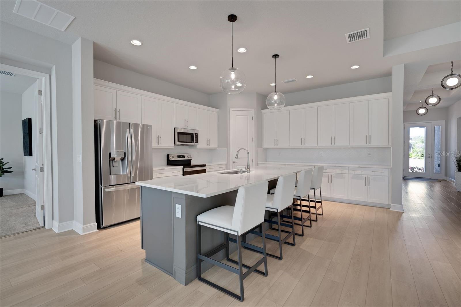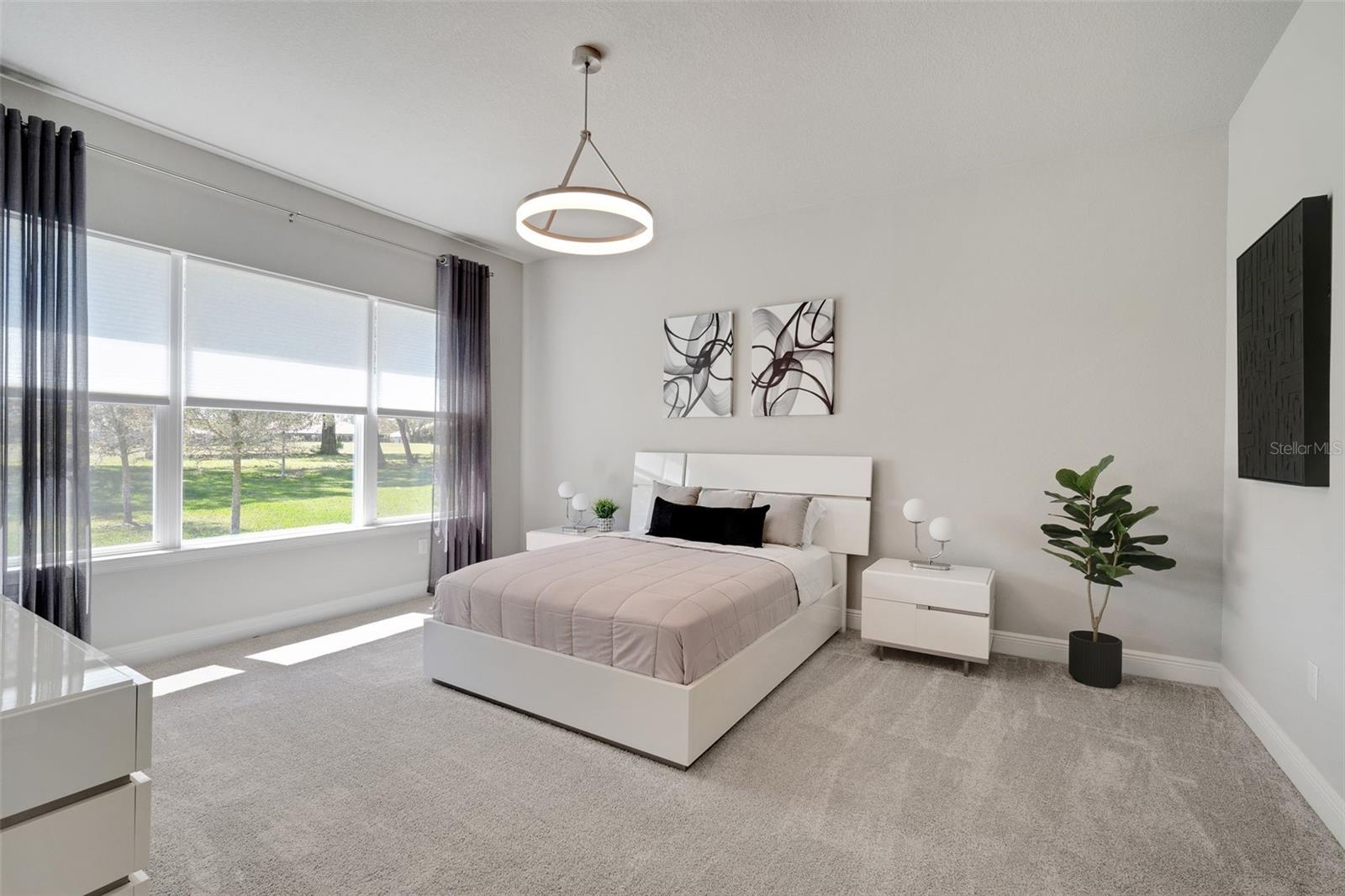 CONTEMPORARY. IMMACULATE. MOVE IN READY. This 2022 ICI home in Lake Jovita Golf and Country Club shows like a model and blends modern luxury with everyday ease. Escape the traffic and enjoy a newer build tucked inside a beautifully established community. Soaring tray ceilings and elegant lighting set the stage for a bright, modern open layout. Triple sliders frame golf course views, while the chef’s kitchen stuns with quartz counters, stainless steel appliances, soft close cabinetry, under cabinet lighting, and a 10 ft island built for entertaining. Your spacious primary suite is a peaceful retreat with a picture window overlooking the fairway and a spa like en-suite bath. Outside, unwind on the extended covered patio with peaceful views of the tee box. This home is packed with premium upgrades, including FULL IMPACT WINDOWS AND DOORS for energy efficiency, lower insurance costs, and added peace of mind, plus professionally designed closet systems, Sparc Tek garage flooring, overhead storage, and an EV charger. The low $86/month HOA includes Blue Stream Fiber internet, 24/7 guard gated entry, pickleball courts, and scenic walking trails, with OPTIONAL golf and country club memberships for access to the championship course, tennis courts, resort style pool, clubhouse, and on-site restaurant.