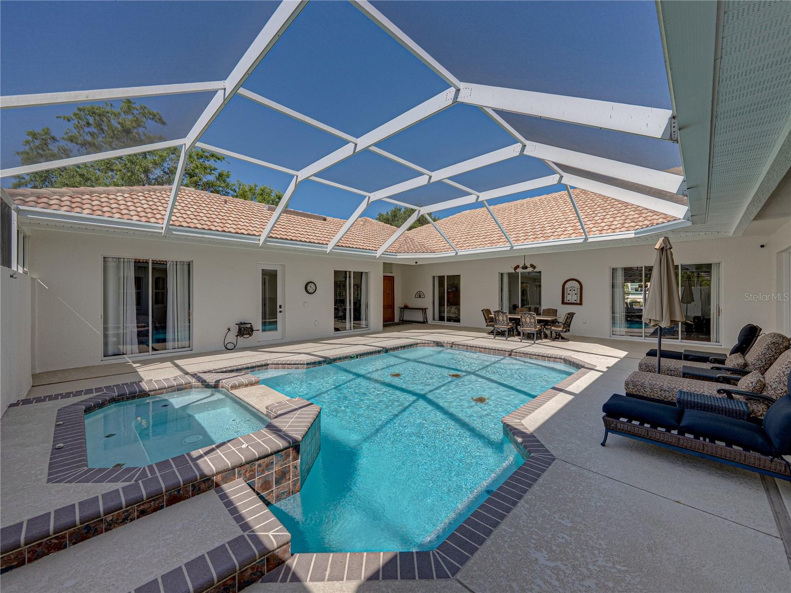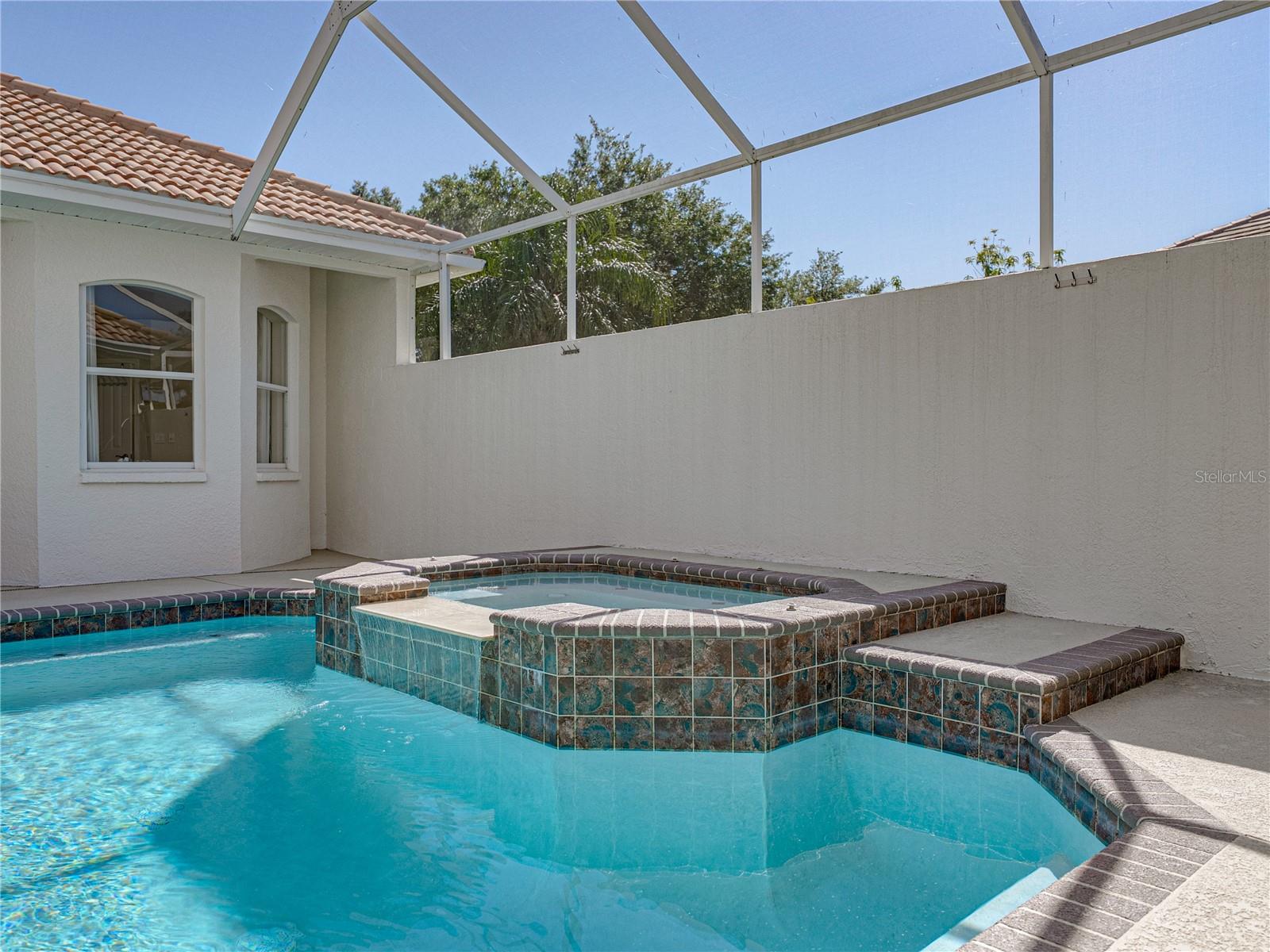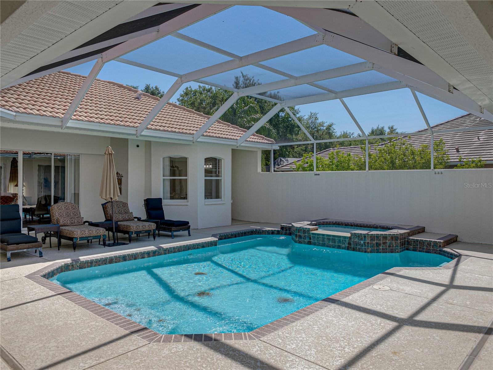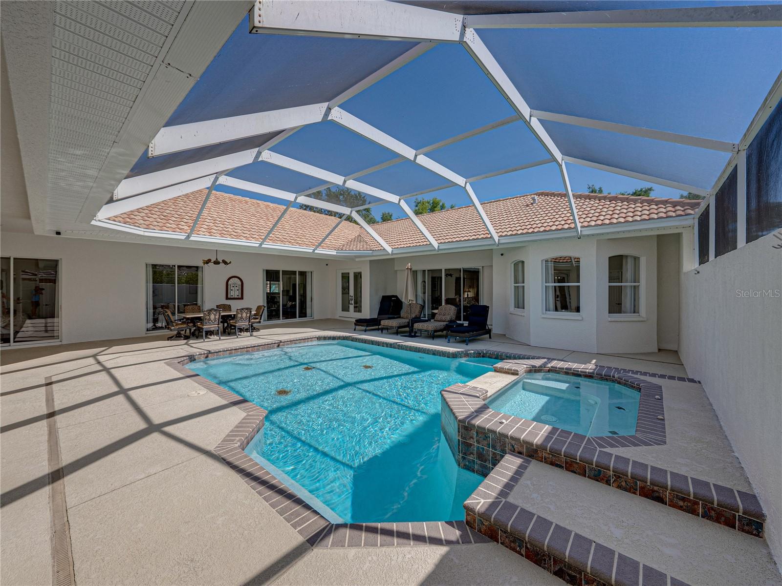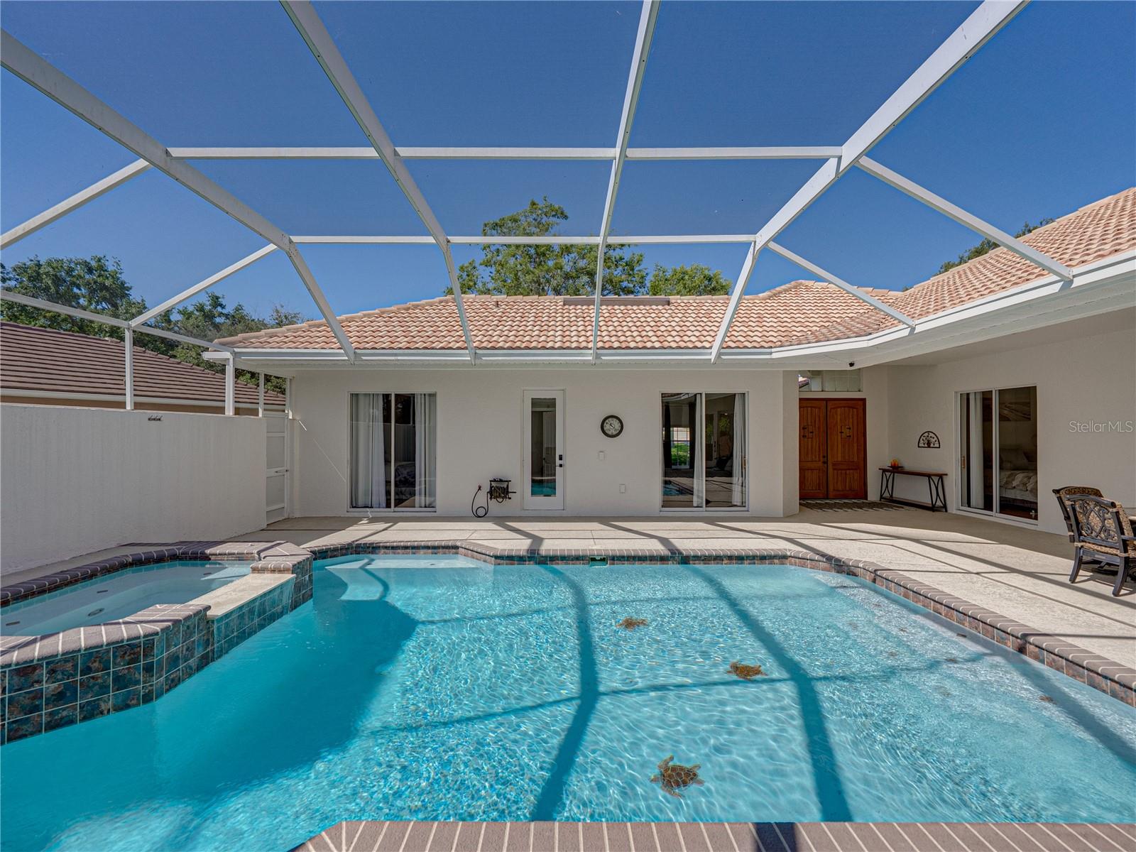 SELLER IS OFFERING UP TO $5,000 towards golf initiation fees, closing costs or HOA fees! Set on a scenic 1/2 acre with breathtaking golf course views, this beautifully updated, 5 bedroom, 3 bath cabana-style residence wraps around a private pool. It offers a unique layout that is ideal for entertaining or multi-generational living. Step through custom wood double doors into the serene courtyard, where the pool becomes the centerpiece of this thoughtfully designed home. Inside the main house, you'll find 3 spacious bedrooms, 2 full bathrooms, and 2 inviting living areas. The main living area features beautiful hardwood flooring, soaring ceilings with dual decorative fans, and multiple sets of sliding doors that flood the space with natural light. It flows seamlessly into the formal dining area, creating an open atmosphere perfect for gatherings. The updated kitchen offers granite countertops, breakfast bar seating, 2024 stainless steel appliances, recessed lighting, pantry storage, and a sunny eat-in dinette. A second living area nearby adds flexibility for everyday comfort. Privately split from the secondary bedrooms, the primary suite is a retreat of its own with wood flooring, sliding doors to the pool, and an expansive walk-in closet. There is new tile flooring in the spa-like ensuite bathroom with dual sinks, vanity seating, a soaking tub, and a walk-in shower. Bedrooms 2 and 3 are located on the opposite side of the home and share a well-appointed guest bath. One of the most desirable features of this floor plan is the detached cabana style guest house. It is a secluded suite with 2 generously sized bedrooms, each offering walk-in closets and connected by the full cabana pool bath. It's an ideal setup for a private office, visitors, in-laws, or teens! Recent upgrades add style and peace of mind.:There is new tile in the kitchen, primary bath, and living area (2024), new kitchen appliances (2024), and a new washer and dryer (2025), updated flooring in the cabana suite (2024), fresh exterior paint (2024), and interior paint (2021). The heated pool and spa provide a private backdrop for easy alfresco dining, quiet mornings, or fun-filled weekends under the sun. Enjoy all the amenities Lake Jovita has to offer, from 24-hour gated security and two championship golf courses, to tennis, pickleball, a fitness center, and optional club memberships. This is refined Florida living in one of the area's most desirable communities. Schedule your private showing today!
