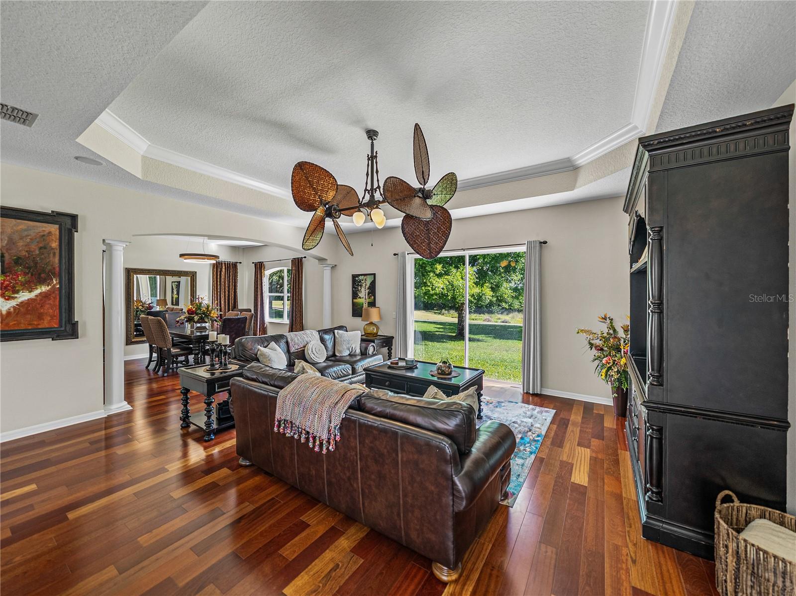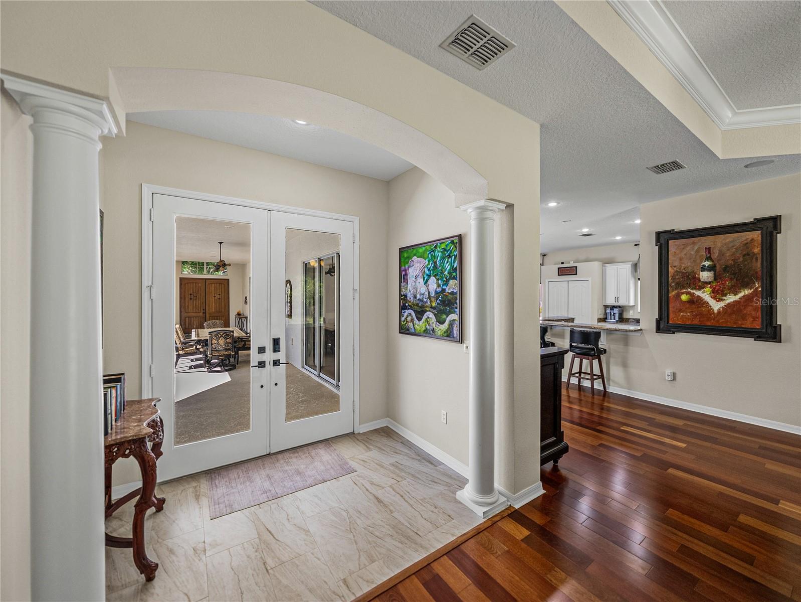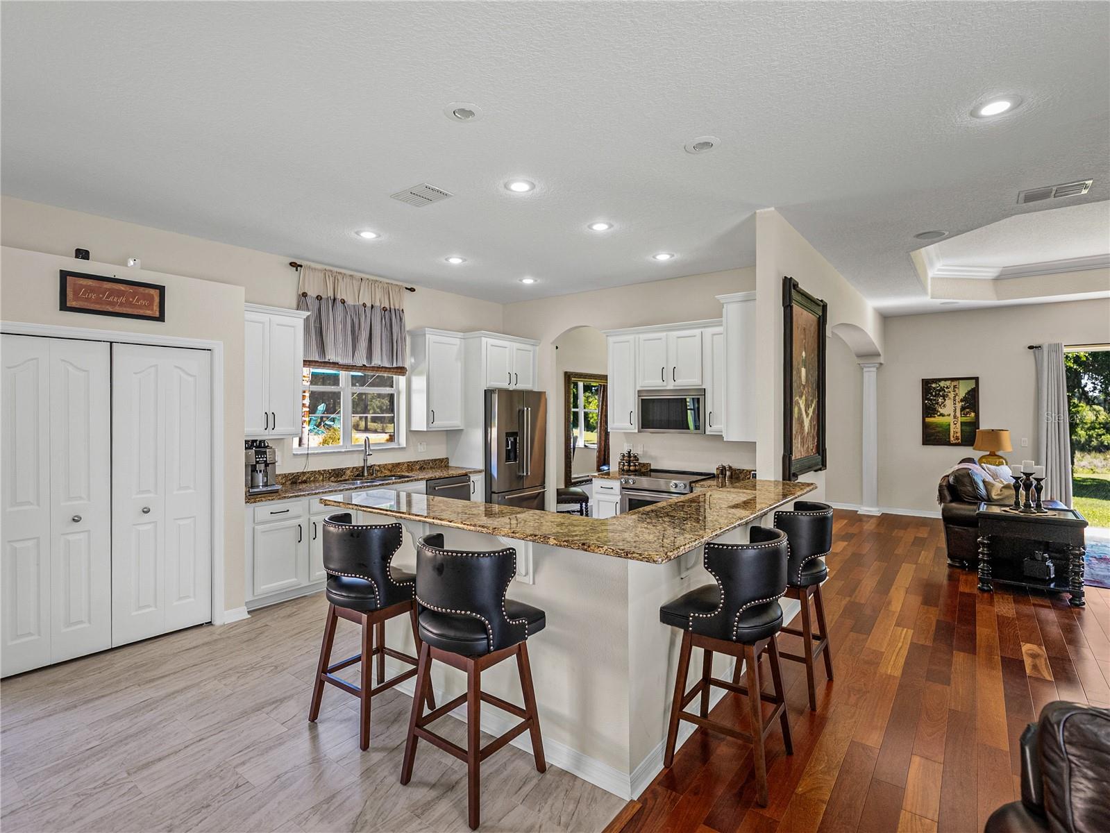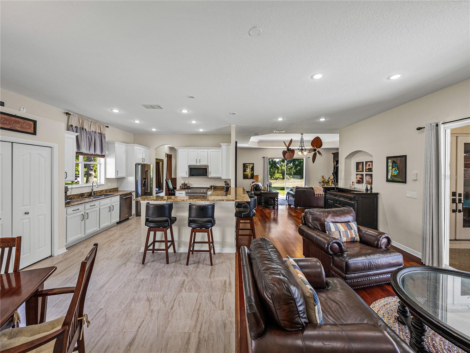 SELLER IS OFFERING UP TO $5,000 towards golf initiation fees, closing costs or HOA fees! Set on a scenic 1/2 acre with breathtaking golf course views, this beautifully updated, 5 bedroom, 3 bath cabana-style residence wraps around a private pool. It offers a unique layout that is ideal for entertaining or multi-generational living. Step through custom wood double doors into the serene courtyard, where the pool becomes the centerpiece of this thoughtfully designed home. Inside the main house, you'll find 3 spacious bedrooms, 2 full bathrooms, and 2 inviting living areas. The main living area features beautiful hardwood flooring, soaring ceilings with dual decorative fans, and multiple sets of sliding doors that flood the space with natural light. It flows seamlessly into the formal dining area, creating an open atmosphere perfect for gatherings. The updated kitchen offers granite countertops, breakfast bar seating, 2024 stainless steel appliances, recessed lighting, pantry storage, and a sunny eat-in dinette. A second living area nearby adds flexibility for everyday comfort. Privately split from the secondary bedrooms, the primary suite is a retreat of its own with wood flooring, sliding doors to the pool, and an expansive walk-in closet. There is new tile flooring in the spa-like ensuite bathroom with dual sinks, vanity seating, a soaking tub, and a walk-in shower. Bedrooms 2 and 3 are located on the opposite side of the home and share a well-appointed guest bath. One of the most desirable features of this floor plan is the detached cabana style guest house. It is a secluded suite with 2 generously sized bedrooms, each offering walk-in closets and connected by the full cabana pool bath. It's an ideal setup for a private office, visitors, in-laws, or teens! Recent upgrades add style and peace of mind.:There is new tile in the kitchen, primary bath, and living area (2024), new kitchen appliances (2024), and a new washer and dryer (2025), updated flooring in the cabana suite (2024), fresh exterior paint (2024), and interior paint (2021). The heated pool and spa provide a private backdrop for easy alfresco dining, quiet mornings, or fun-filled weekends under the sun. Enjoy all the amenities Lake Jovita has to offer, from 24-hour gated security and two championship golf courses, to tennis, pickleball, a fitness center, and optional club memberships. This is refined Florida living in one of the area's most desirable communities. Schedule your private showing today!