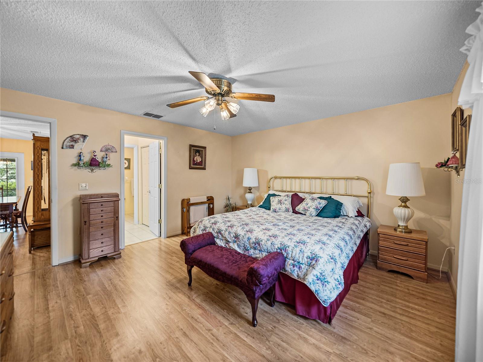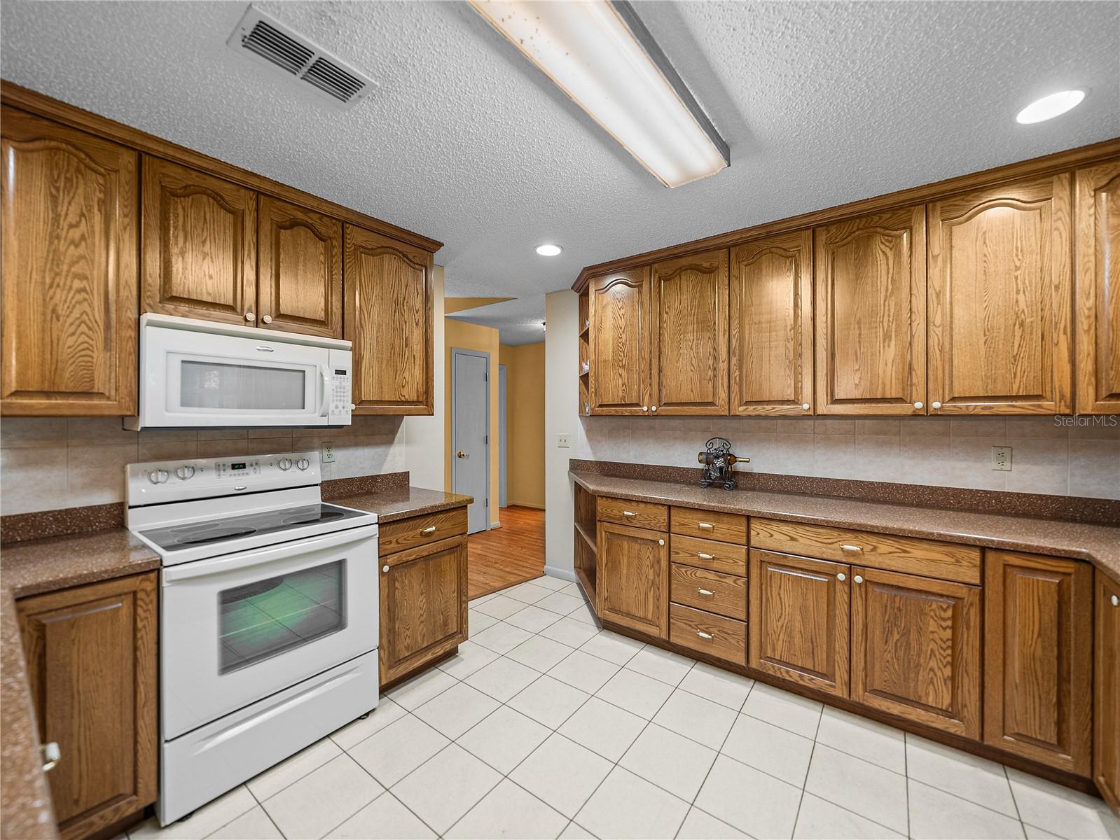 Charming curb appeal and a prime corner lot in the heart of Dade City make this 3 bedroom, 2 bath, 2 car garage home one you won’t want to miss! A brick paver walkway and brick- accented covered front porch create an inviting first impression. Inside, luxury vinyl plank flooring runs throughout most of the home, and the 18x18 living room feels open and airy with high vaulted ceilings and a seamless flow into the centrally located dining room. French doors in the dining space lead to a 450 sq ft screened porch, ideal for relaxing or entertaining. The kitchen sits just off the dining room and offers a functional layout with Corian countertops, wood cabinetry, a four-piece appliance package, and breakfast bar seating. Split from the secondary bedrooms for added privacy, the primary suite includes a spacious bedroom, a large walk-in closet, and an ensuite bathroom with a tub/shower combo. On the opposite side of the home, two generously sized guest bedrooms each feature dual closets and ceiling fans, sharing a full bath with a linen closet and a tub/shower combo in between. For added convenience, the interior laundry room provides extra cabinetry and leads to a versatile, heated and cooled storage/utility room, as well as the side-facing 2-car garage. Outdoors, enjoy easy alfresco dining or morning coffee from the screened porch or the open patio, both surrounded by lush landscaping. Tucked into a beautifully maintained neighborhood with sidewalk-lined streets, this home is less than five minutes from Downtown Dade City and local shopping, offering the perfect mix of charm, space, and location. Call today to schedule your showing!