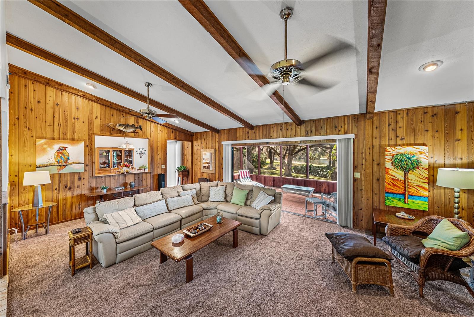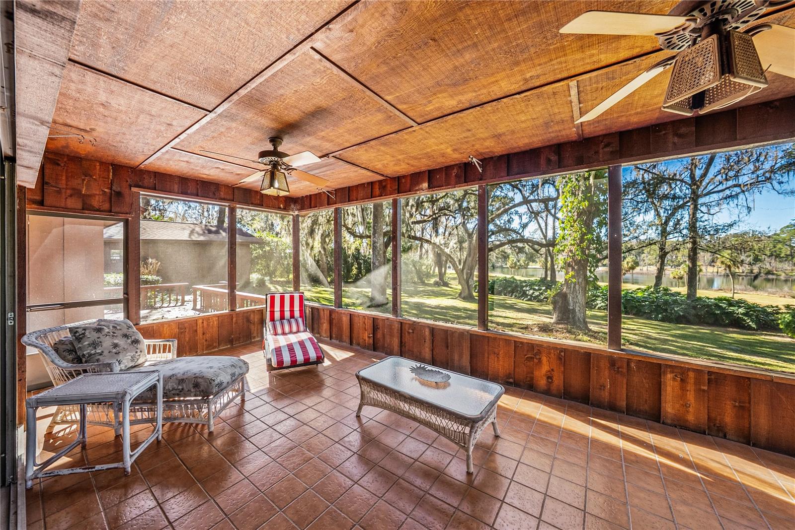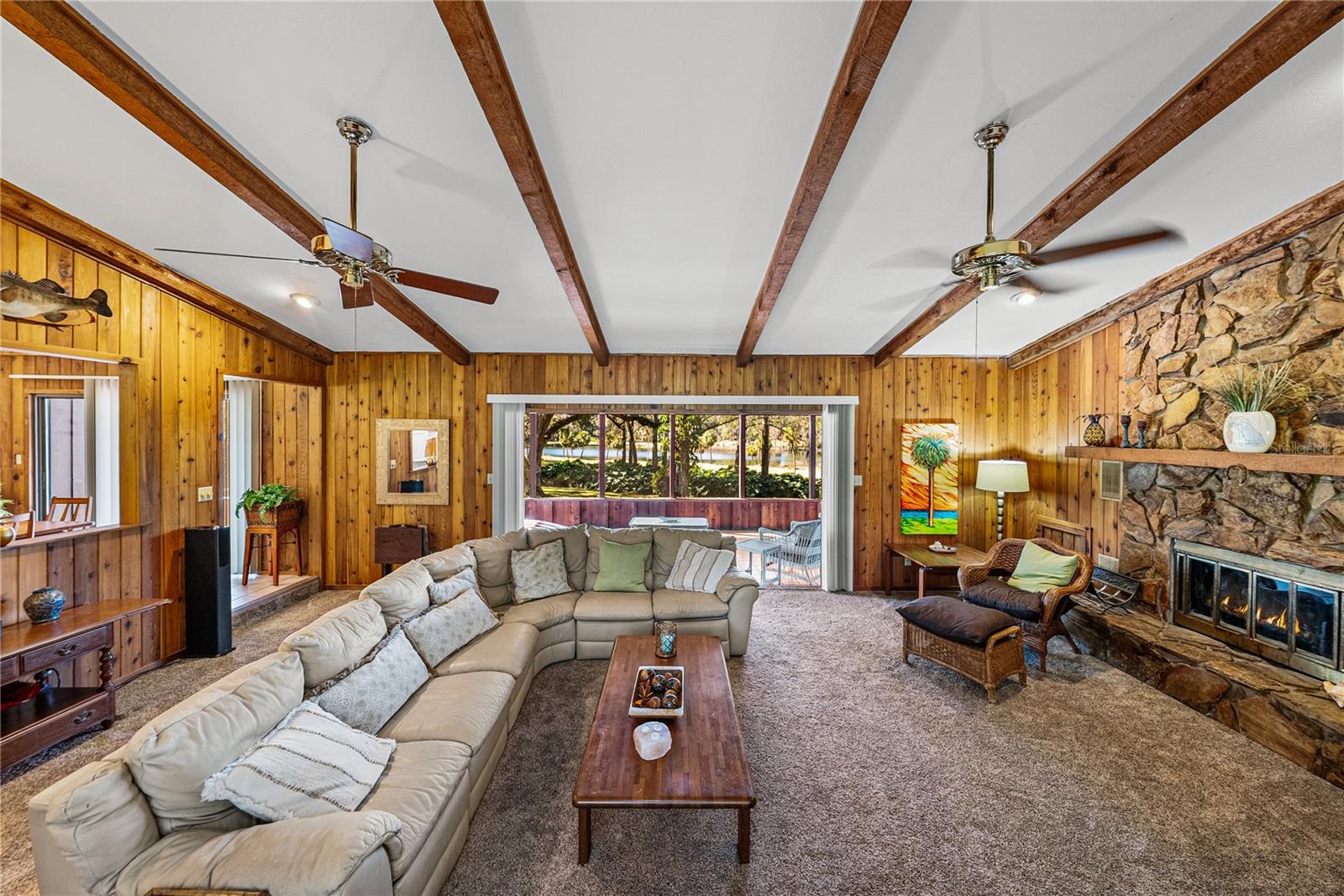 Escape to nearly 3 acres of pure Florida tranquility in this peaceful, rustic-style lakeside retreat offering 180 feet of sparkling water frontage, sweeping views, a 2024 roof, a 2025 AC, and a lush tropical landscape dotted with grand, mature shade trees. Though you’re just minutes from downtown Dade City, this 3 bedroom, 2 bath, 4 car garage property feels worlds away, your own private lakeside getaway. Step inside to a warm, welcoming layout where spacious, dedicated rooms flow easily from one to the next. The striking 24x15 living room is a true showpiece: rich wood paneling, wood-beam accents, a floor-to-ceiling stone fireplace with wood mantle, and quadruple recessed sliders that open wide to the screened porch and serene lake views. A passthrough window connects the living room to the kitchen and dining area, keeping the heart of the home connected. And what a kitchen it is- an dream for anyone who loves to cook. Joined seamlessly with the dining room for a genuine eat-in experience, it offers a gas range, refrigerator, dishwasher, generous prep and storage space, a built-in breakfast bar, and a convenient desk nook. A sliding door leads directly to the open deck overlooking the water, perfect for morning coffee or evening unwinding. Just off the kitchen, the garage and laundry access make daily routines effortless, from groceries to chores. The private bedroom wing features three comfortable bedrooms with plush carpeting and ceiling fans. A full guest bath with a tub/shower combo sits conveniently in the hallway. The primary suite stands out with a spacious walk-in closet and an ensuite bath complete with dual sinks and a walk-in shower. Outside, the possibilities are endless. Enjoy the open deck, screened porch, sprawling yard, or the dock that puts you right on the water. There’s an attached 2 car garage plus a detached 2 car garage, ideal for projects, storage, or extra enclosed parking. Spend your days soaking up sunshine, tinkering in the workshop spaces, heading into town for local events, or simply relaxing while the lake breeze drifts through the trees. This is the kind of place people dream about- private, peaceful, and filled with natural beauty. This is lakeside living at its best, schedule your private showing today!