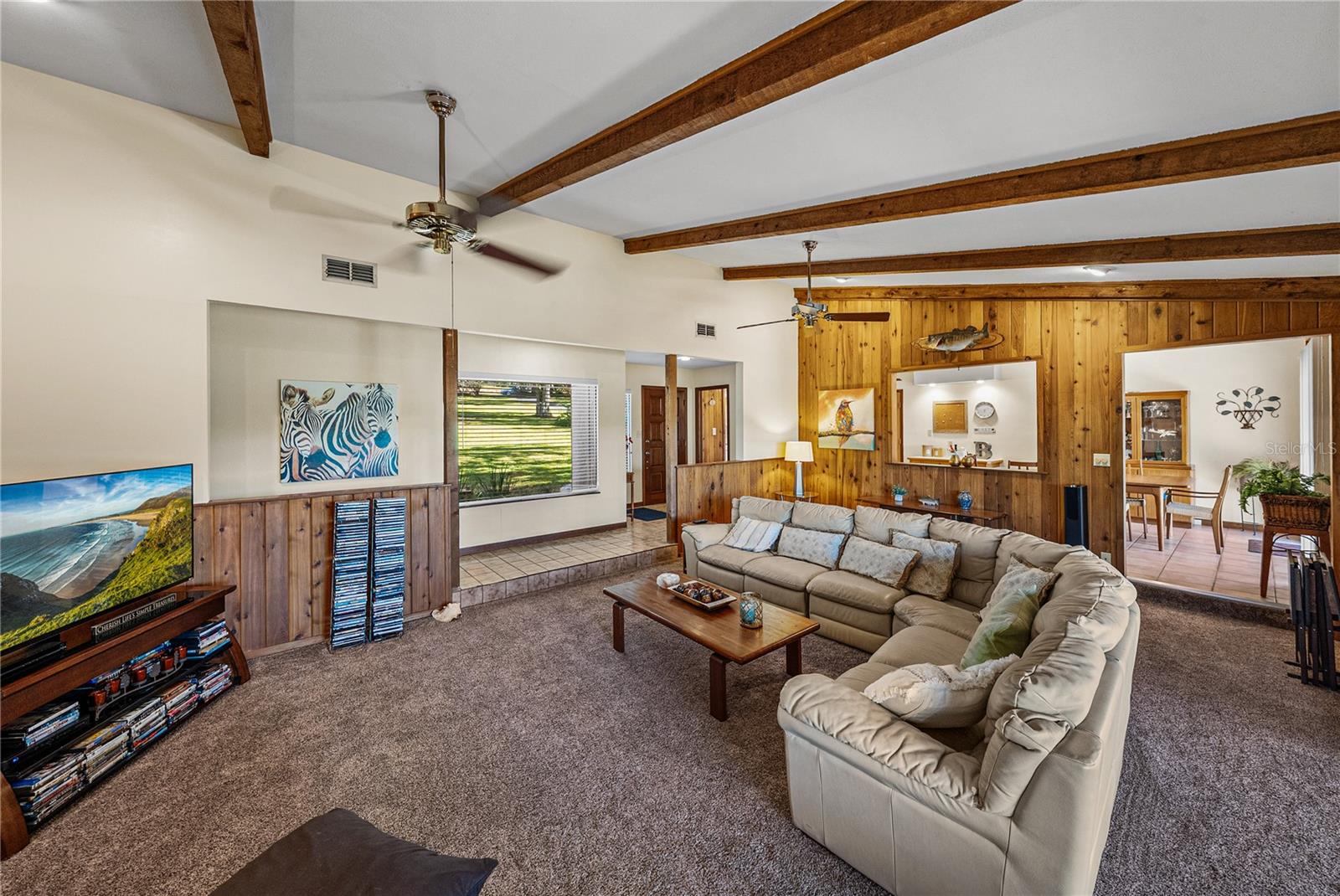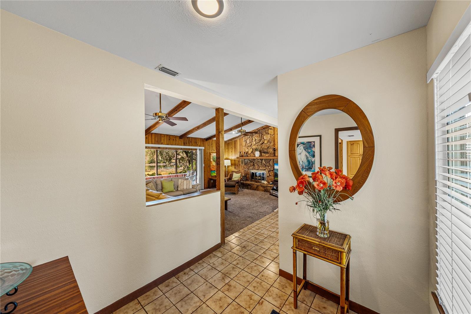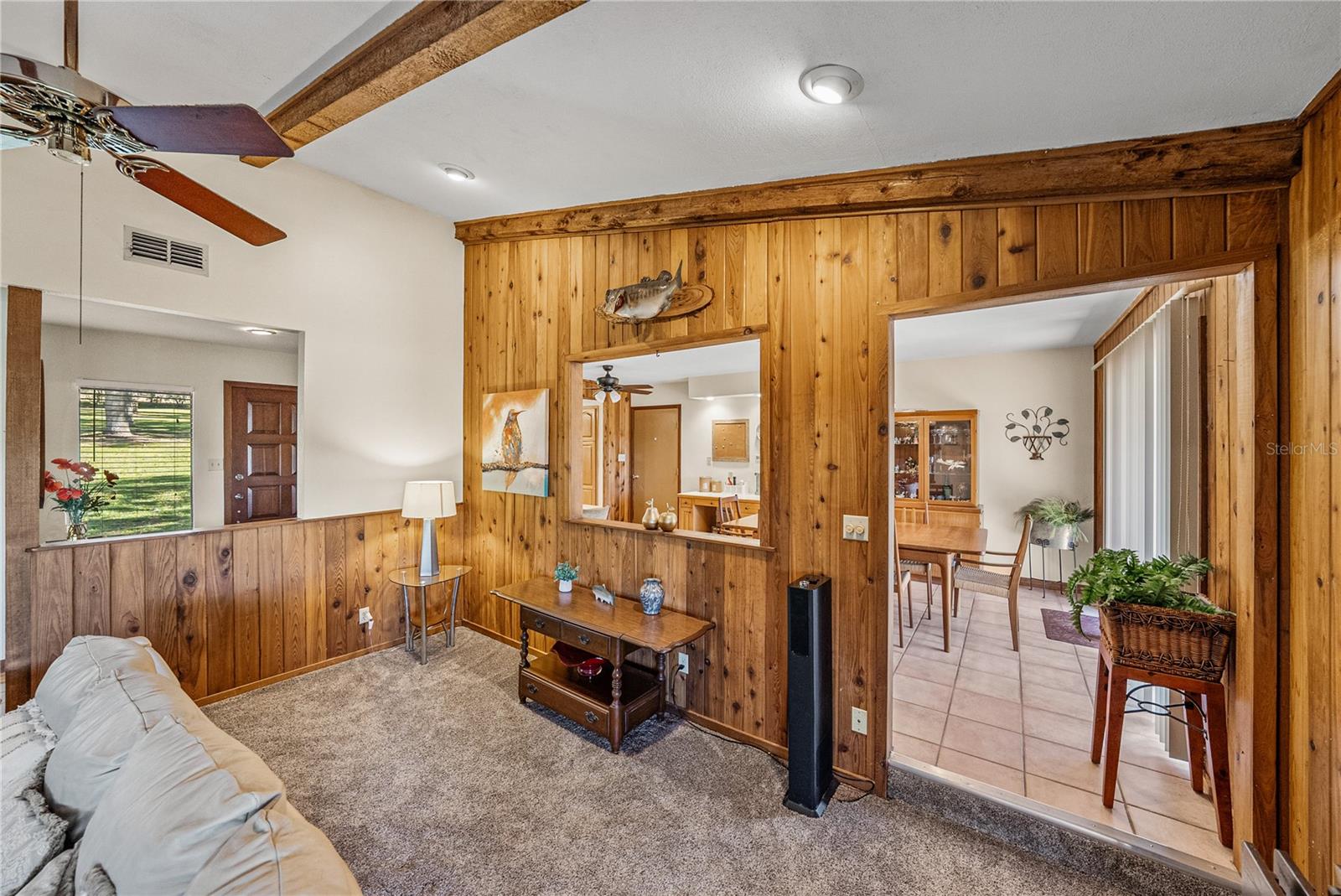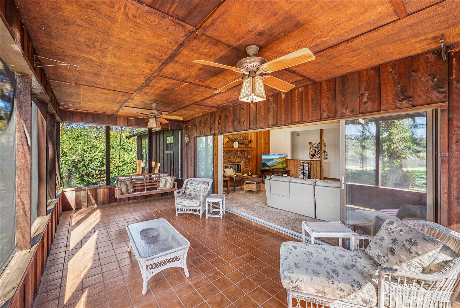 Escape to nearly 3 acres of pure Florida tranquility in this peaceful, rustic-style lakeside retreat offering 180 feet of sparkling water frontage, sweeping views, a 2024 roof, a 2025 AC, and a lush tropical landscape dotted with grand, mature shade trees. Though you’re just minutes from downtown Dade City, this 3 bedroom, 2 bath, 4 car garage property feels worlds away, your own private lakeside getaway. Step inside to a warm, welcoming layout where spacious, dedicated rooms flow easily from one to the next. The striking 24x15 living room is a true showpiece: rich wood paneling, wood-beam accents, a floor-to-ceiling stone fireplace with wood mantle, and quadruple recessed sliders that open wide to the screened porch and serene lake views. A passthrough window connects the living room to the kitchen and dining area, keeping the heart of the home connected. And what a kitchen it is- an dream for anyone who loves to cook. Joined seamlessly with the dining room for a genuine eat-in experience, it offers a gas range, refrigerator, dishwasher, generous prep and storage space, a built-in breakfast bar, and a convenient desk nook. A sliding door leads directly to the open deck overlooking the water, perfect for morning coffee or evening unwinding. Just off the kitchen, the garage and laundry access make daily routines effortless, from groceries to chores. The private bedroom wing features three comfortable bedrooms with plush carpeting and ceiling fans. A full guest bath with a tub/shower combo sits conveniently in the hallway. The primary suite stands out with a spacious walk-in closet and an ensuite bath complete with dual sinks and a walk-in shower. Outside, the possibilities are endless. Enjoy the open deck, screened porch, sprawling yard, or the dock that puts you right on the water. There’s an attached 2 car garage plus a detached 2 car garage, ideal for projects, storage, or extra enclosed parking. Spend your days soaking up sunshine, tinkering in the workshop spaces, heading into town for local events, or simply relaxing while the lake breeze drifts through the trees. This is the kind of place people dream about- private, peaceful, and filled with natural beauty. This is lakeside living at its best, schedule your private showing today!