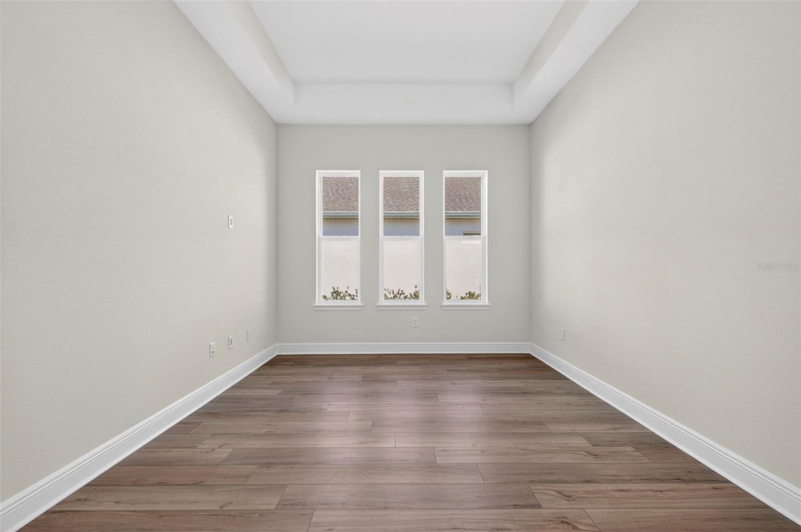 One or more photo(s) has been virtually staged. Experience elevated Florida living in this beautifully appointed Serena floor plan built by ICI Homes, Boasting 2,133 square feet of thoughtfully designed, single-story living with 3 bedrooms, 2.5 baths, a private office, and a highly desirable three-car tandem garage. A welcoming foyer draws you into the home and toward the covered, screened lanai and backyard, creating a seamless indoor-outdoor connection. Two secondary bedrooms are positioned at the front of the residence and share a full bath, providing comfort and privacy for family members or guests. A dedicated office with French doors and generous windows delivers a bright and flexible space for remote work, study, or a quiet retreat. The nearby laundry room is both functional and well-finished, featuring granite countertops, a utility sink, and 42-inch upper cabinetry for added storage. At the center of the home, the expansive living room and gourmet kitchen come together in a true open-concept design ideal for entertaining. The kitchen showcases a double-door pantry, abundant soft-close cabinetry and drawers, and solid wood pull-out shelving in every lower cabinet. Premium GE Profile stainless steel appliances include a built-in convection oven and microwave, cooktop, dishwasher, smart four-door French-door refrigerator, and an exterior-vented stainless steel range hood. The dining and living areas flow effortlessly to the lanai, creating an inviting setting for gatherings or relaxed evenings at home. Water-resistant Luxury vinyl plank flooring runs throughout the main living spaces, complemented by crown molding and 8ft interior doors that enhance the home’s upscale presence. The primary suite has been thoughtfully extended to create a serene private retreat. The spa-inspired ensuite bath features a dual-sink granite vanity and a frameless glass walk-in shower with river-rock flooring, built-in bench, and recessed niche. A spacious walk-in closet with an upper storage shelf provides exceptional storage. Outdoor living continues on the brick-paver screened lanai, pre-plumbed for a future summer kitchen and equipped with a roll-down privacy screen. The backyard offers ample space to design a personalized outdoor oasis. The oversized tandem garage accommodates 3 vehicles or generous storage and hobby space, and includes a 220-volt outlet for an electric vehicle or golf cart, a water-softener loop, and pre-wiring for security and surround sound in the living room, primary suite, and lanai. Located within the sought-after Lake Jovita master-planned community, residents enjoy a 36-hole championship golf course, scenic walking trails, social clubs, and an impressive clubhouse with fitness center and dining. Just minutes from historic downtown Dade City, with convenient access to Tampa and Orlando, this exceptional home delivers Luxury, lifestyle, and location.