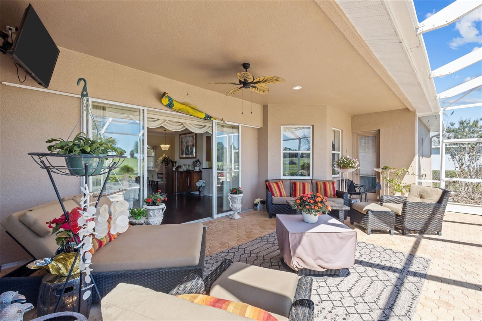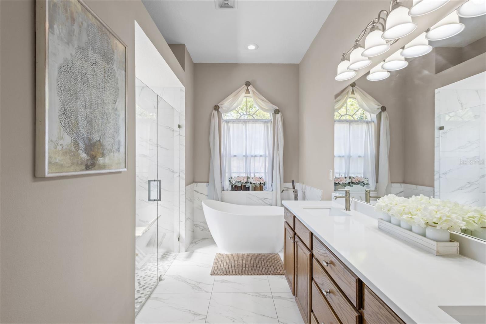 Welcome to LAKE JOVITA Golf & Country Club, where luxury living meets breathtaking golf course views! This fully UPDATED 4-bedroom, 2-bath home with a 3-CAR GARAGE sits on nearly HALF AN ACRE, perfectly positioned on the 3rd HOLE of the North Course, offering privacy, space, and sweeping fairway views. From the moment you arrive, the IMPRESSIVE curb appeal sets the tone - elegant pavers guide you to stunning double glass entry doors that flood the home with natural light making it bright and cheerful throughout the day. Inside, rich wood flooring runs through the living areas and bedrooms. TRAY ceilings and double crown molding elevate the spacious living room. The designer kitchen is both stylish and functional, featuring granite countertops, a 2024 GE Café refrigerator, and a 2022 Bosch dishwasher - perfect for everyday living and entertaining alike. Retreat to the expansive primary suite, featuring its own tray ceiling, privately located on the entire WEST wing of the home. This serene space features an electric fireplace, DUAL closets (including a walk-in), and a versatile dressing area. The spa-inspired ensuite is a true showstopper, featuring a freestanding soaking tub, seamless designer tile throughout, dual vanities, and a luxurious quartz countertop. Additional bedrooms continue the upscale feel with wood flooring, while the secondary bathroom has been beautifully upgraded with MATCHING tile, quartz, and a frameless glass shower. Step outside and prepare to be impressed: your fully screened outdoor OASIS delivers PANORAMIC golf course views, creating the perfect setting for morning coffee, sunset dinners, or relaxing evenings with your favorite drink in hand. Peace of mind comes included with a NEW ROOF (2024) and a water softener (2022), plus the washer and dryer convey with the home. LIVING in Lake Jovita Golf & Country Club means enjoying a true RESORT-style lifestyle with access to two championship 18-hole golf courses, on-site dining, pickleball, tennis, basketball courts, a fitness center, park, and dog park - all within a secure, gated setting. Conveniently located with easy access to major highways and everything the Greater Tampa Bay area has to offer. This is more than a home - it’s a golf course retreat designed for those who appreciate style, comfort, and an elevated way of living. Come experience it for yourself!