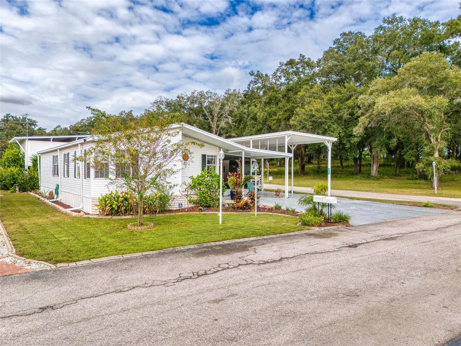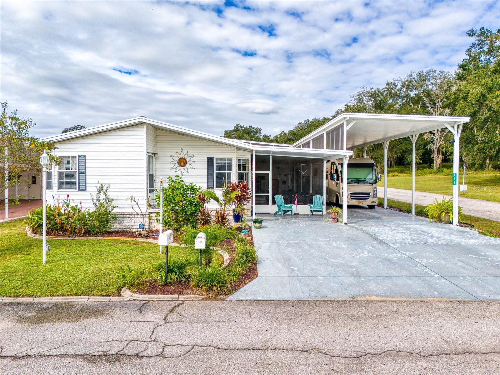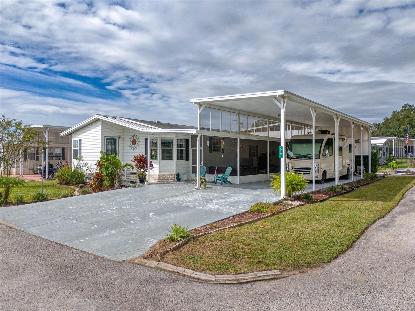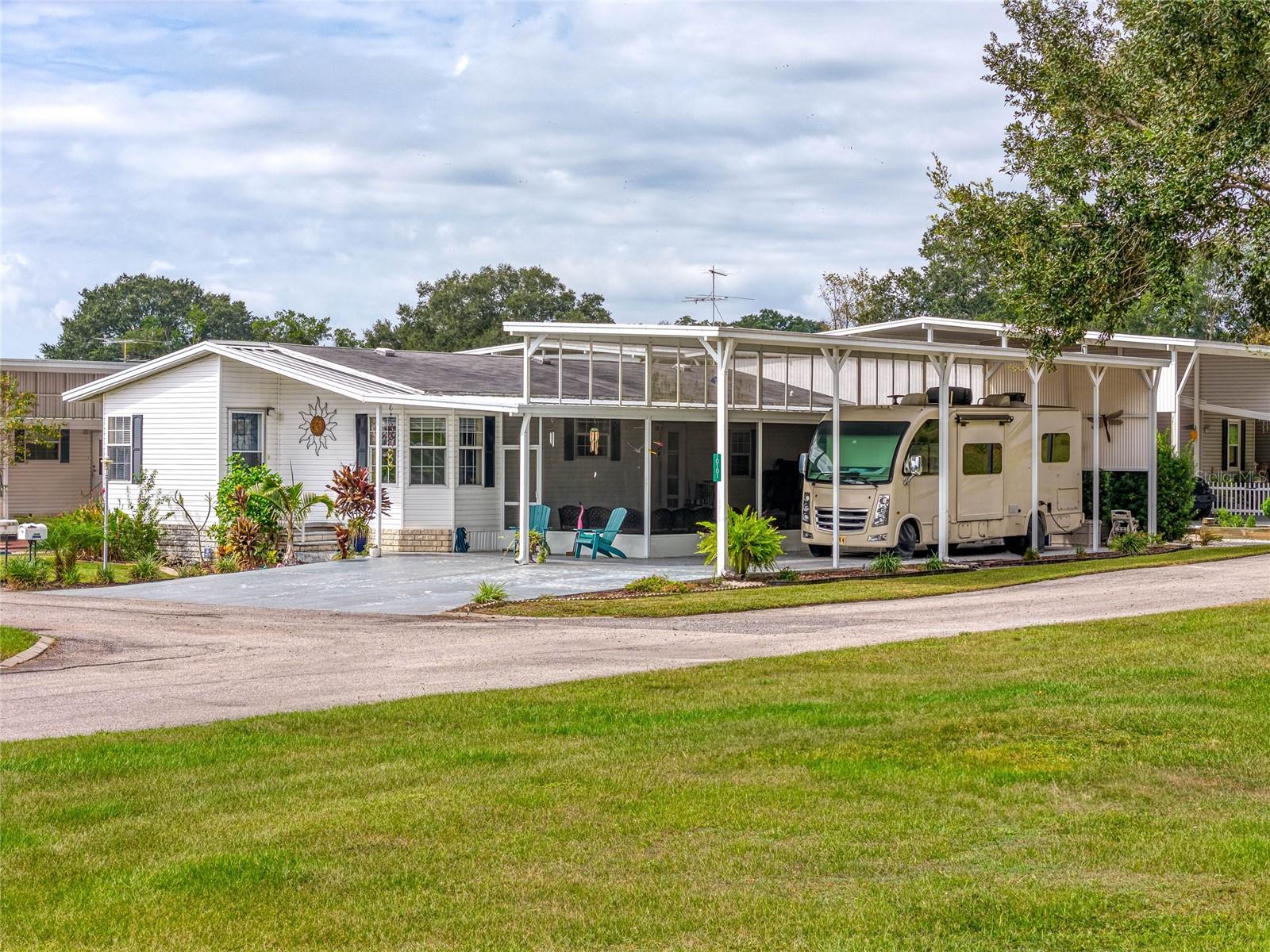 MOVE-IN READY! Bring the RV! Sellers are open to rent or lease options on this beautifully maintained 2-bedroom, 2-bath manufactured home, perfectly situated on a corner lot in the active 55+ community of Hampton Court in Dade City. Enjoy a spacious open floor plan with high ceilings, neutral finishes, and a large screened lanai—perfect for Florida living. The kitchen offers a center island, cooktop, stainless steel appliances, and plenty of cabinets, while the master suite features a walk-in closet and dual vanity. RV lovers will appreciate the huge 26’ x 53’ covered carport with 50-amp and 30-amp hookups, sewer, water, and electric—ideal for all sizes of RVs. Community amenities include a heated pool, clubhouse, pickleball, shuffleboard, bocce ball, crafts, bingo, and more. Maintenance fees cover water, sewer, trash, and grounds. Conveniently located just 2 miles from shopping, dining, and medical facilities. YOU OWN THE LAND—no lot rent! Don’t miss this chance to own (or lease) a low-maintenance home in a vibrant community. Schedule your private showing today!