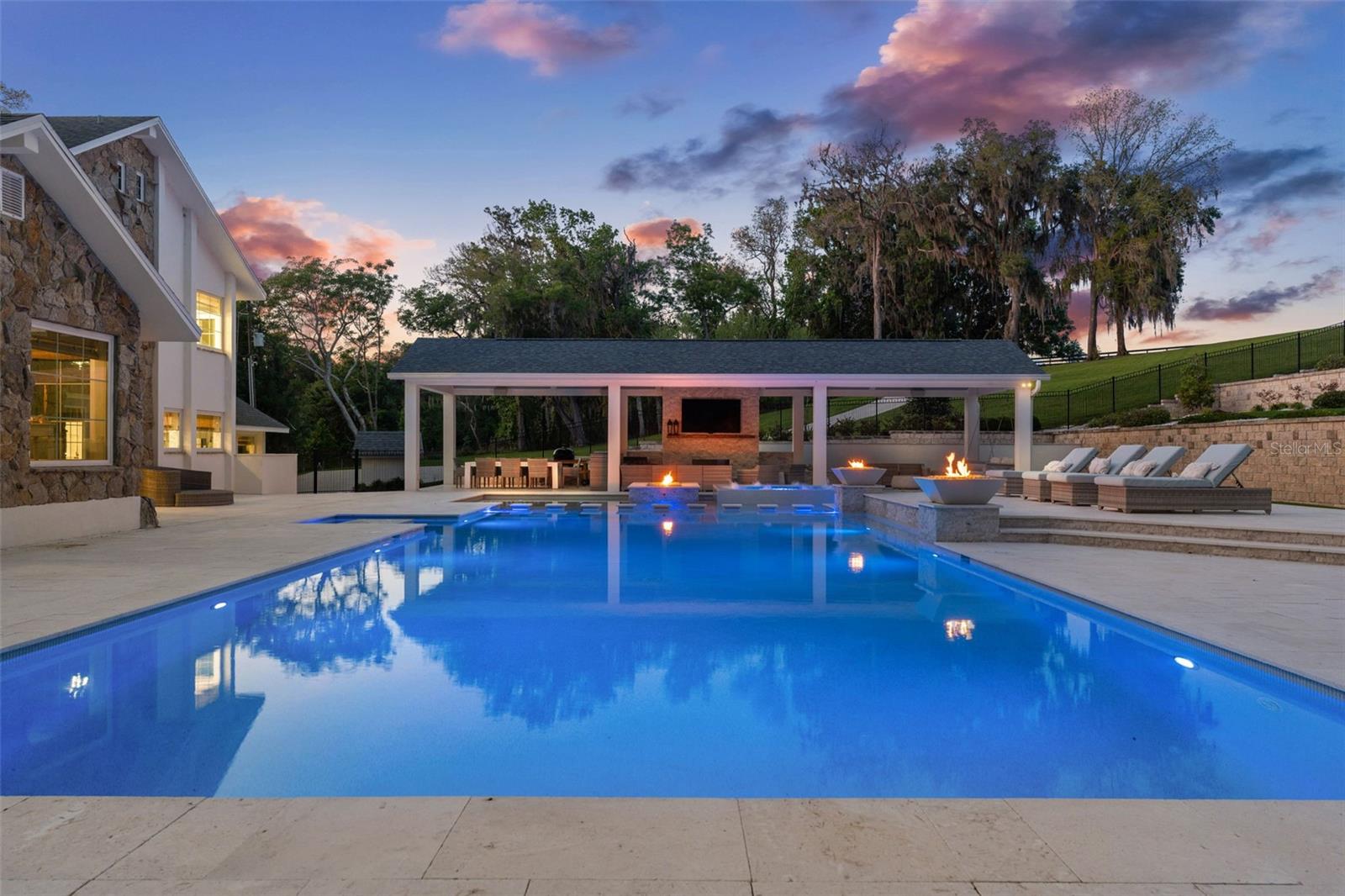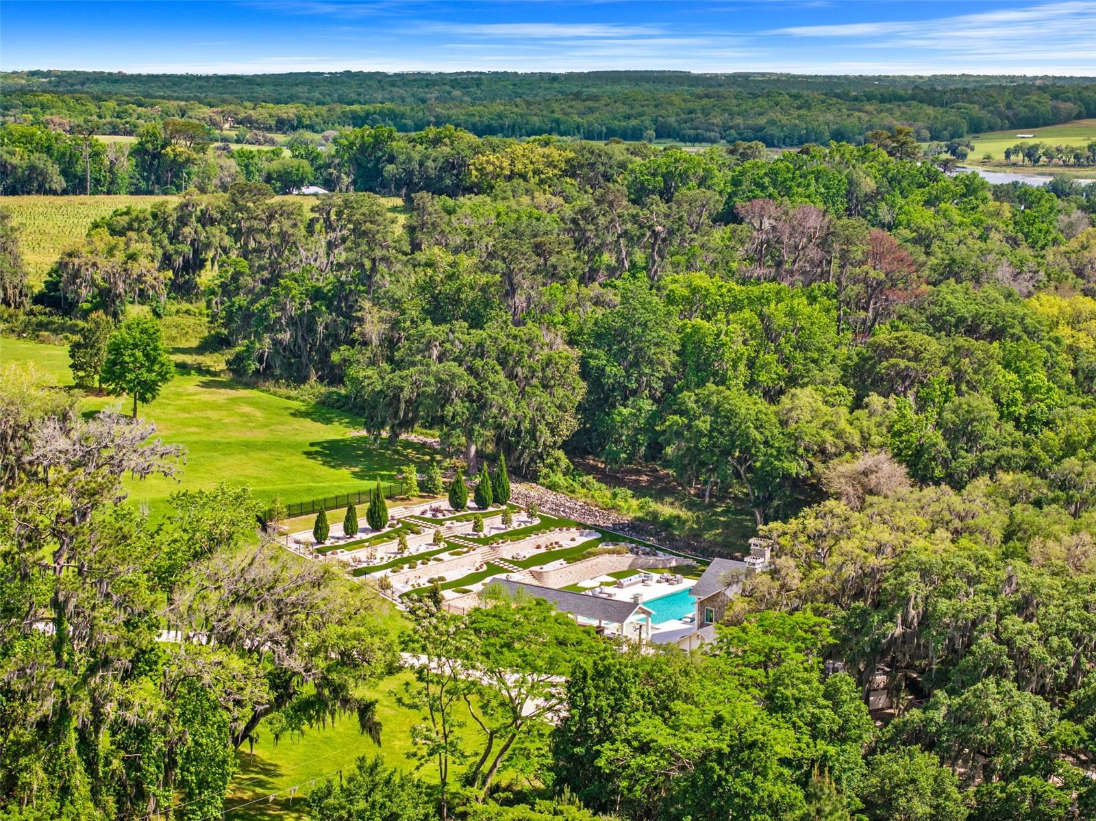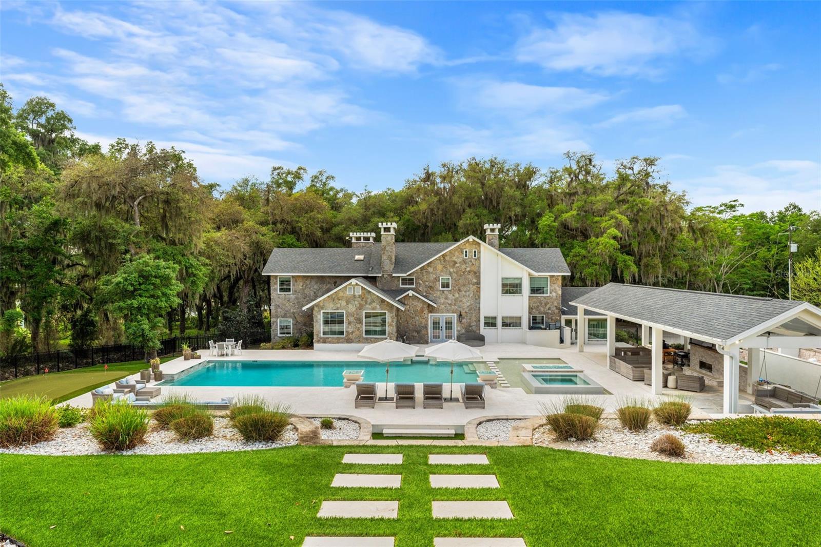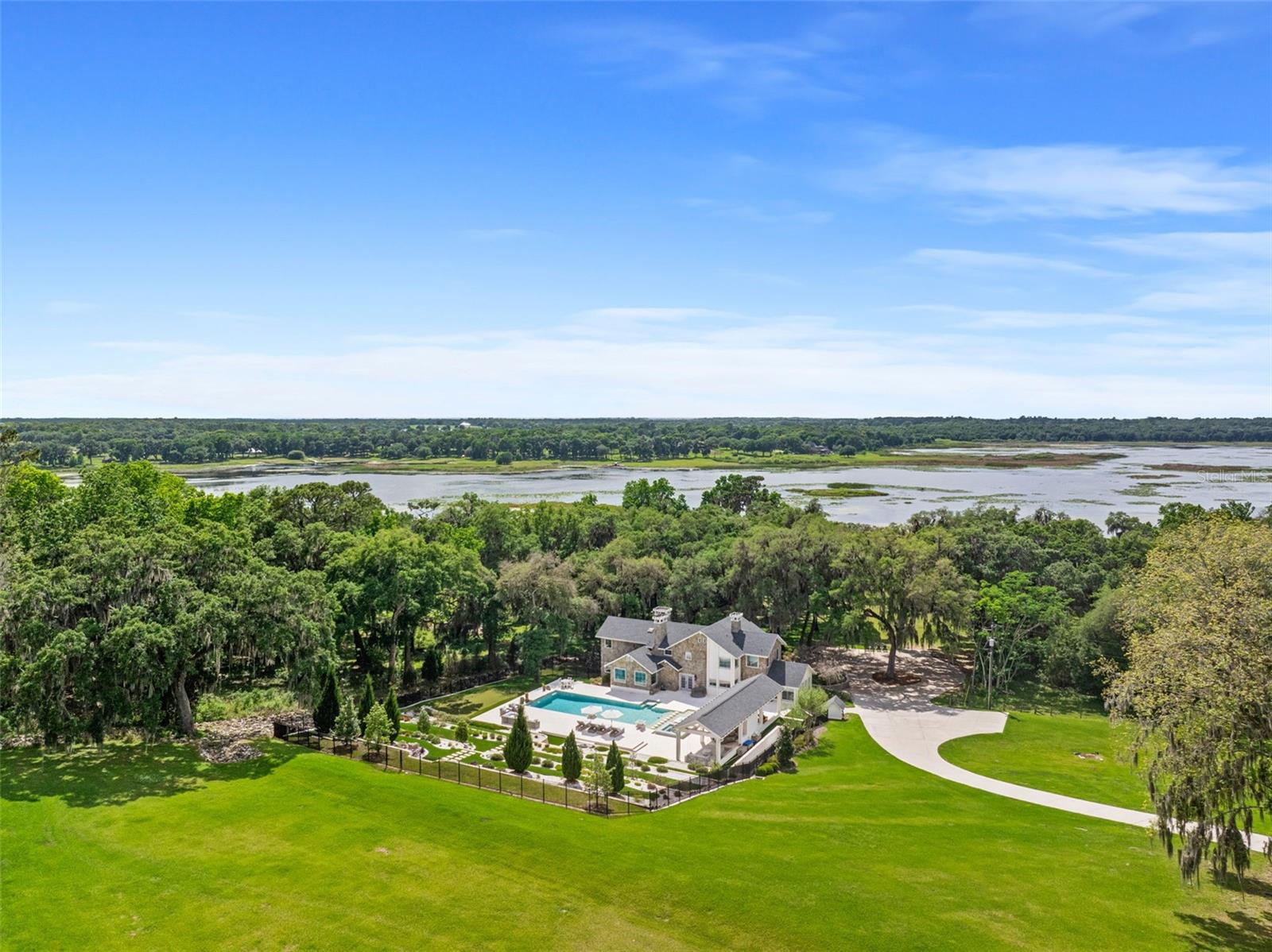 A home like this becomes available only once in a lifetime. Indulge in the epitome of luxury at this private lakefront estate in the heart of Central Florida. Located in historic Dade City and within an hour’s drive of Tampa/St. Pete, there are grand views greeting you from every window. Whether you’re seeking a main residence or a private getaway, this home and surrounding ten acres are an idyllic escape to paradise. Exquisitely remodeled, nearly 5000 sq ft of living space, and a spectacular pool with an entertainment pavilion exudes Florida living at its best. The meticulously landscaped grounds span from the gated entrance to the private scenic lake with an expansive dock perfect for watching sunsets over the lake that paint the sky with hues of orange and pink. Inside the home you’ll find an eat-in chef’s kitchen with fireplace, professional-grade Viking appliances, beautiful quartz countertops, and an abundance of workspace and storage options ensuring effortless organization. In the living room, you will discover soaring ceilings and an oversized wood-burning fireplace with a one-of-a-kind custom mantle, and floor-to-ceiling windows that offer sweeping views of the property and lake. The master bedroom is an oasis of tranquility and luxury, boasting a stone fireplace, sitting room, huge designer closets, and a resort-style bathroom where indulgence meets elegance in every detail. Each of the bedrooms and supplementary rooms have an abundance of natural light and offer flexible usage options, accommodating diverse needs easily. Their architectural finesse and aesthetic appeal stand in harmony with the distinguished main areas of the home, ensuring a cohesive and impressive experience throughout the entirety of the property. Embrace luxury in the pool area while finding sheltered comfort under a spacious covered entertainment area with outside dining. Lounge in style on several tiered sun pads. Admire the beautiful mixed stonework, adding a touch of elegance to the surroundings. Indulge in relaxation with a dip in the large spa or resort-sized pool. Perfect your putting skills on the putting green. Enjoy cozy evenings by multiple gas fire-features, adding to the warm ambiance throughout. Experience maximum privacy with the tiered stone and landscaped architectural wall that serves as a grand backdrop to the pool area. A separate outdoor barbecue area near the lake beckons with its inviting seating arrangements and a cozy fire pit, equipped with power for decorative lighting. From this vantage point, you can overlook your new dock, a gateway to endless kayaking adventures on the tranquil waters. There are more amazing details to this one-of-kind home than MLS can hold, please ask your agent to see the features sheet for more information.