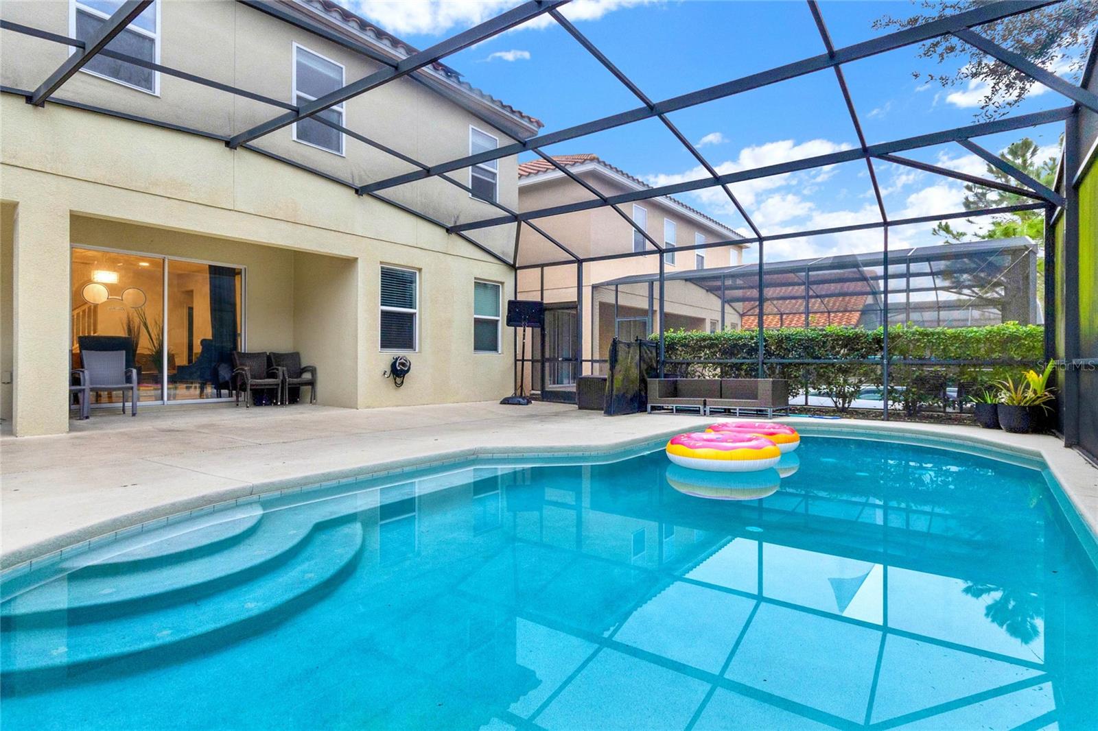 It’s about LOCATION and Opportunity!! The Solterra Resort Community is located less than 30 minutes from Disney World and the surrounding amenities of the Magic Kingdom. Your new home has several amazing features making it a perfect forever home or as a VACATION HOME with a heated, enclosed, in-ground private pool featuring 6 bedrooms, 5 full baths. This house offers a robust dining area and a family room located next to the kitchen. The open concept of living space allows all the family to gather closely but still have space. This home also features solar panels that are owned and will stay with the home. The Solterra Resorts Community offers a clubhouse with a fitness center, a large pool with beach entry, a waterslide, tennis courts, a lazy river, a poolside café, and much more. Location is everything and you will be within a short drive to all the outdoor activities, entertainment, restaurants, and shopping you can do when you make this home yours.