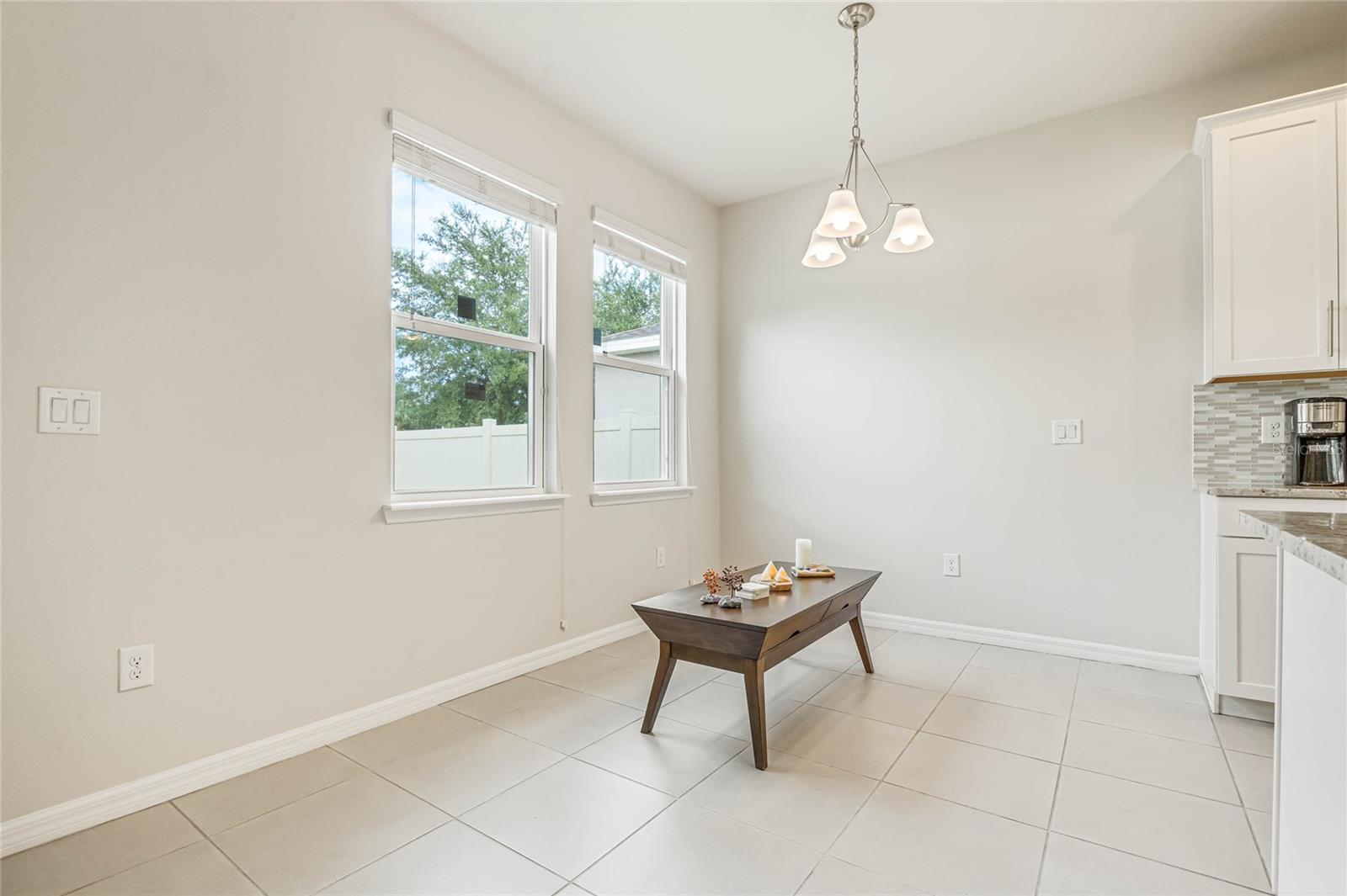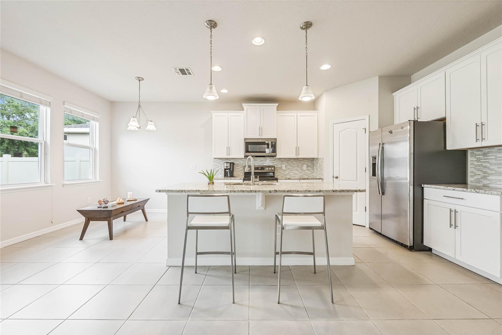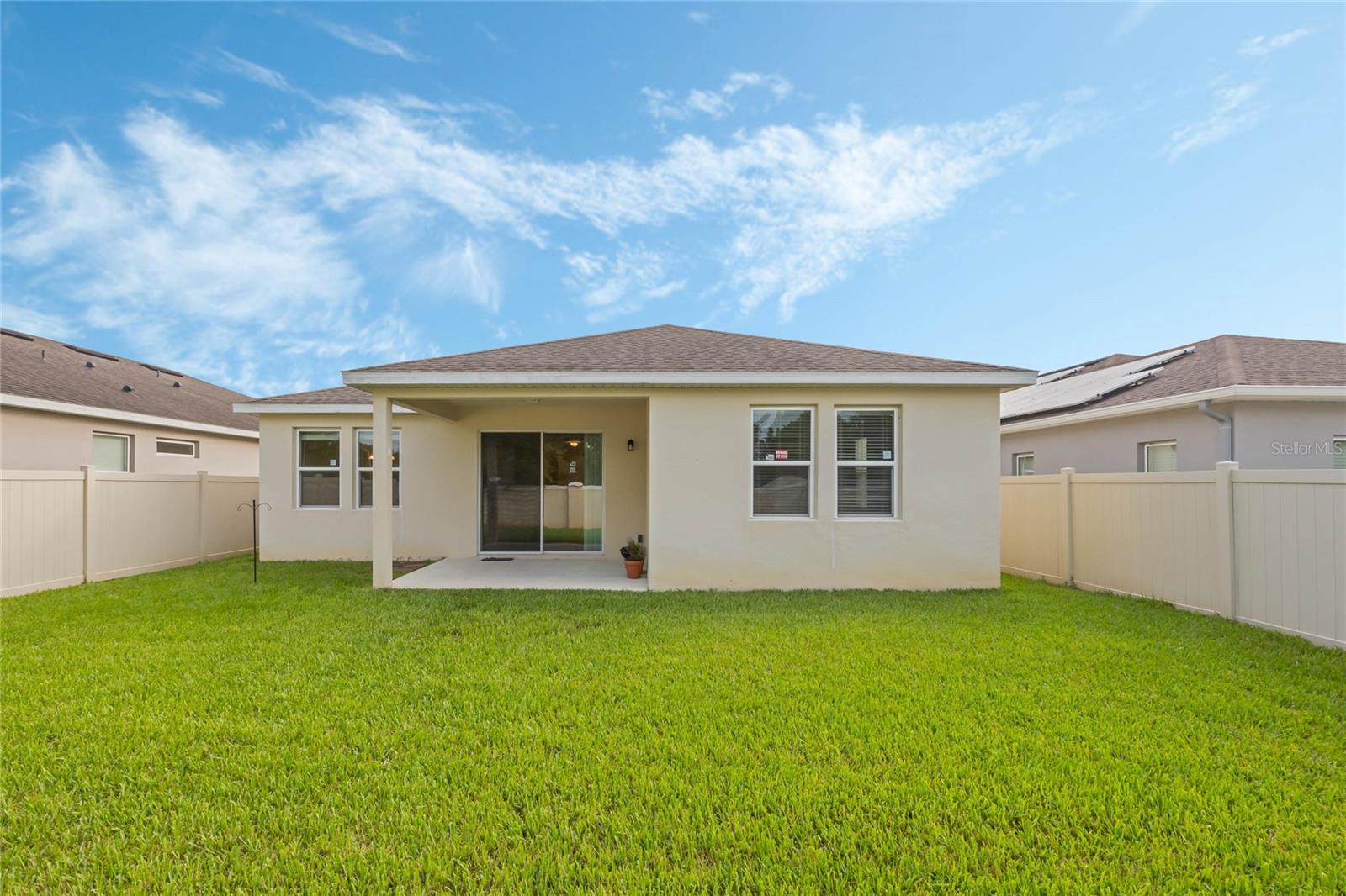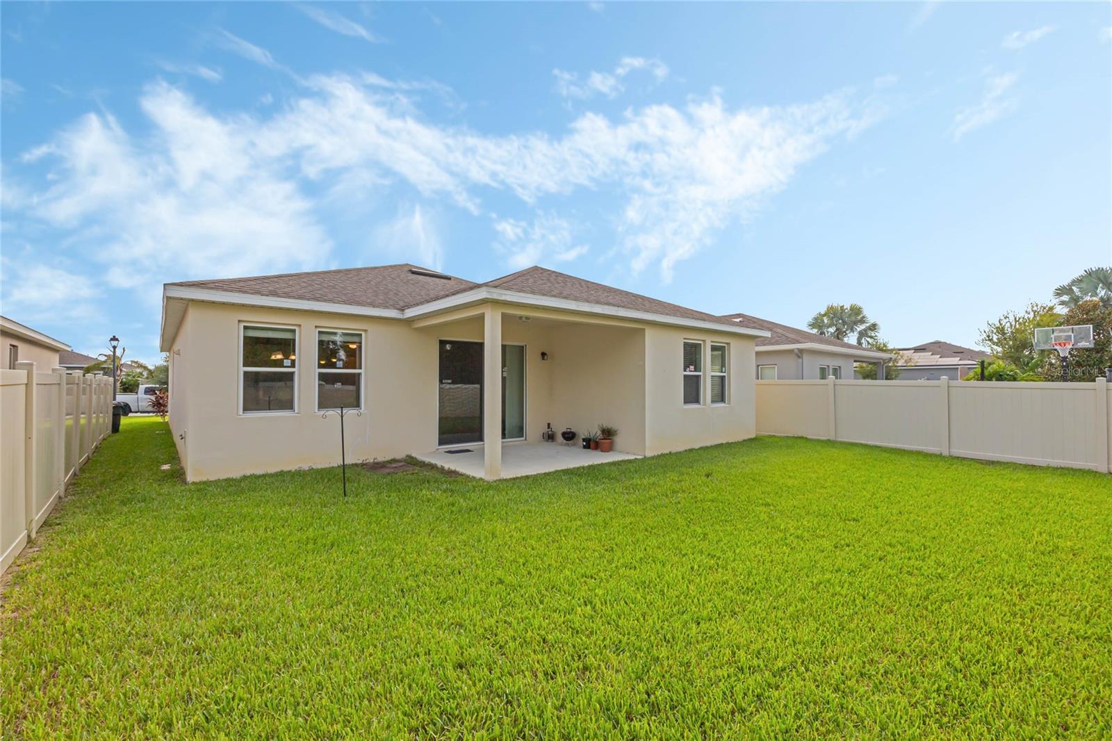 Welcome to this stunning 3-bedroom, 2-bathroom home, built in 2018 and boasting 1,675 sq ft of modern living space. As you approach the home, you'll be greeted by a beautifully landscaped front lawn and a meticulously crafted paver driveway, setting the stage for the elegance that awaits inside. Upon entering, you'll immediately be captivated by the soaring high ceilings and the abundance of natural light that flows effortlessly throughout the home. The thoughtfully designed split floor plan ensures optimal privacy for the whole family, with the primary bedroom on one side of the home and the additional two bedrooms on the other. The secondary bedrooms, located near the entry, provide plenty of space, natural light, and ample storage, making them perfect sanctuaries for everyone in the family. As you continue down the main hallway, you'll discover the heart of the home—the open layout of the living room, dining room, and kitchen. This inviting space ensures that you'll never miss a moment with your loved ones, whether you're preparing dinner or enjoying a cozy movie night together. The kitchen is a true chef's delight, featuring gorgeous modern finishes, a large kitchen island with a breakfast bar, stainless steel appliances, and an abundance of storage and counter space. The stylish backsplash adds a touch of elegance, while the ample natural and recessed lighting illuminate the entire space, making meal prep for any occasion feel effortless. The dining and living areas are ideal for spending quality time with loved ones, with a spacious layout and large windows that bathe the space in natural light. The primary bedroom is your personal oasis, complete with dual walk-in closets and an en suite bathroom. The bathroom features a dual vanity for added convenience, a large walk-in shower, and a sizable soaking tub—perfect for unwinding after a long day. Stepping outside, you'll find a covered patio and a large backyard, perfect for al fresco dining and summer BBQs in the warm Florida weather. The fenced backyard offers a secure space for little ones or four-legged friends to roam freely and enjoy the outdoors. The fun doesn't stop at home—this community offers amazing HOA amenities, including a stunning pool and playground area. With easy access to major highways, you're just minutes away from everything Central Florida has to offer, including top-notch shopping, dining, and entertainment. And with Walt Disney World only a 20-minute drive away, magic is always within reach. Don't miss your chance to own this gorgeous home in an unbeatable location. Schedule your private showing today and experience the perfect blend of modern living and Florida charm!