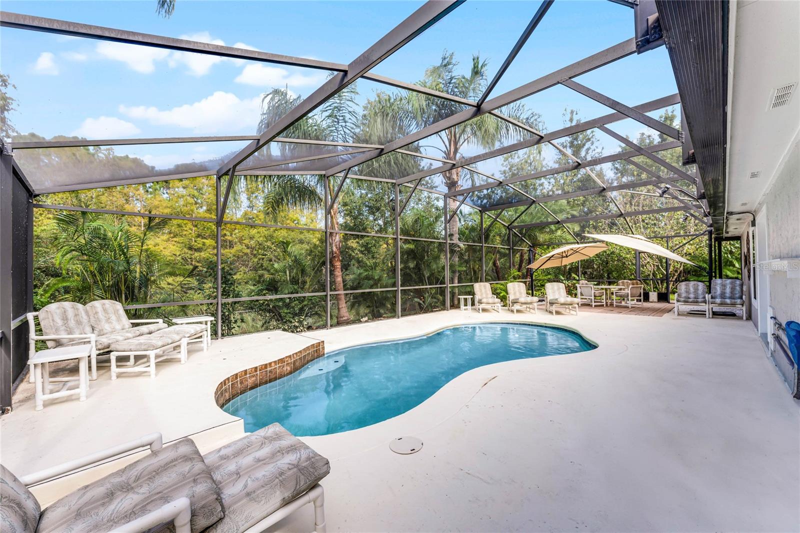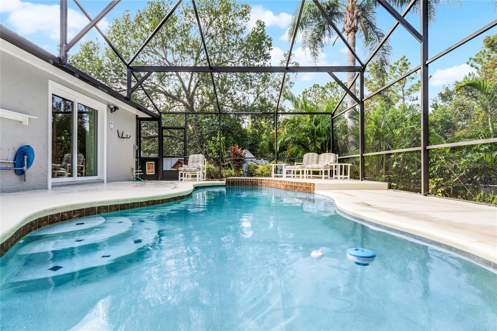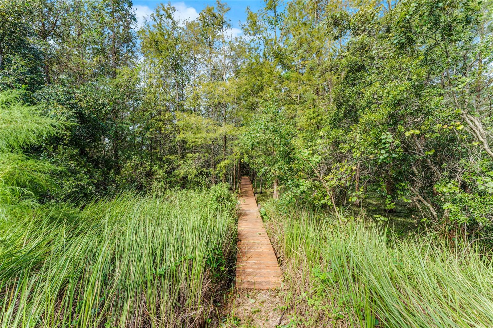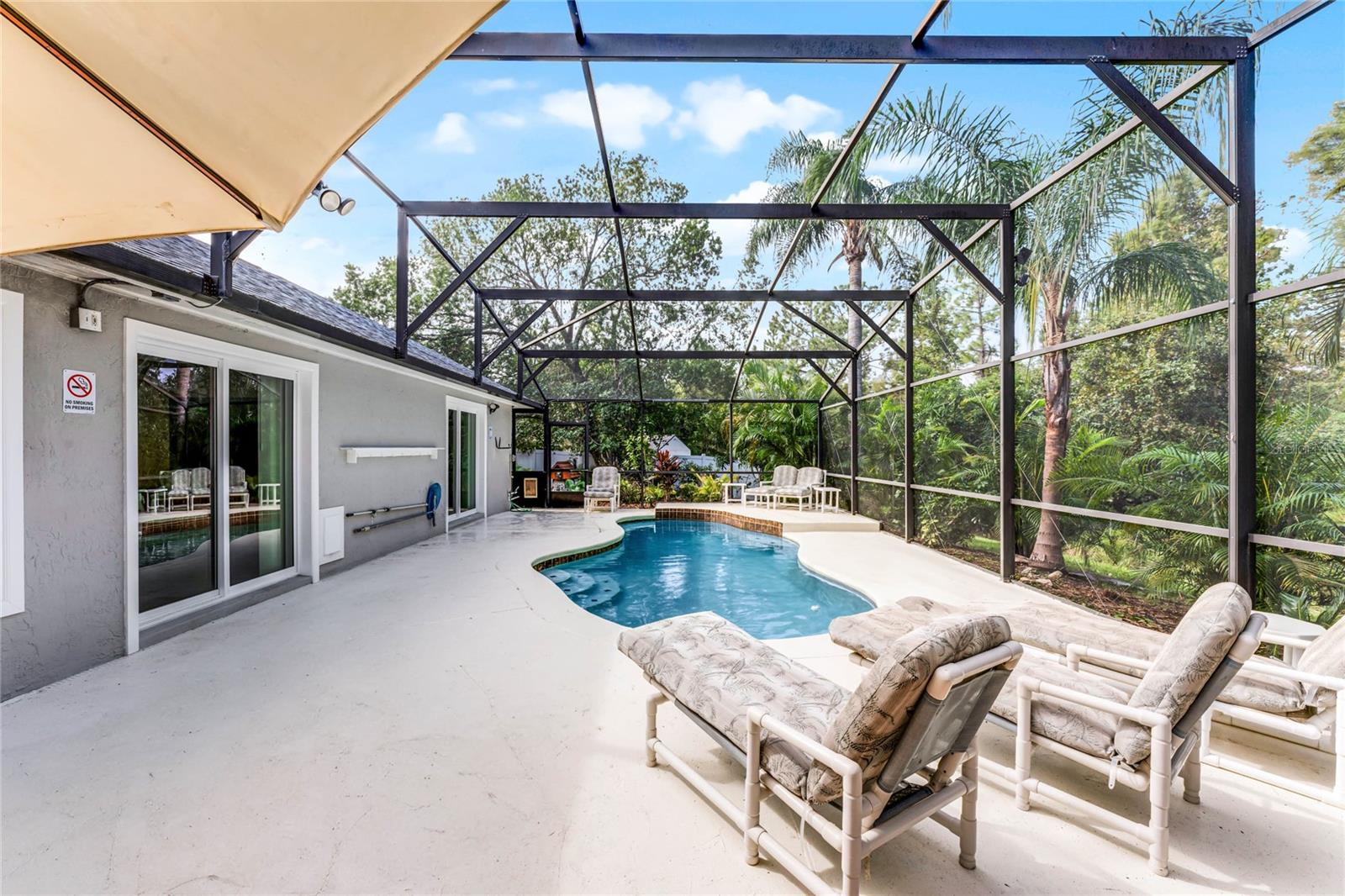 Welcome home to your tropical oasis in the heart of Champions Gate. This 3 bedroom, 2 bath pool home really is a hidden gem, situated on over 2.11 acres on a cul de sac in the Loma Linda community. As you enter the home the renovated kitchen is to your left, with self closing, pull out shelving offering plenty of storage, a breakfast nook and breakfast bar. The kitchen then opens up to the family room, offering plenty of space to sit and enjoy the spectacular views of the pool and tranquil garden beyond. Sliding glass doors and a picture window makes the space bright and airy. To the left of the home is the primary suite, with a spacious bedroom and sliding glass doors onto the lanai, newly appointed closets and a updated bathroom with vanity. To the right of the home are bedrooms 2 and 3 with a full bathroom in between, bedroom 2 is ensuite giving private access to the bathroom. All bedrooms have new carpet and the whole interior has been freshly painted. A renovated laundry room offers a clothes folding area and plenty of storage, which in turn leads to the bonus room. The 2 car garage was converted into a living/games room which offers endless opportunities, a home office, play room with access to the garden, which is all under AC. The oversized pool and screened in lanai offers so much space for entertaining and relaxing with the family. The fenced in garden is beautifully landscaped, with automatic sprinklers, fruit trees, storage sheds and even a Gnome house. The property extends over 500 feet straight back into a nature preserve. There is a raised walkway that leads you through a nature trail to a private pond and floating dock. Need a space to get away from it all ? Then look no further this truly is a rare find just minutes from Disney, the attractions, restaurants and shopping. The roof is only 3 years old and the hoa is only $23 a month !!! Call today for your own private tour, whether you are looking for full time living, a second home or to rent short/long term this home has it all.