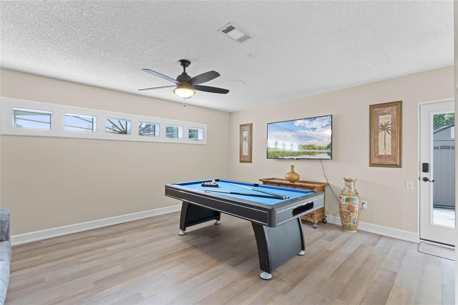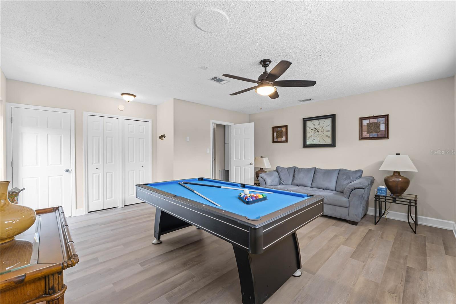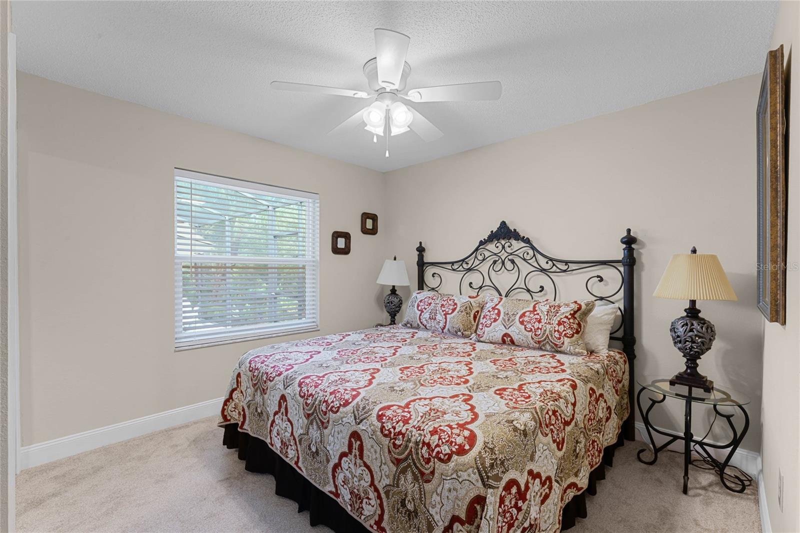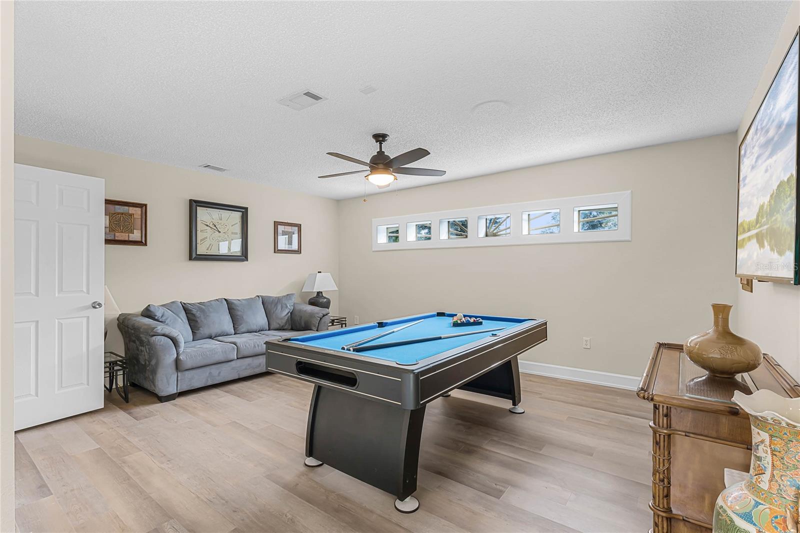 Welcome home to your tropical oasis in the heart of Champions Gate. This 3 bedroom, 2 bath pool home really is a hidden gem, situated on over 2.11 acres on a cul de sac in the Loma Linda community. As you enter the home the renovated kitchen is to your left, with self closing, pull out shelving offering plenty of storage, a breakfast nook and breakfast bar. The kitchen then opens up to the family room, offering plenty of space to sit and enjoy the spectacular views of the pool and tranquil garden beyond. Sliding glass doors and a picture window makes the space bright and airy. To the left of the home is the primary suite, with a spacious bedroom and sliding glass doors onto the lanai, newly appointed closets and a updated bathroom with vanity. To the right of the home are bedrooms 2 and 3 with a full bathroom in between, bedroom 2 is ensuite giving private access to the bathroom. All bedrooms have new carpet and the whole interior has been freshly painted. A renovated laundry room offers a clothes folding area and plenty of storage, which in turn leads to the bonus room. The 2 car garage was converted into a living/games room which offers endless opportunities, a home office, play room with access to the garden, which is all under AC. The oversized pool and screened in lanai offers so much space for entertaining and relaxing with the family. The fenced in garden is beautifully landscaped, with automatic sprinklers, fruit trees, storage sheds and even a Gnome house. The property extends over 500 feet straight back into a nature preserve. There is a raised walkway that leads you through a nature trail to a private pond and floating dock. Need a space to get away from it all ? Then look no further this truly is a rare find just minutes from Disney, the attractions, restaurants and shopping. The roof is only 3 years old and the hoa is only $23 a month !!! Call today for your own private tour, whether you are looking for full time living, a second home or to rent short/long term this home has it all.