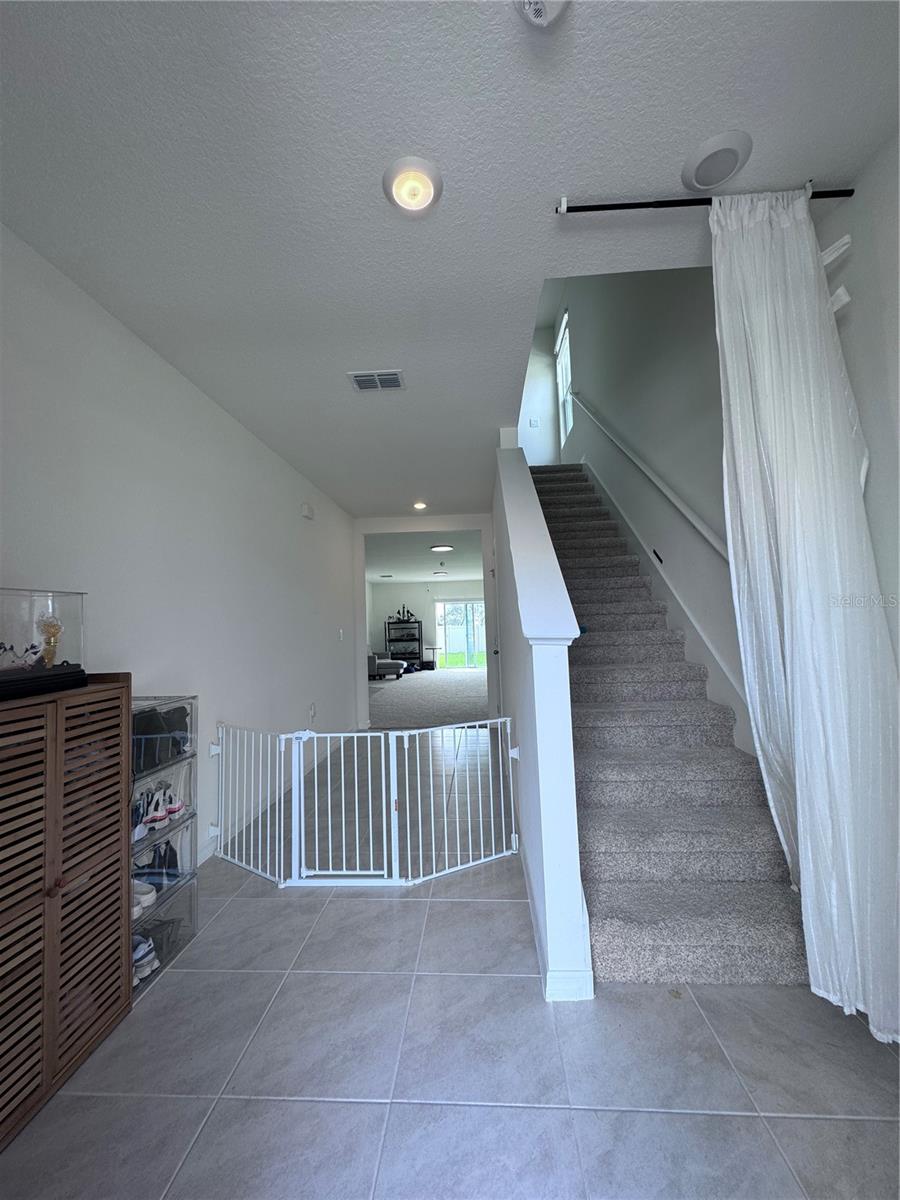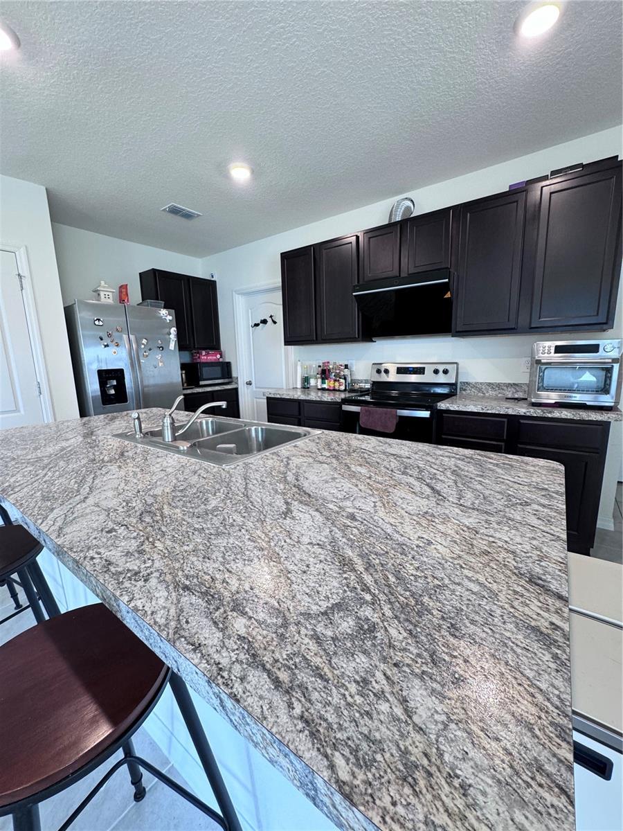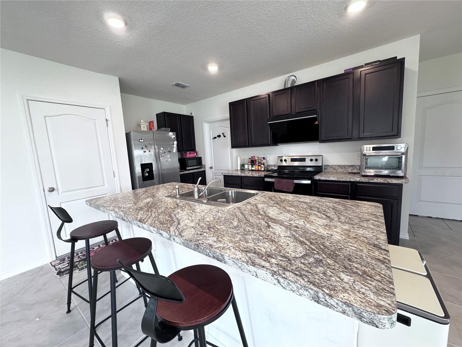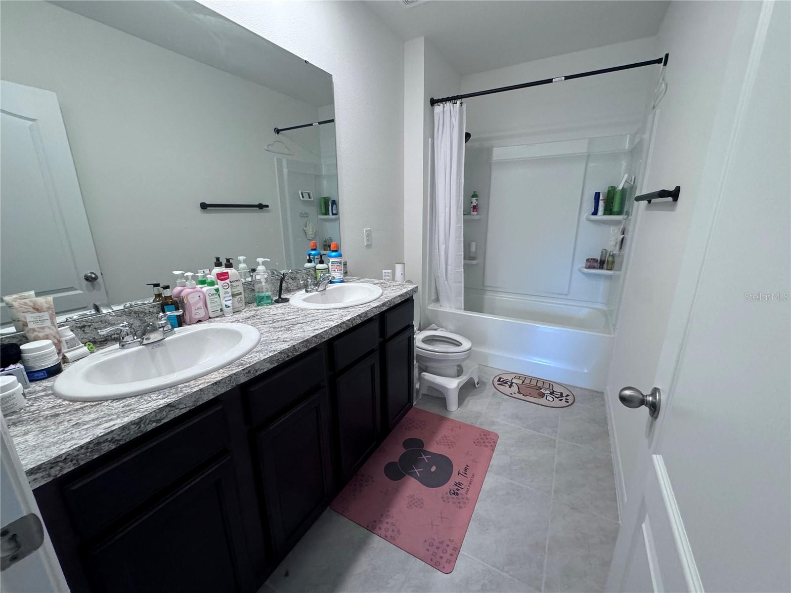 this stunning single-family home in Davenport, FL, sits on an oversized, fenced corner lot with a huge backyard. The all-concrete block construction offers 5 bedrooms and 3 bathrooms with an open-concept design that maximizes living space. The modern kitchen, overlooking the dining area and great room, features a large island with bar seating, ample cabinets, counter space, and stainless-steel appliances—ideal for entertaining. The main floor includes a bedroom, and a full bathroom. Upstairs, the master suite is a private retreat with an ensuite bathroom, along with three additional bedrooms, a second living area, a full bathroom, and a laundry room. Upgraded countertops in the kitchen and bathrooms, plus enhanced flooring in two bedrooms, add elegance throughout. Located close to shopping and the hospital, this home also includes a smart home technology package for seamless control from your smart device. Schedule your showing today to experience this spacious and inviting home!