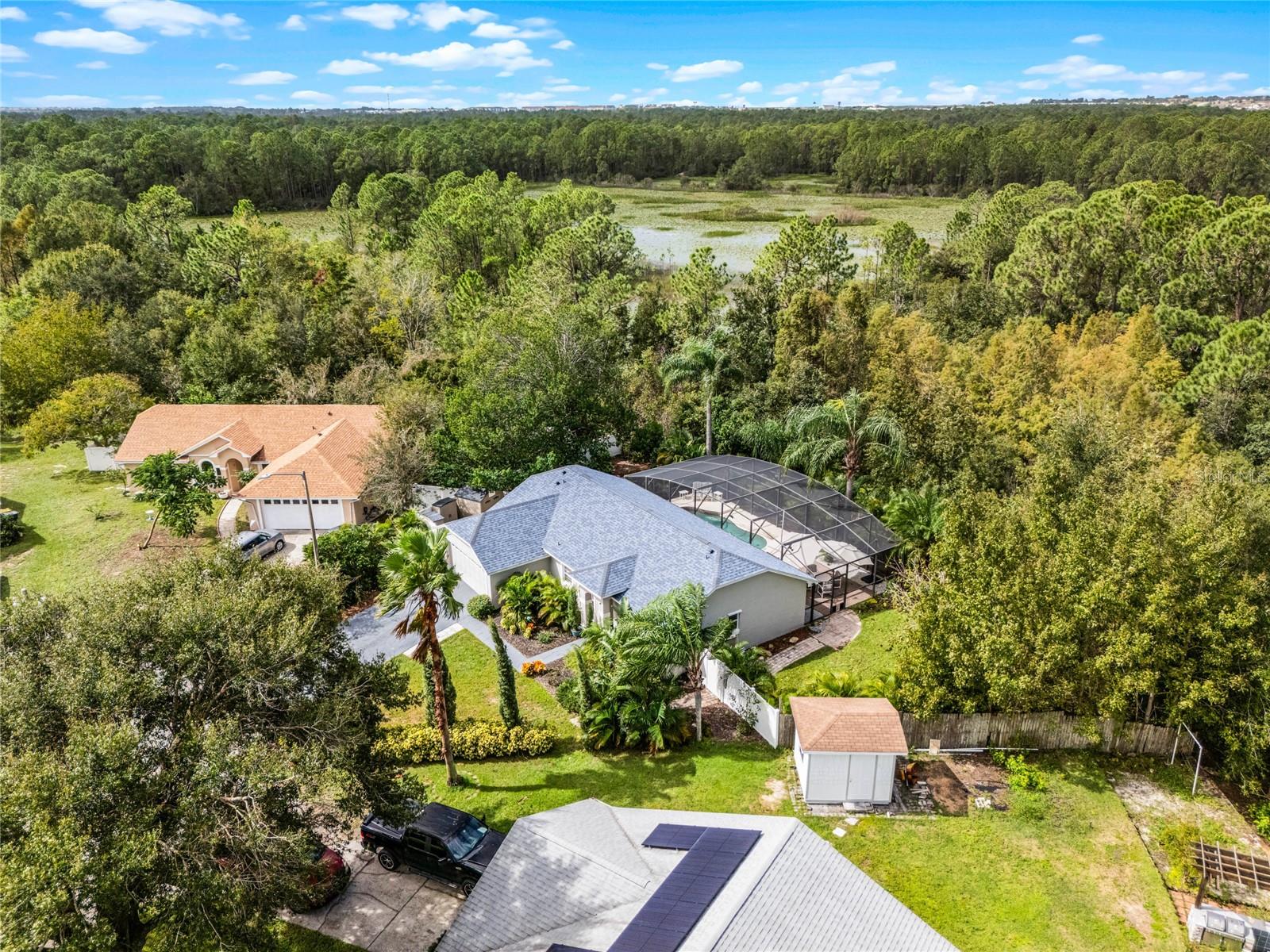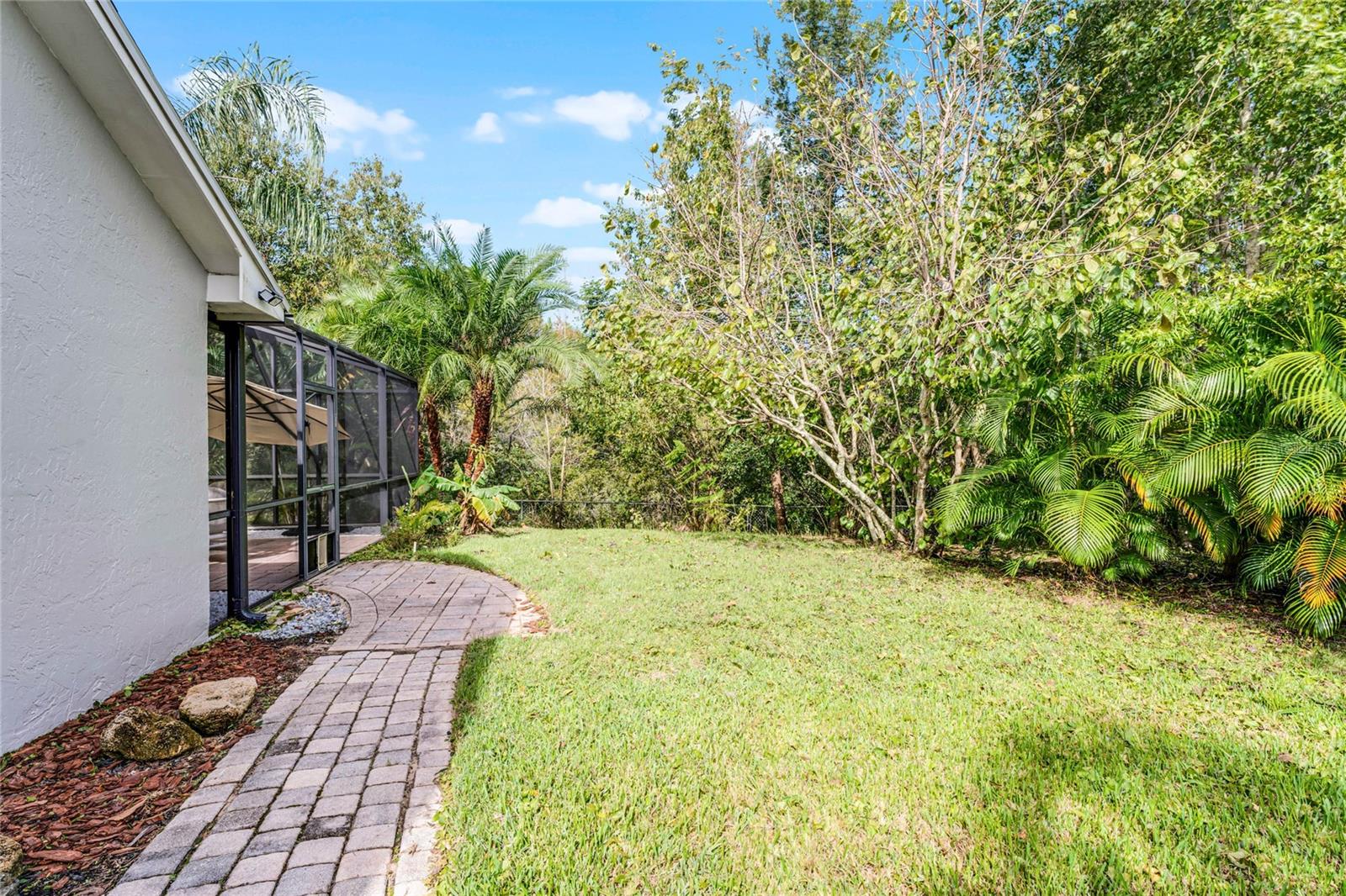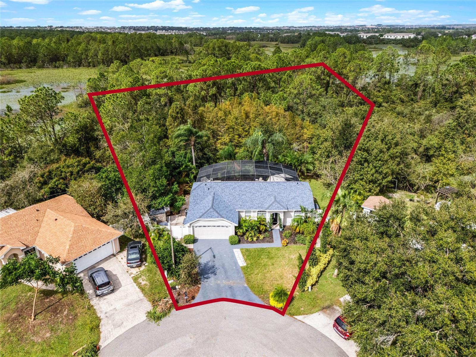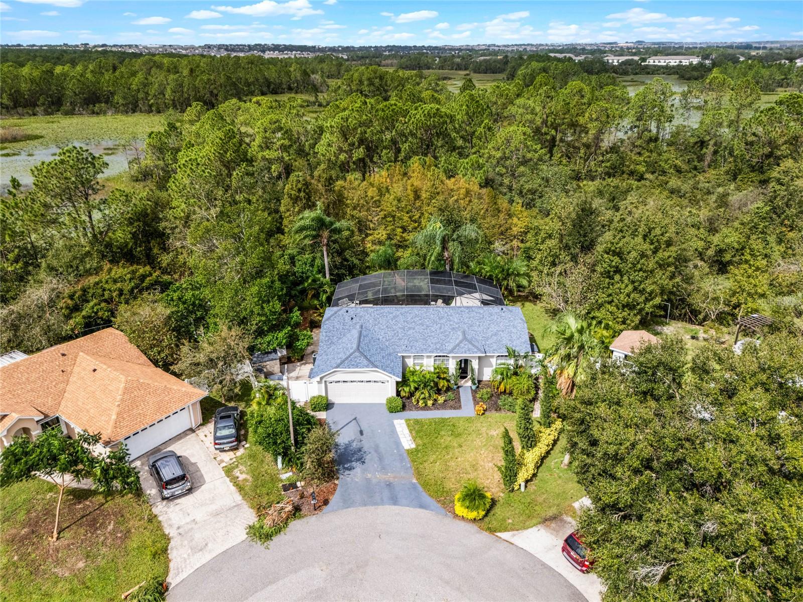 Welcome home to your tropical oasis in the heart of Champions Gate. This 3 bedroom, 2 bath pool home really is a hidden gem, situated on over 2.11 acres on a cul de sac in the Loma Linda community. As you enter the home the renovated kitchen is to your left, with self closing, pull out shelving offering plenty of storage, a breakfast nook and breakfast bar. The kitchen then opens up to the family room, offering plenty of space to sit and enjoy the spectacular views of the pool and tranquil garden beyond. Sliding glass doors and a picture window makes the space bright and airy. To the left of the home is the primary suite, with a spacious bedroom and sliding glass doors onto the lanai, newly appointed closets and a updated bathroom with vanity. To the right of the home are bedrooms 2 and 3 with a full bathroom in between, bedroom 2 is ensuite giving private access to the bathroom. All bedrooms have new carpet and the whole interior has been freshly painted. A renovated laundry room offers a clothes folding area and plenty of storage, which in turn leads to the bonus room. The 2 car garage was converted into a living/games room which offers endless opportunities, a home office, play room with access to the garden, which is all under AC. The oversized pool and screened in lanai offers so much space for entertaining and relaxing with the family. The fenced in garden is beautifully landscaped, with automatic sprinklers, fruit trees, storage sheds and even a Gnome house. The property extends over 500 feet straight back into a nature preserve. There is a raised walkway that leads you through a nature trail to a private pond and floating dock. Need a space to get away from it all ? Then look no further this truly is a rare find just minutes from Disney, the attractions, restaurants and shopping. The roof is only 3 years old and the hoa is only $23 a month !!! Call today for your own private tour, whether you are looking for full time living, a second home or to rent short/long term this home has it all.
