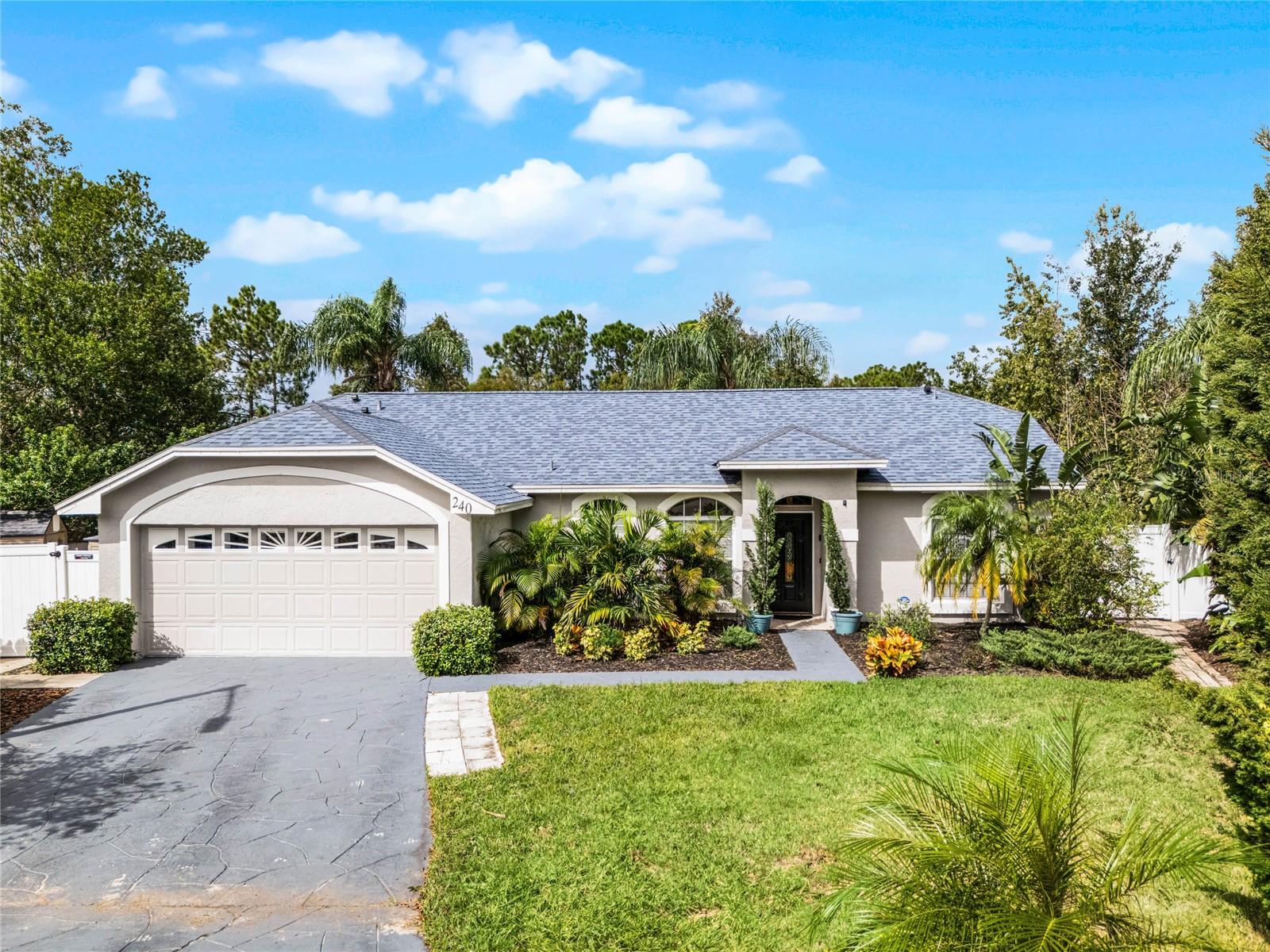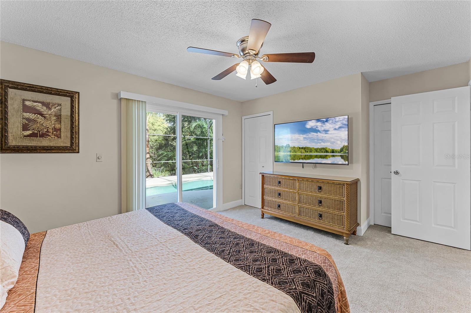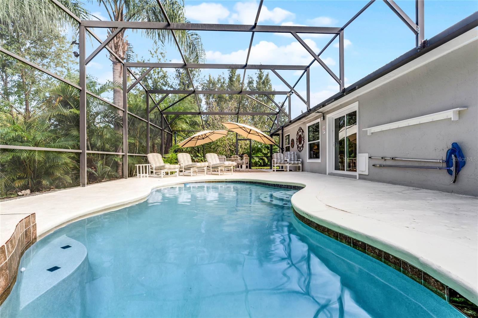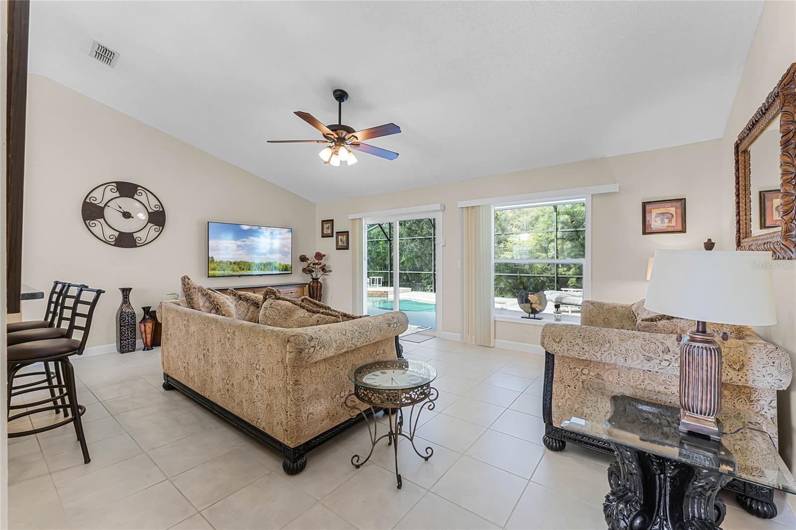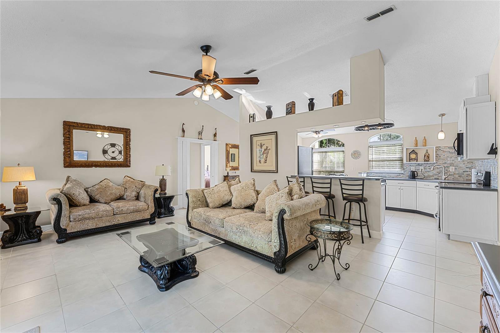 Welcome home to your tropical oasis in the heart of Champions Gate. This 3 bedroom, 2 bath pool home really is a hidden gem, situated on over 2.11 acres on a cul de sac in the Loma Linda community. As you enter the home the renovated kitchen is to your left, with self closing, pull out shelving offering plenty of storage, a breakfast nook and breakfast bar. The kitchen then opens up to the family room, offering plenty of space to sit and enjoy the spectacular views of the pool and tranquil garden beyond. Sliding glass doors and a picture window makes the space bright and airy. To the left of the home is the primary suite, with a spacious bedroom and sliding glass doors onto the lanai, newly appointed closets and a updated bathroom with vanity. To the right of the home are bedrooms 2 and 3 with a full bathroom in between, bedroom 2 is ensuite giving private access to the bathroom. All bedrooms have new carpet and the whole interior has been freshly painted. A renovated laundry room offers a clothes folding area and plenty of storage, which in turn leads to the bonus room. The 2 car garage was converted into a living/games room which offers endless opportunities, a home office, play room with access to the garden, which is all under AC. The oversized pool and screened in lanai offers so much space for entertaining and relaxing with the family. The fenced in garden is beautifully landscaped, with automatic sprinklers, fruit trees, storage sheds and even a Gnome house. The property extends over 500 feet straight back into a nature preserve. There is a raised walkway that leads you through a nature trail to a private pond and floating dock. Need a space to get away from it all ? Then look no further this truly is a rare find just minutes from Disney, the attractions, restaurants and shopping. The roof is only 3 years old and the hoa is only $23 a month !!! Call today for your own private tour, whether you are looking for full time living, a second home or to rent short/long term this home has it all.