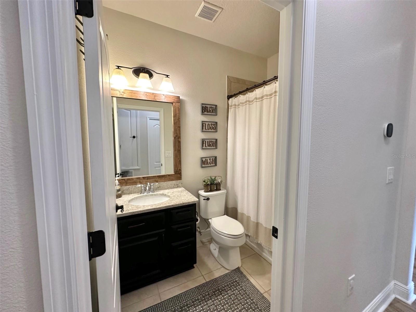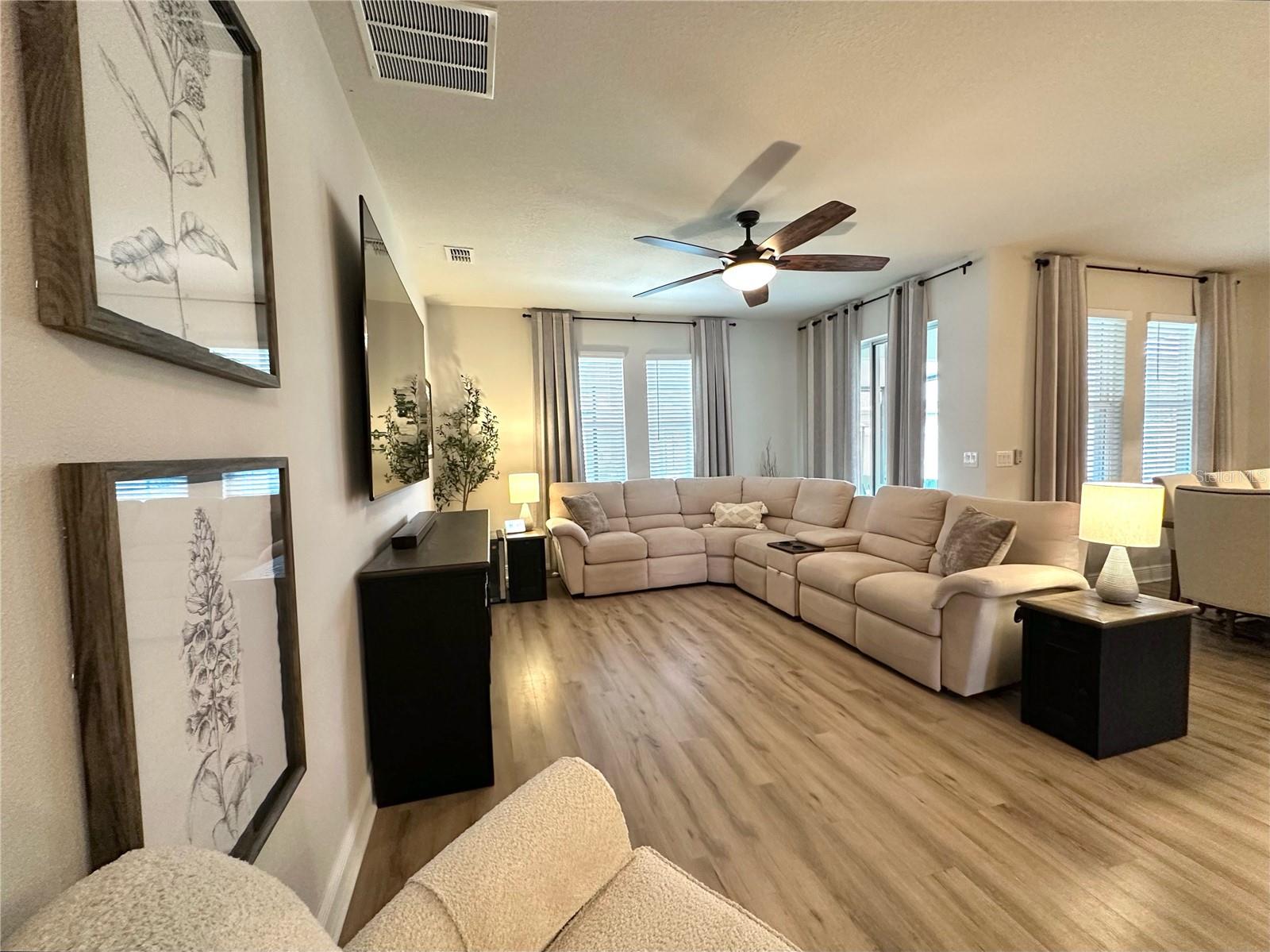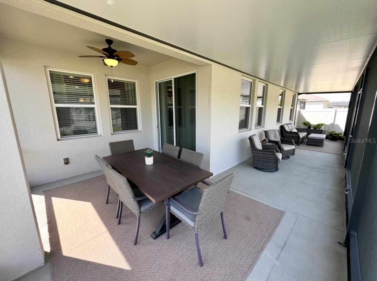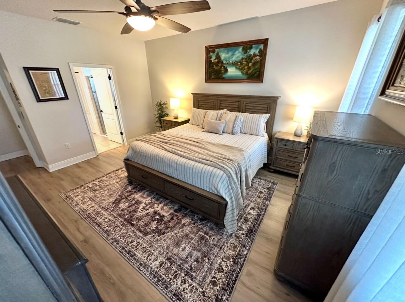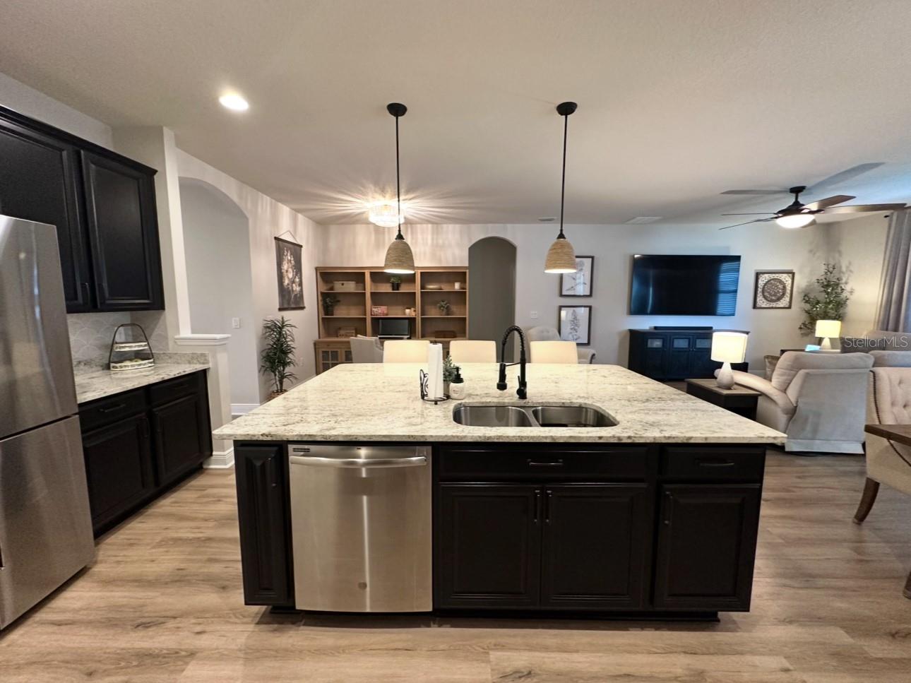 Welcome to this beautifully upgraded 4-bedroom, 3-bathroom home, offering a spacious open floor plan designed for modern living. This move-in-ready property features a range of impressive upgrades that combine style and functionality. Enjoy the energy efficiency of a water softener and solar panels, which help lower utility costs while enhancing comfort. The extended lanai is perfect for outdoor relaxation or entertaining, and the home boasts two walk-in showers and a tub-shower combo in the bathrooms for added convenience. With 9-foot ceilings throughout, the home feels open and airy, and the durable LVP flooring ensures easy maintenance. Upgraded tile in key areas adds a touch of elegance, and the fully equipped kitchen comes with essential appliances, including a fridge, washer, and dryer. Additional storage space is available in the garage with overhead racks, while the sleek epoxy garage floor ensures a clean and easy-to-maintain surface. The home also features an Ecobee thermostat, offering smart home temperature control, and residents can enjoy the nearby community pool on warm Florida days. Located just 15 minutes from Disney and 30 minutes from Universal Studios, this property offers easy access to world-renowned theme parks while still providing a peaceful retreat. The community also hosts regular food truck nights, offering residents the chance to enjoy delicious meals and socialize with neighbors. The additional home in the backyard provides excellent flexibility for multi-generational living or offers a great investment opportunity (a fence will be installed for privacy between the properties). (See MLS #G5093073 for other home being sold). Don’t miss out on this exceptional property—schedule a showing today!