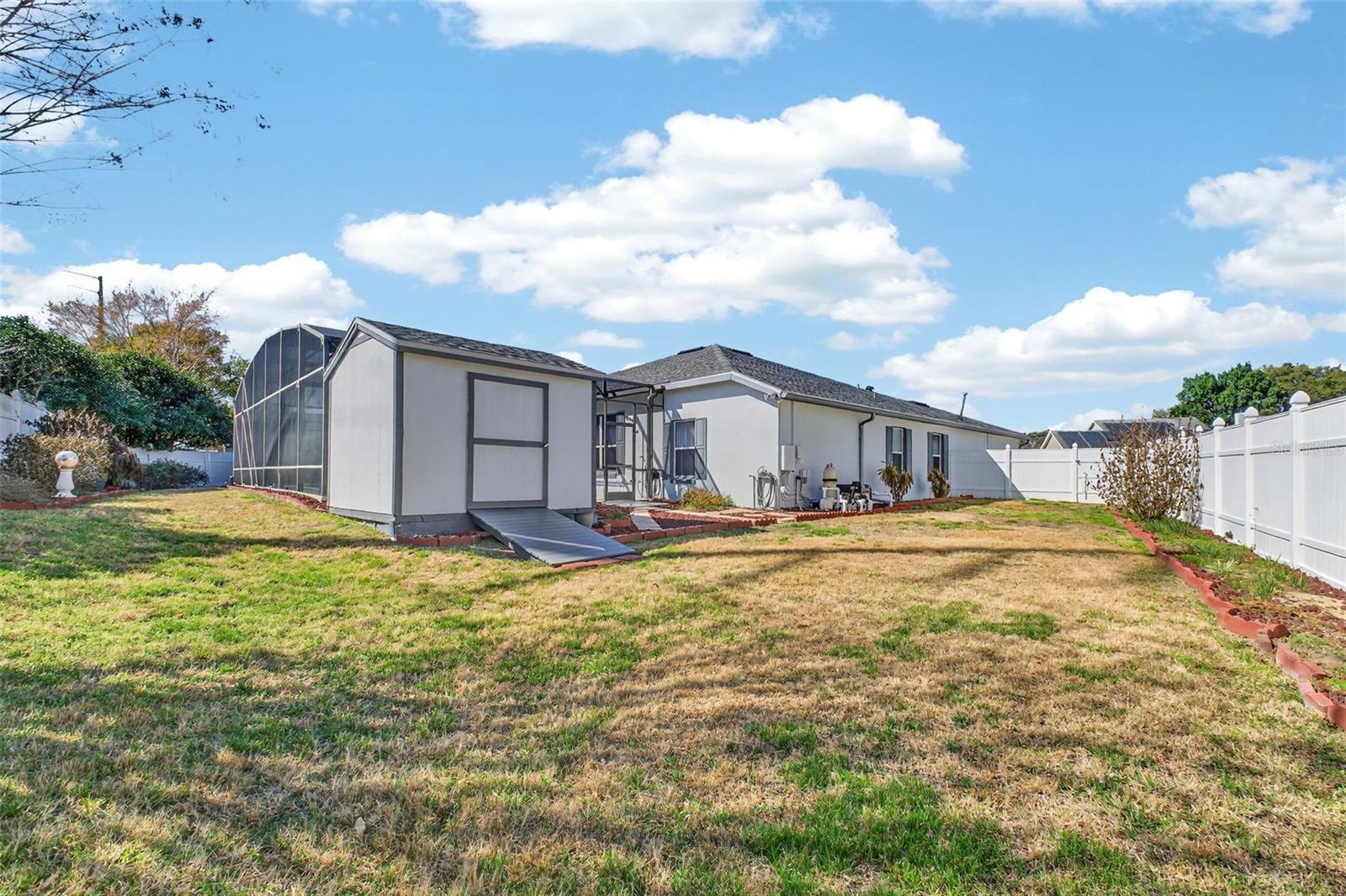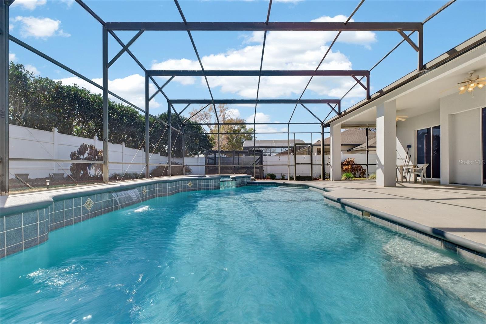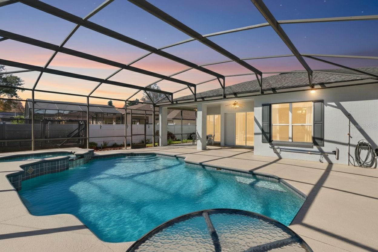 Welcome to the desirable Loma Del Sol Phase II community in Davenport. Ideally located just minutes from I-4 with easy access to Orlando and Tampa, this well-established neighborhood features a community park with gazebo and playground. This beautifully maintained, contemporary POOL home offers 2,225 sq. ft. of living space on an oversized pie-shaped lot of 0.33 acres with no rear neighbors. The property features a manicured lawn with irrigation, fully fenced backyard, and low HOA of only $300 annually. Inside, enjoy a split-bedroom floor plan with formal living and dining rooms, a spacious family room, arched doorways, and plant shelves throughout. The kitchen offers abundant cabinet space, breakfast bar, breakfast nook, built-in desk, and black stainless LG appliances (2021) with remaining warranties. Step outside to a private screened lanai with covered patio, saltwater pool with solar heater, waterfall features, and an attached spa—perfect for relaxing or entertaining. Additional highlights include a wired shed, raised garden beds, and side and rear gates. The primary suite features sliding glass doors to the lanai, walk-through closets, and a bath with double sinks, jetted tub, and separate shower. Recent updates include a new roof (Nov 2024) with 20-year warranty and completed wind mitigation inspection. Natural gas, county water, septic, and fiber internet available.