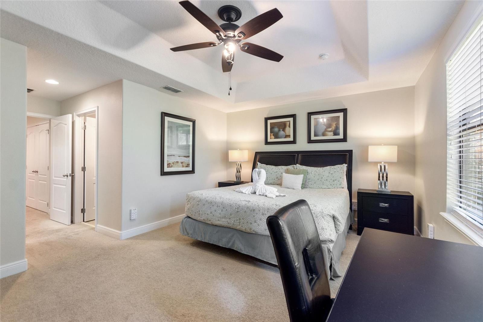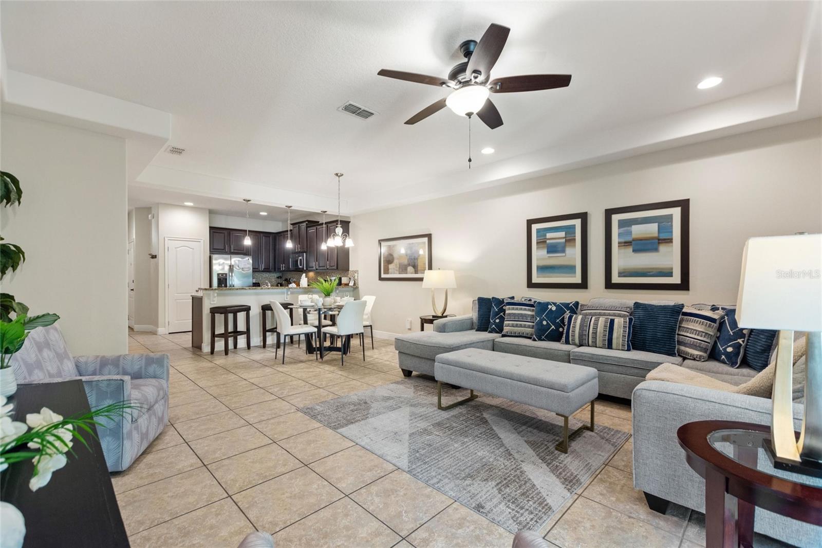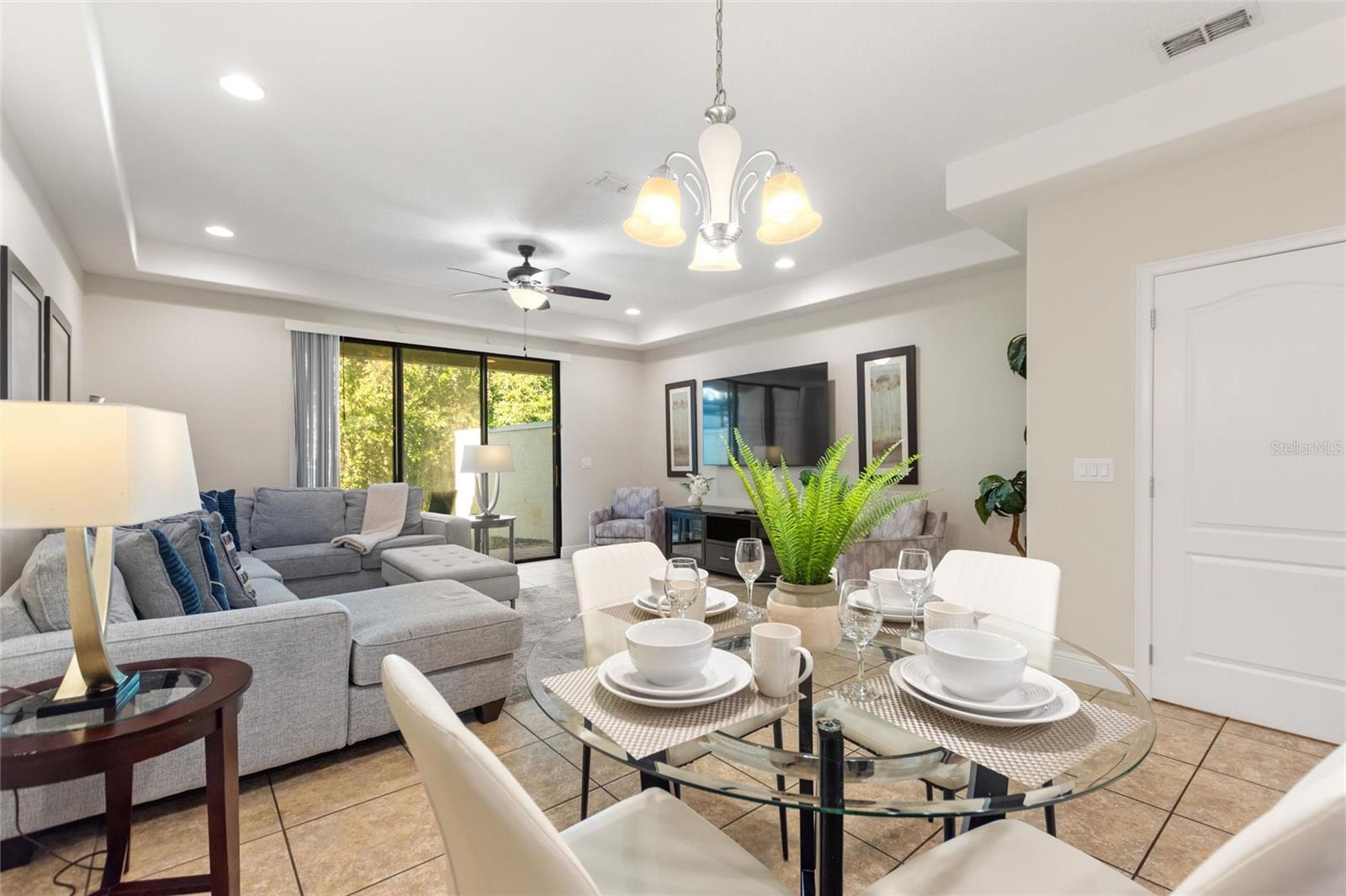 FULLY FURNISHED TURNKEY Townhome located right in the heart of Championsgate! This 3/2 townhome has UPDATED FURNISHINGS, high-end features throughout, and no rear neighbors! Outstanding short-term rental investment property! The Fountains at Championsgate is a quaint GATED community with a BEAUTIFUL COMMUNITY POOL and is easy walking distance to Championsgate shopping and restaurants. When you enter the home you’re greeted by a lovely open-concept first level with tile flooring throughout and immediate views to the beautiful tree line in the back yard. The open kitchen is perfect for guests and entertaining, overlooking the spacious dining and living area and easy access to the back patio. Granite countertops, high-end cabinetry, a breakfast bar, and stainless-steel appliances put the finishing touch on this outstanding kitchen and great room. Head upstairs to find a conveniently located laundry closet, master suite, and two guest bedrooms. The master suite offers a large bathroom with an oversized dual vanity, walk-in closet, and a beautiful view. Two other guest bedrooms and a guest bathroom are located upstairs, one bedroom that boasts a high vaulted ceiling with a very airy feel. This is the townhome you’ve been waiting for, schedule your private showing today!