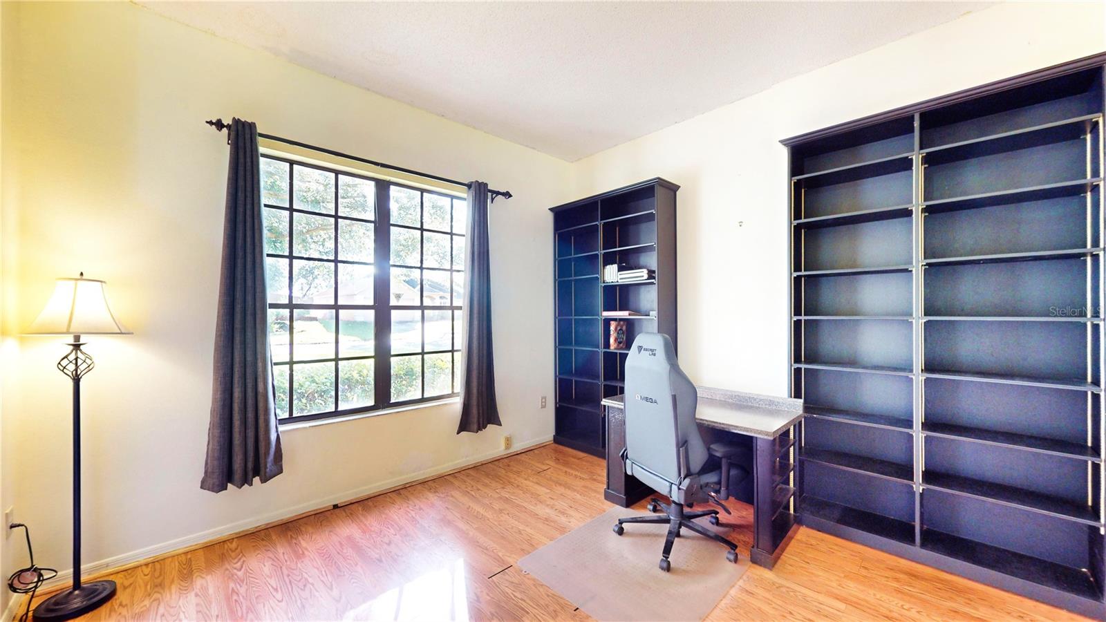 Stop the search, you have just found a wonderful property to consider. Upon arrival, you will notice the outstanding curb appeal featuring spectacular landscaping. Following the sidewalk through the front door, you will notice the formal dining room. On your left is an office equipped with bookshelves. Proceeding through the foyer, you will enter the spacious living area, and to the left, you will find the large primary suite with custom his-and-hers closets offering plenty of storage. It is worth noting that the primary bathroom has a large soaking tub with a matching double vanity, as well as an enclosed shower. Exiting the primary suite, straight ahead you will find the eat-in area with large bay windows that overlook your backyard. The kitchen is large and equipped with ample counter space, as well as lots of cabinet storage. The kitchen also features a convenient eat-at counter/bar. Guest rooms one and two both feature generous closet space, planter shelves, and custom inlaid bookshelves. You will appreciate the indoor laundry room—perfect for escaping the Florida heat while doing your chores. Finally, the enclosed garage could be an excellent game or bonus room. The seller is eager to close this chapter of life and has strategically priced the home to sell. Do not delay—book your showing today!